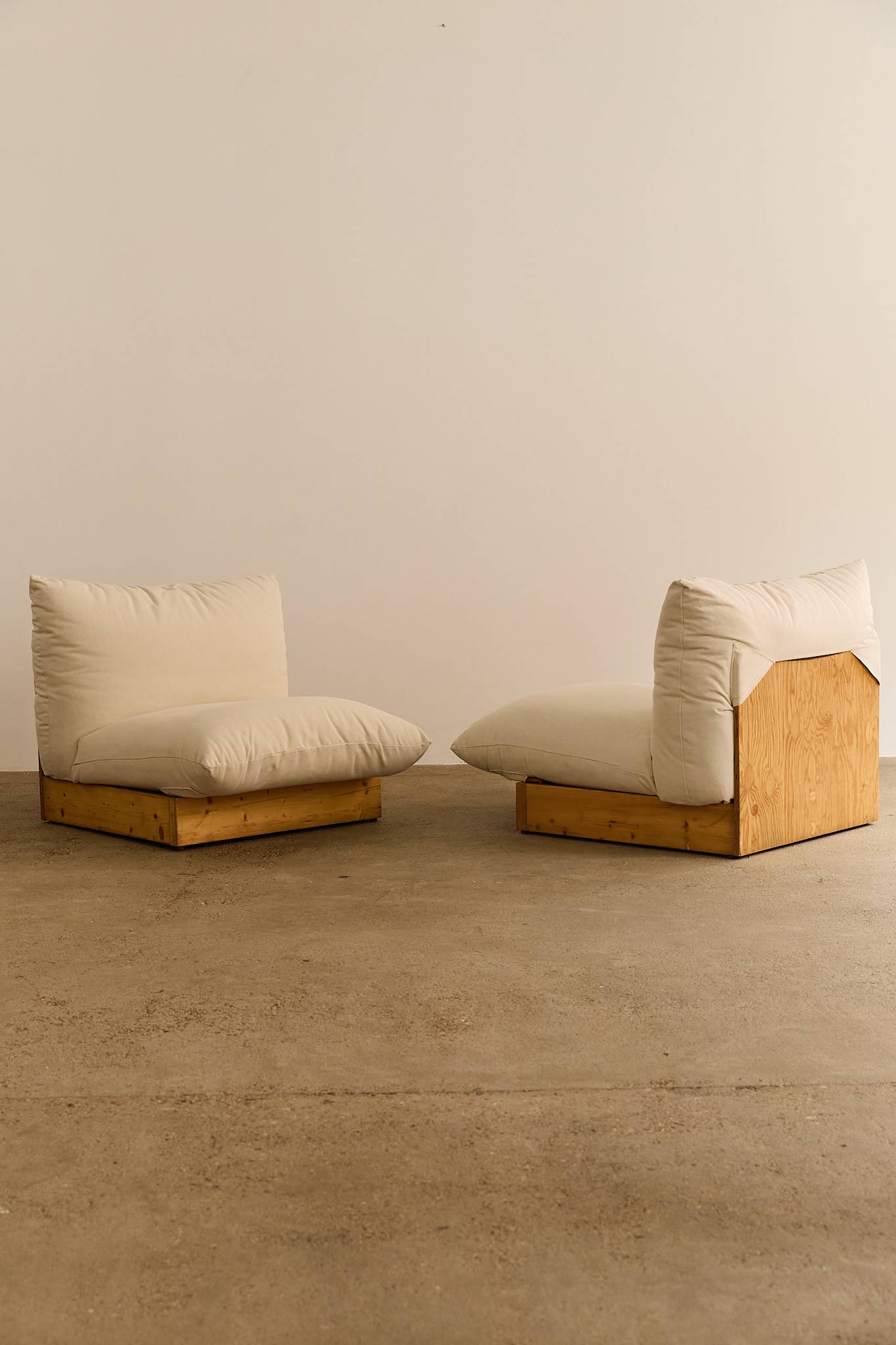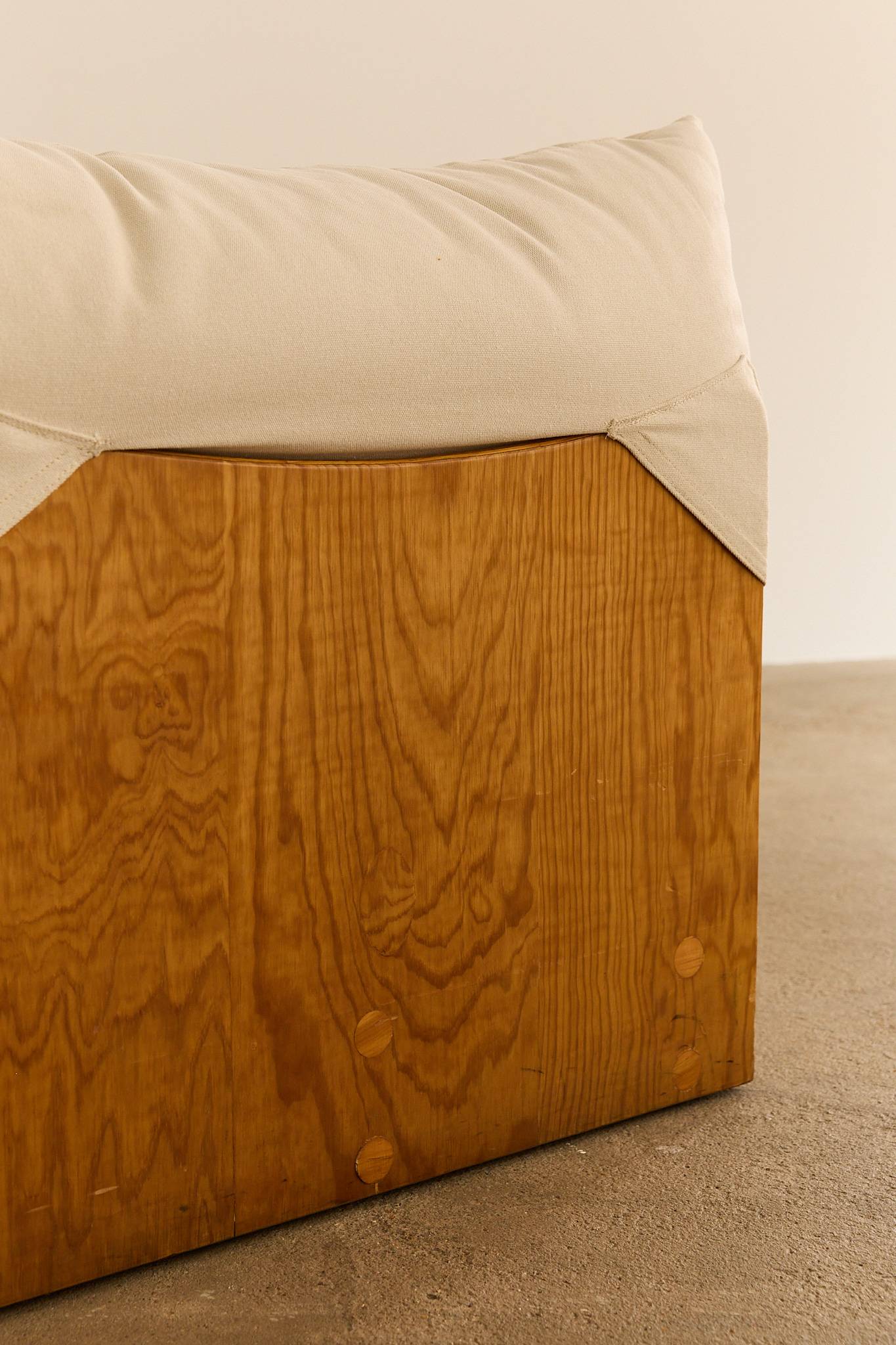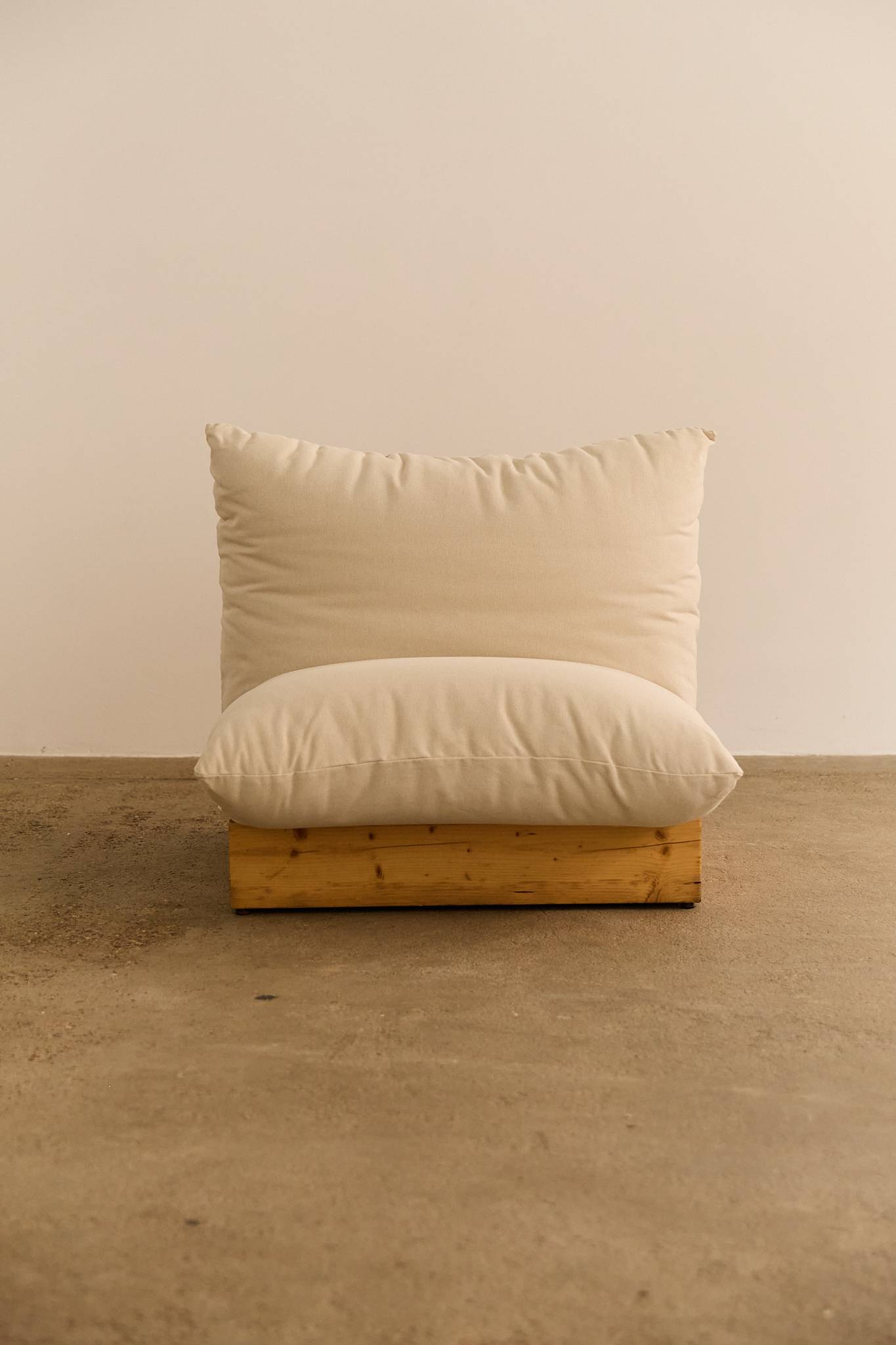 A generous five-seat Italian modular sofa resting on solid pine bases, newly reupholstered in natural cotton fabric. The design emphasises comfort with oversized, cloud-like cushions that invite relaxation while maintaining a clean, architectural profile. Each section can be arranged together or used individually as armchairs. Vat is added on top as it’s an imported item.