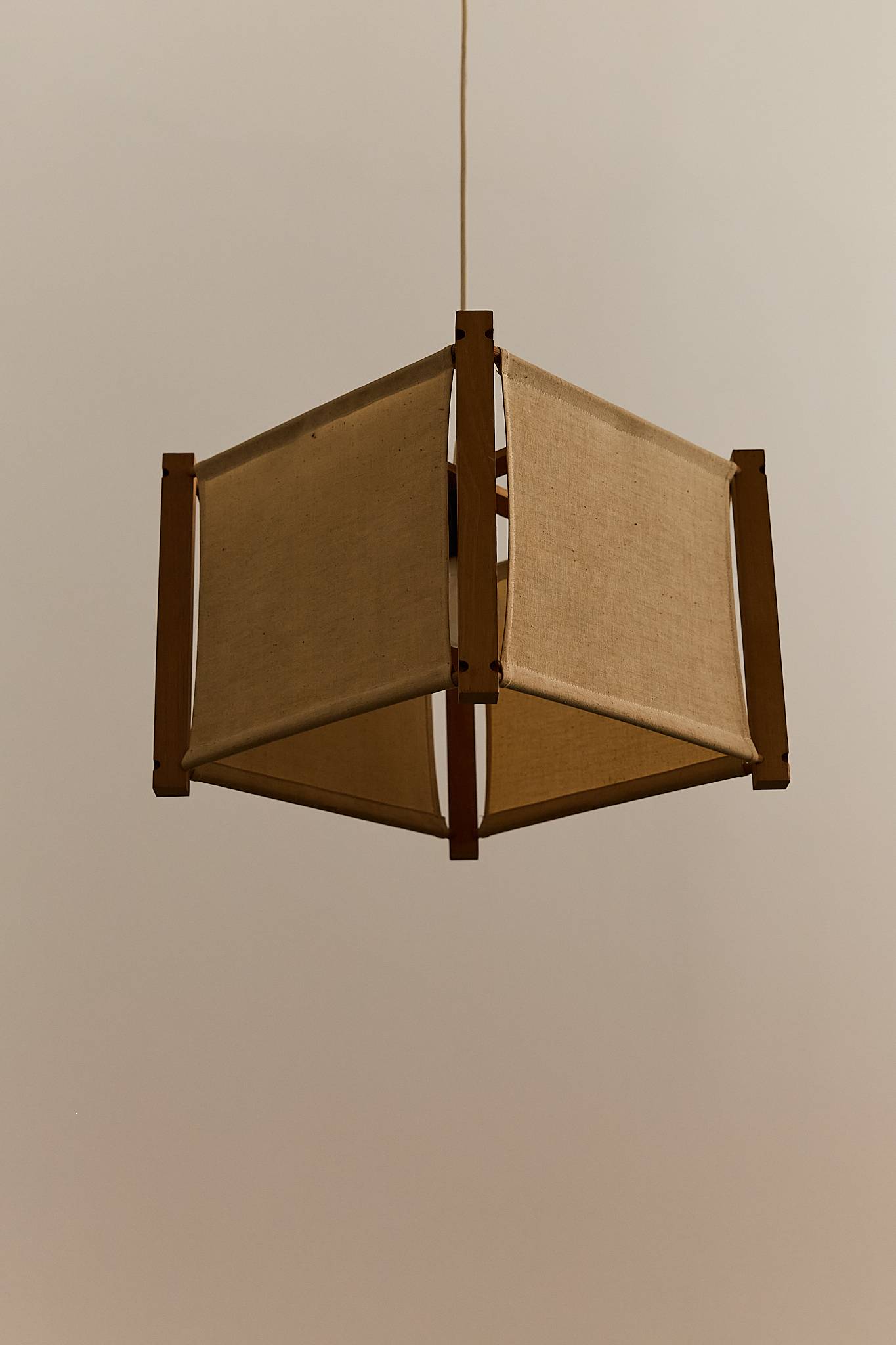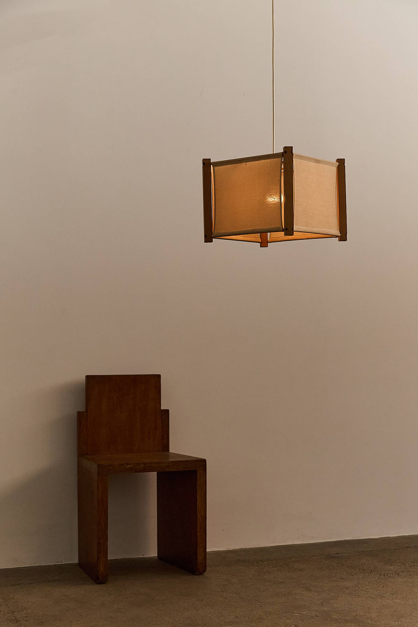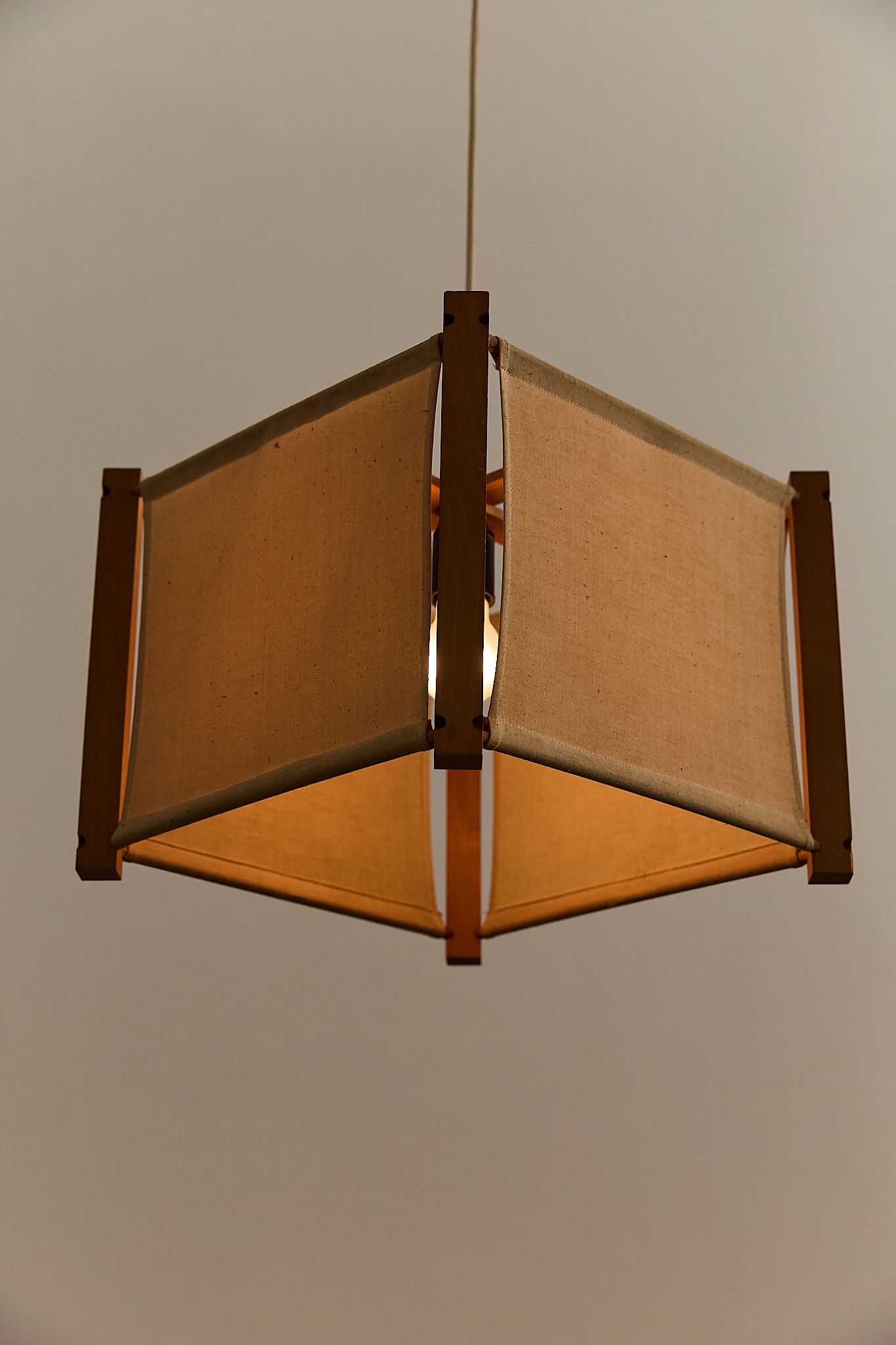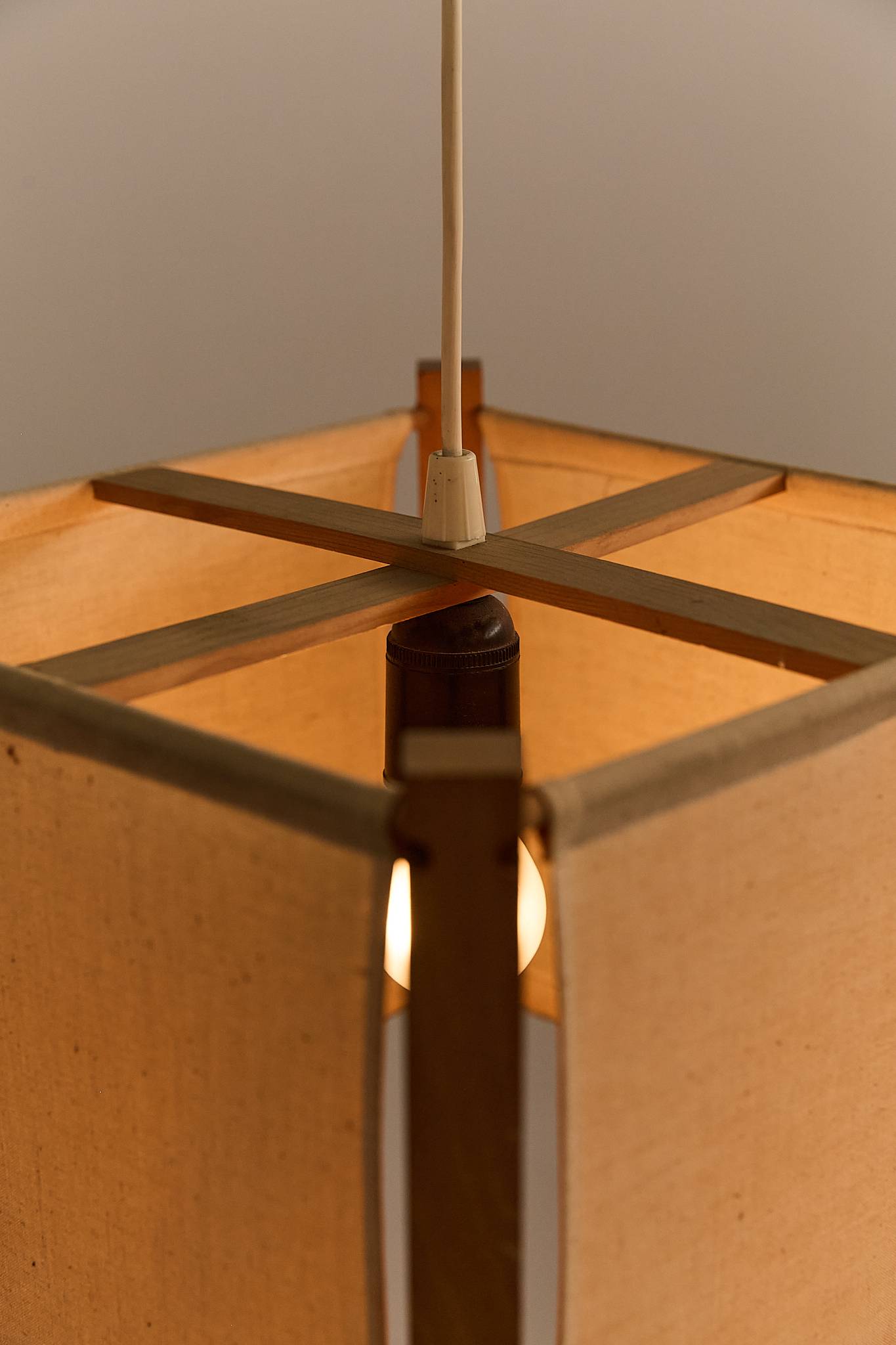 A modernist pendant light from 1970s Italy, featuring a geometric wooden frame with natural canvas panels as shades. Its open, architectural construction diffuses a warm, ambient glow while showcasing beautiful material contrast. The balanced proportions and earthy palette evoke a subtle Japanese influence, paired with Italian modernist clarity.