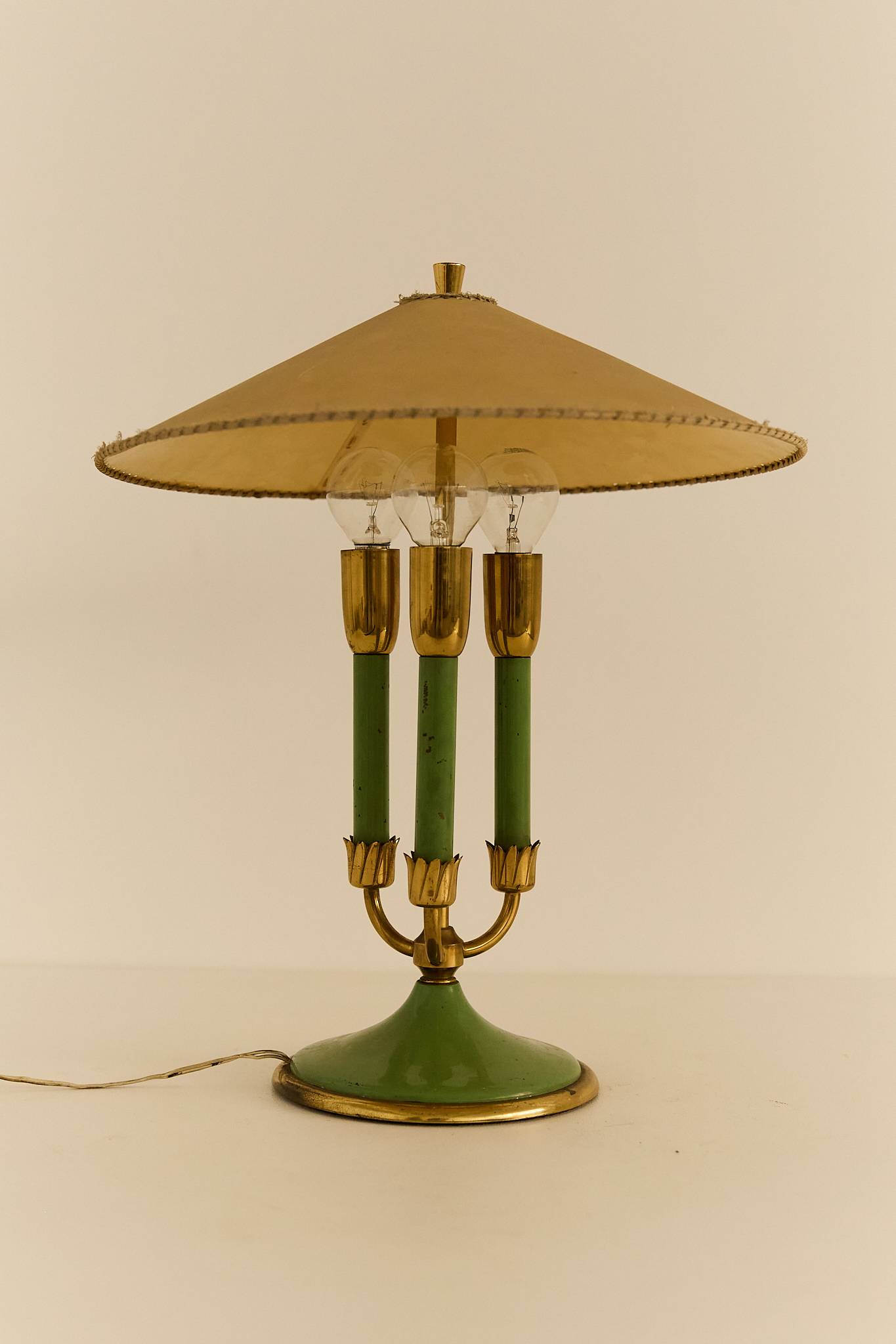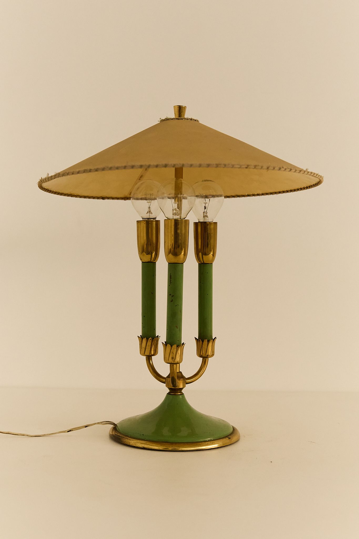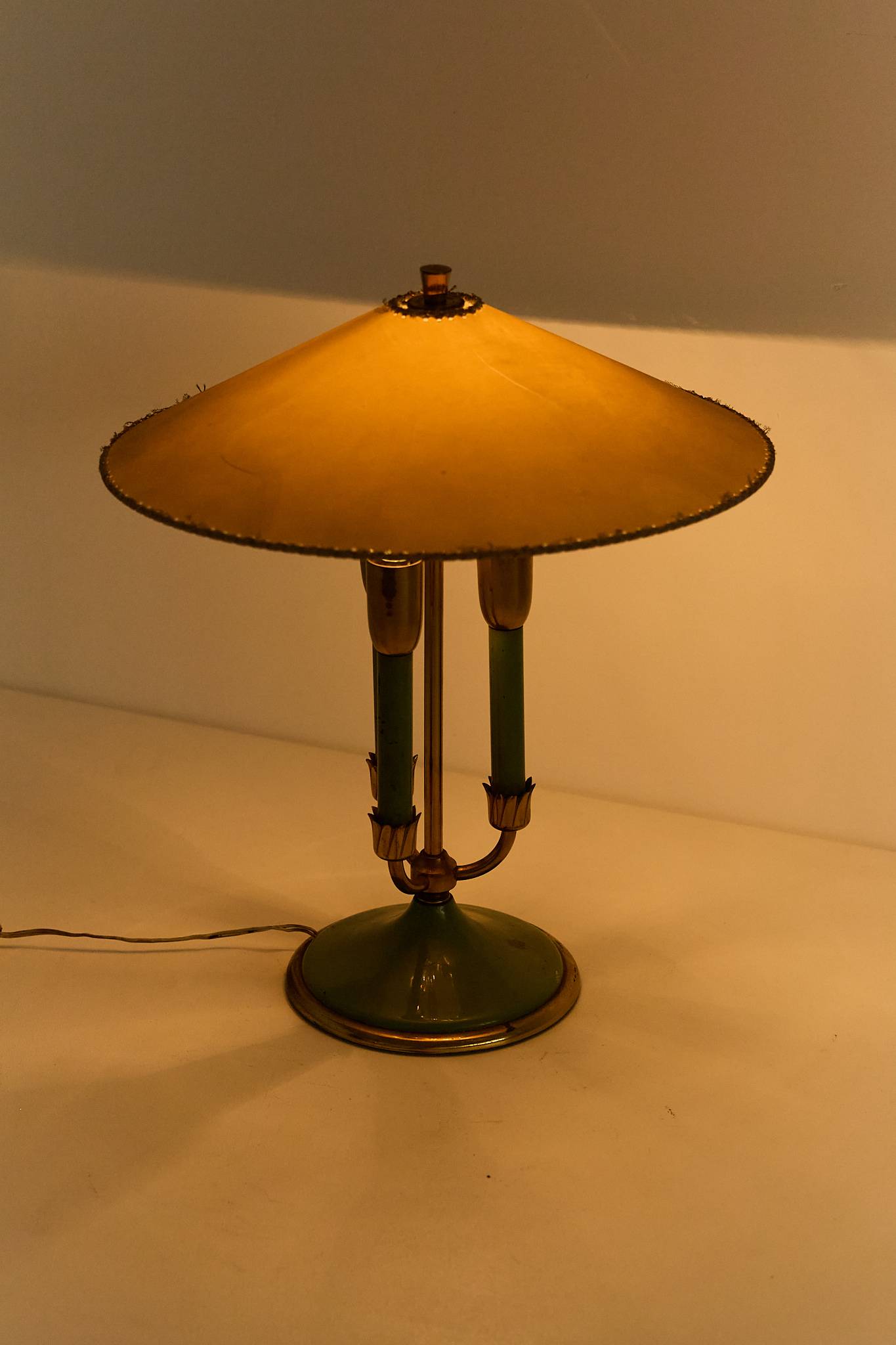 Elegant table lamp with painted metal structure, fabric shade, and refined brass details. Retains its original lampshade, which shows light wear consistent with age.