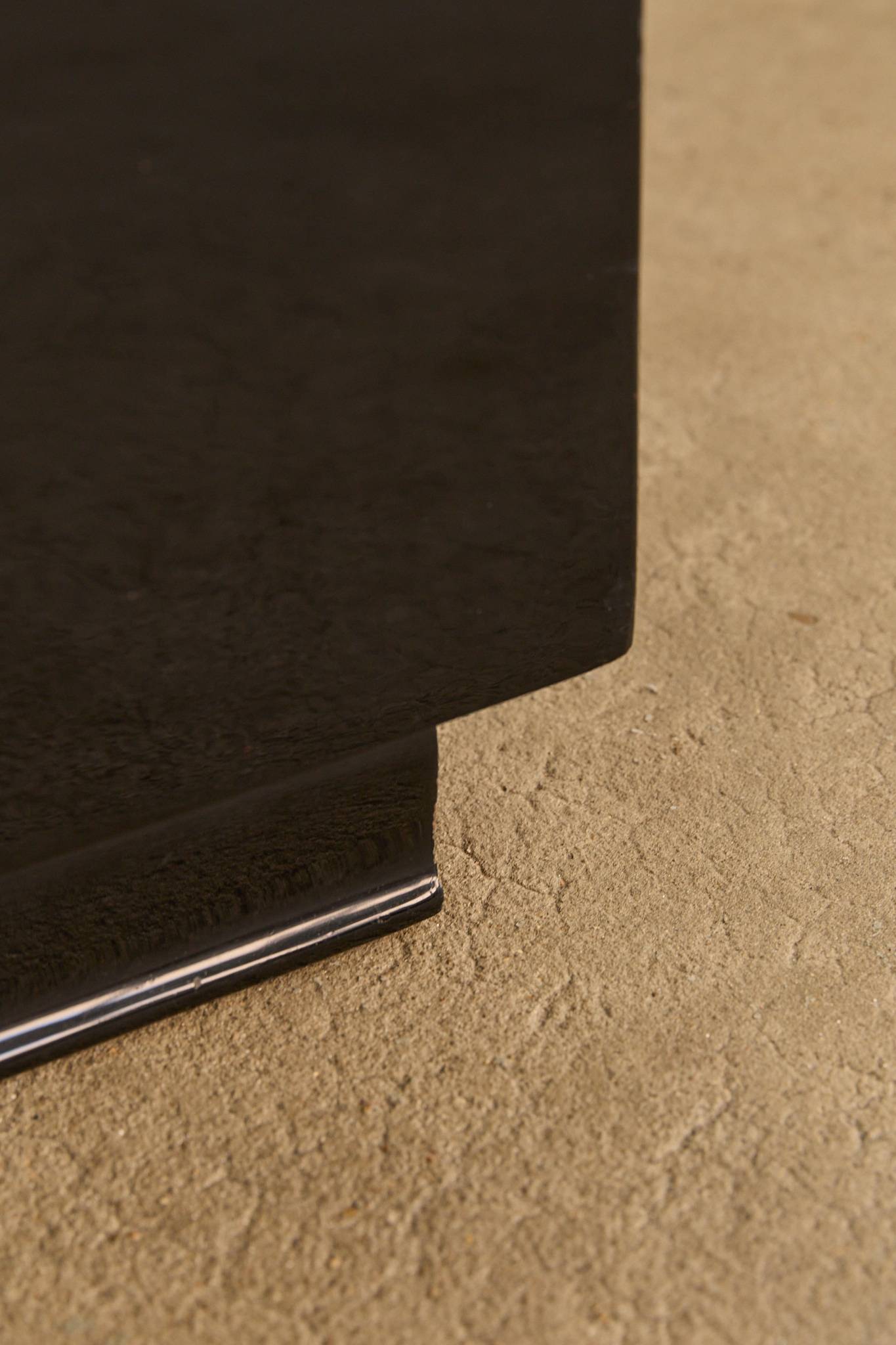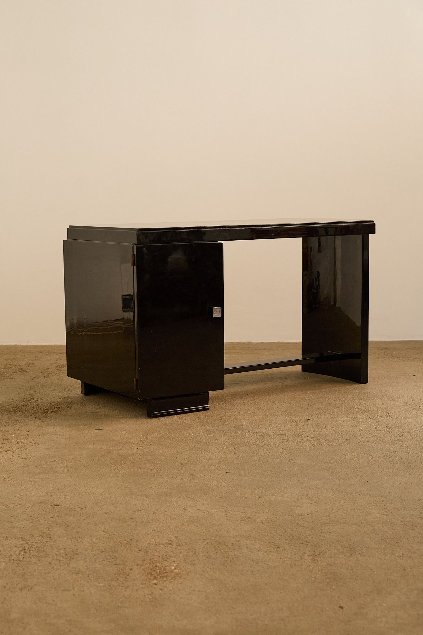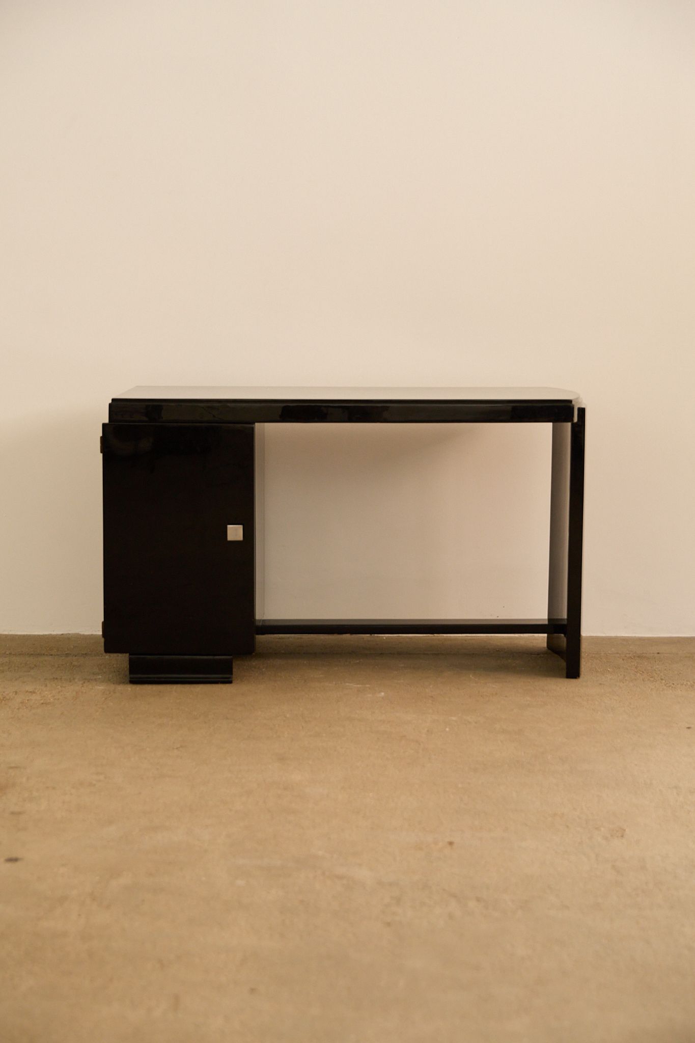 Elegant Modernist desk in black lacquered wood with a streamlined silhouette. The rectangular top is supported by a rounded end panel on one side and a block cabinet with square metal pull on the other, housing both a drawer and interior shelving. The glossy lacquer finish enhances its geometric clarity, while the combination of straight lines and soft curves reflects the sophistication of 1930-40s French design.