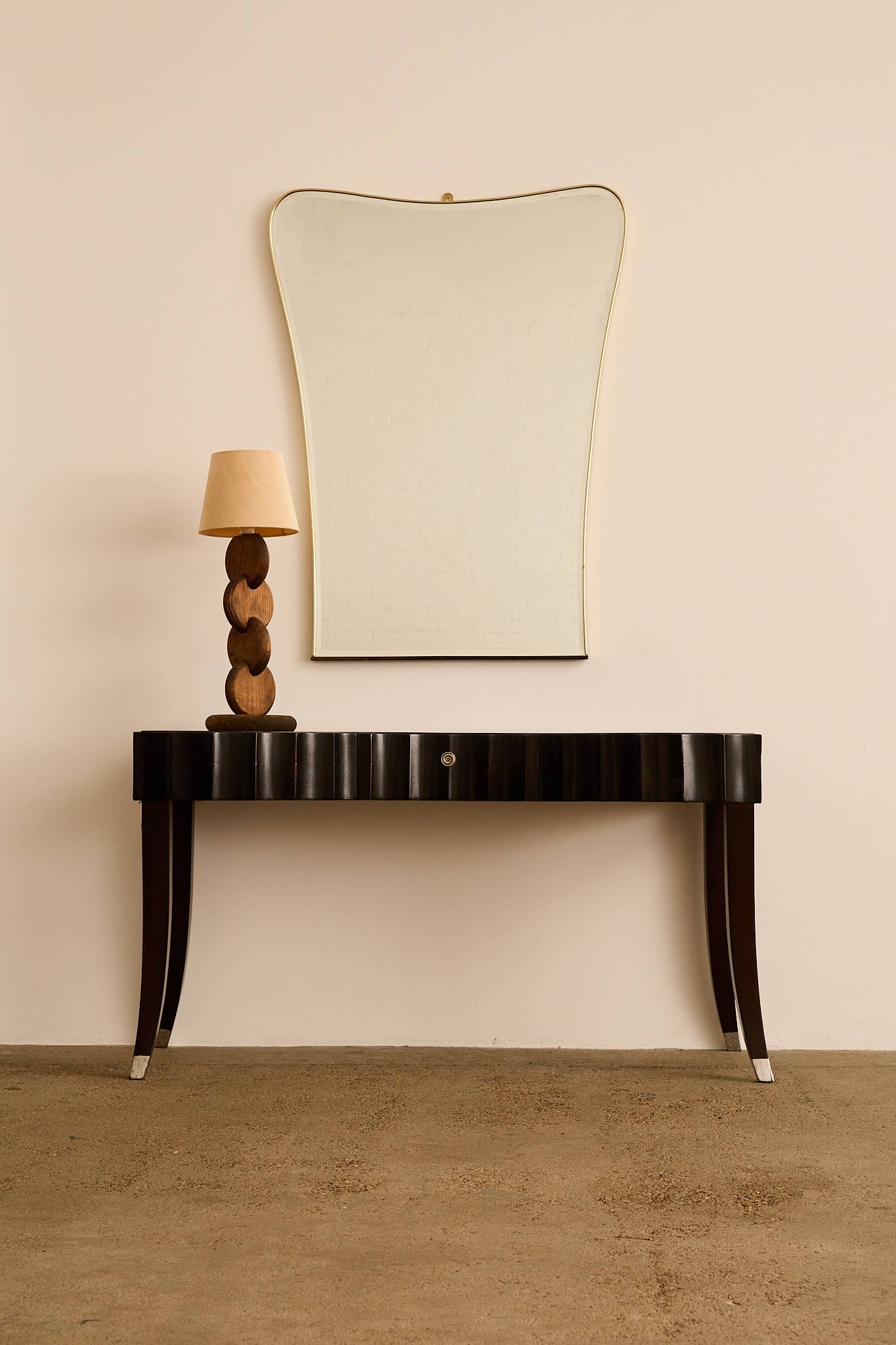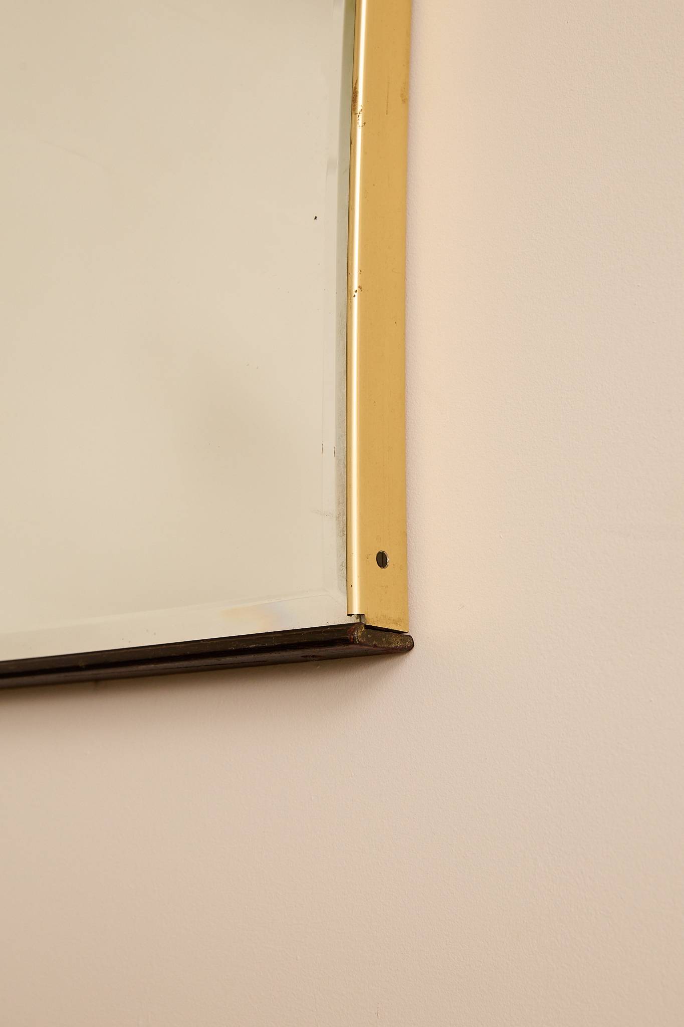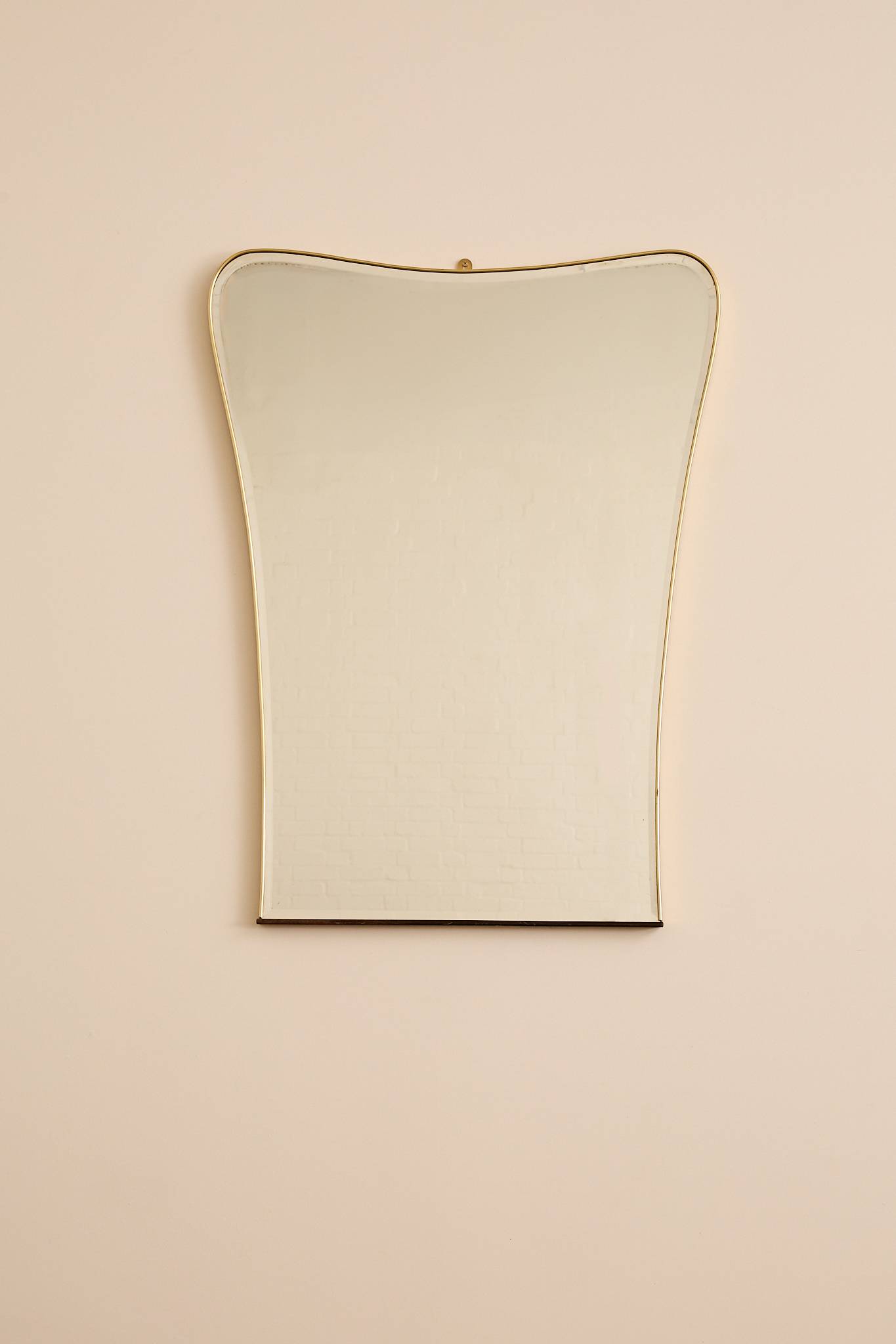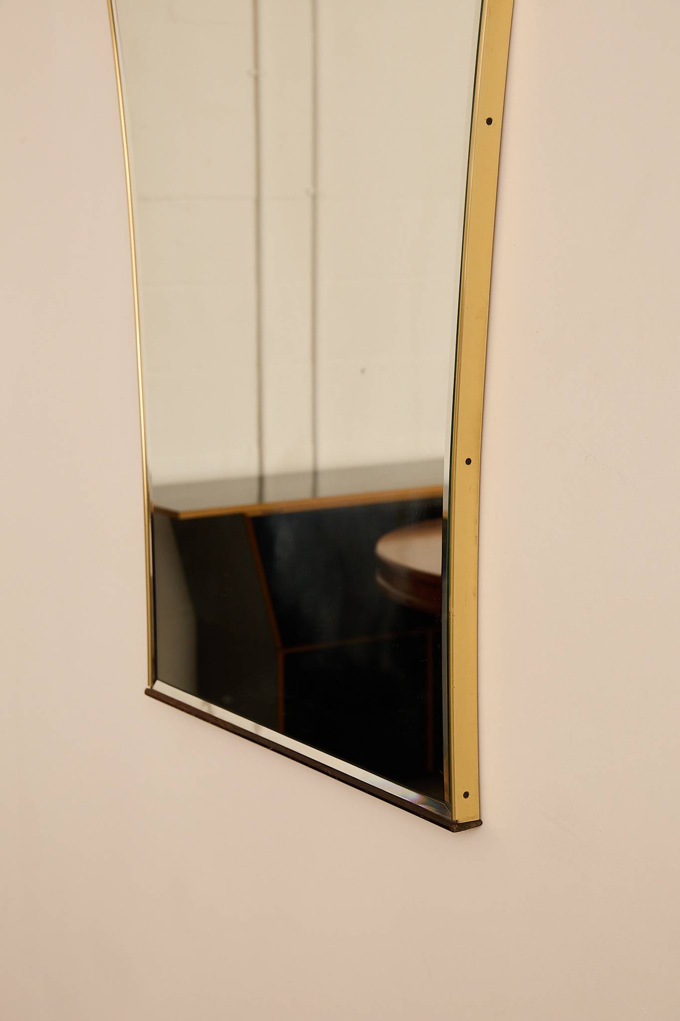 Large Italian wall mirror with a gently flared silhouette, framed in brass and finished with a dark wooden base rail. Subtle patina to the metal highlights its vintage character.