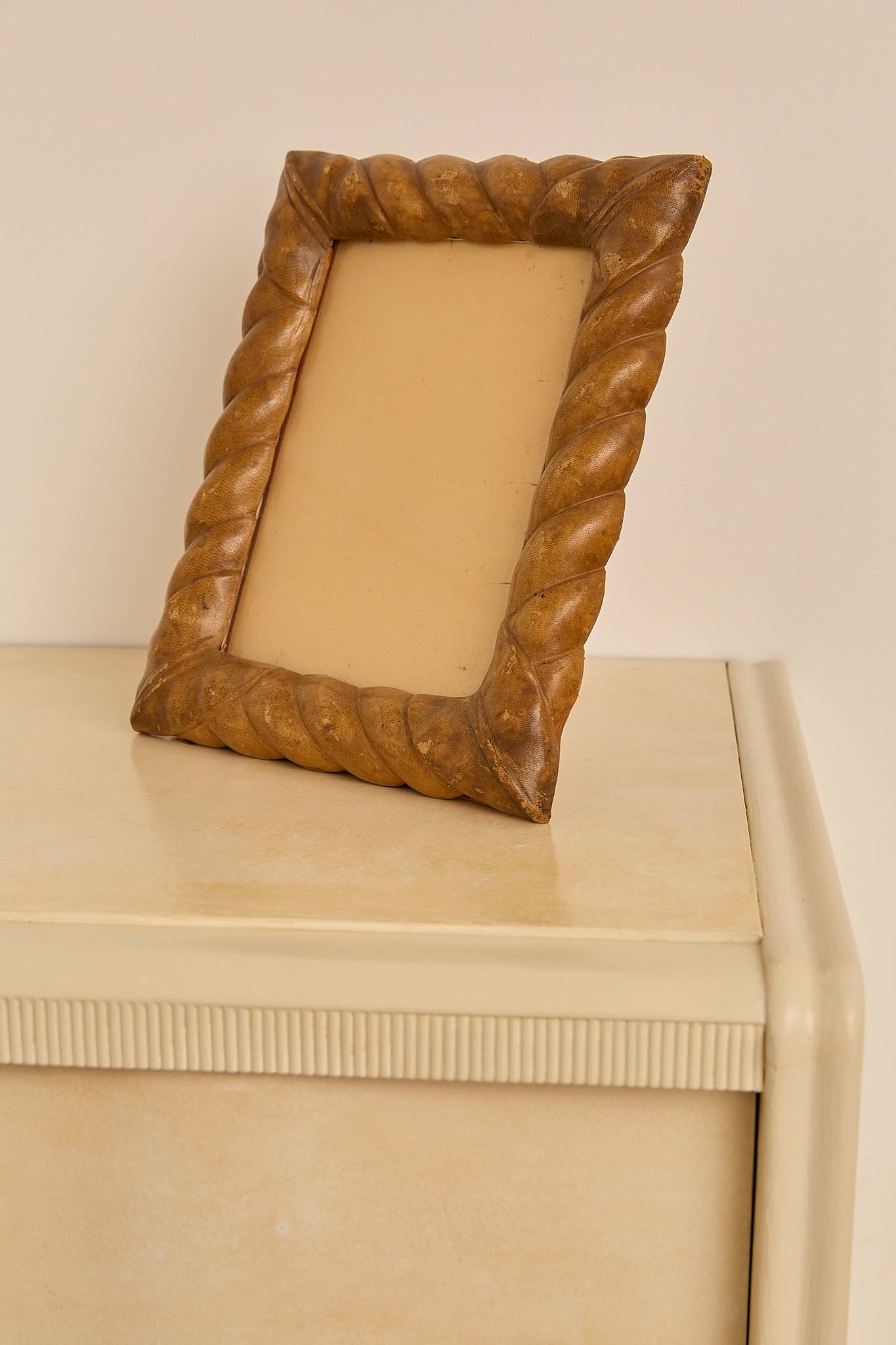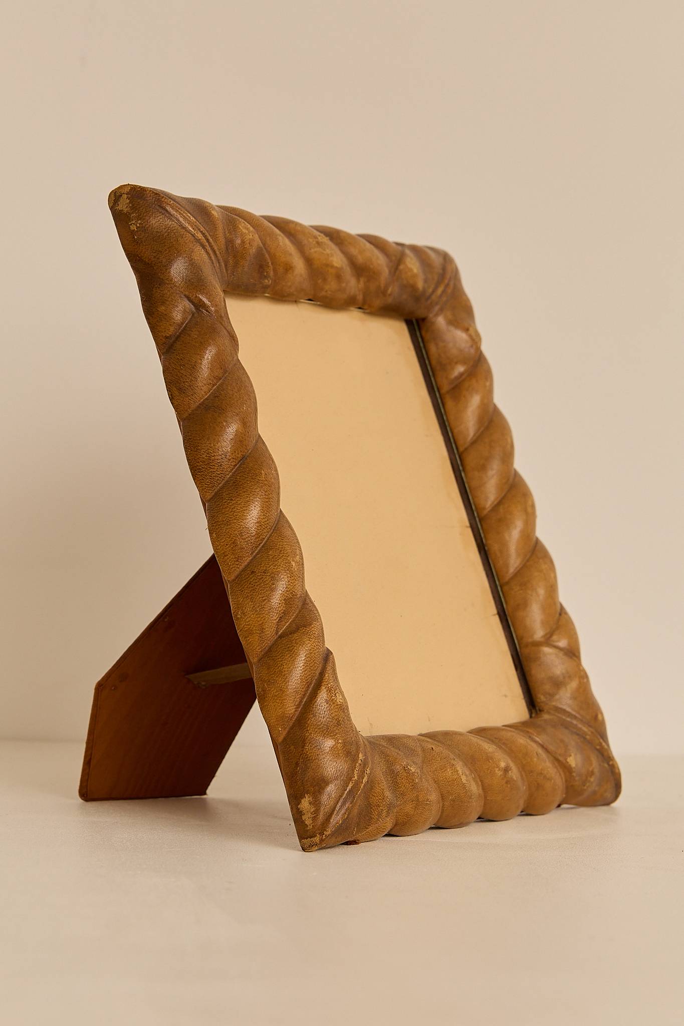 Handcrafted Italian picture frame from the 1970s, wrapped in richly patinated leather. The thick, twisted border adds sculptural texture and warmth, showcasing subtle wear that enhances its vintage character. A timeless decorative accent for desk or shelf display.