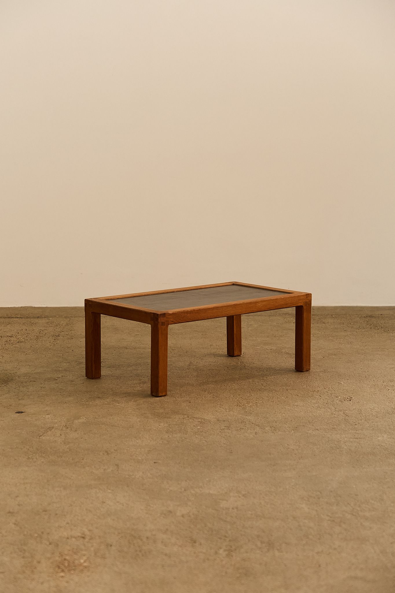 A low rectangular coffee table attributed to Pierre Chapo, crafted in solid oak with exposed mortise and tenon joints. The black leather inset top contrasts elegantly with the natural wood frame, highlighting Chapo’s architectural clarity and craftsmanship.