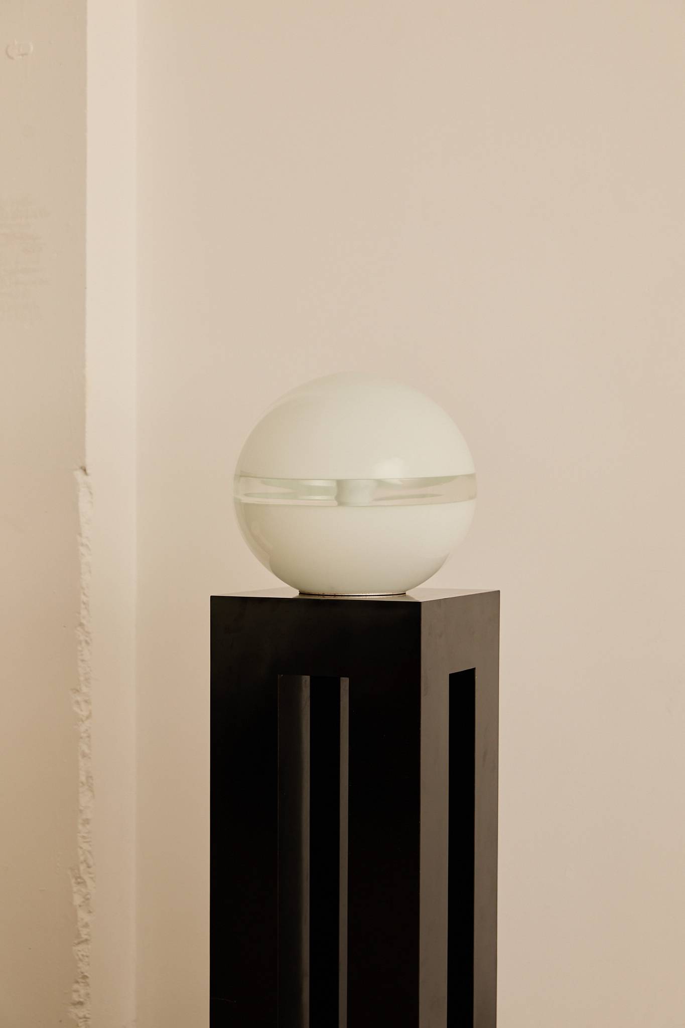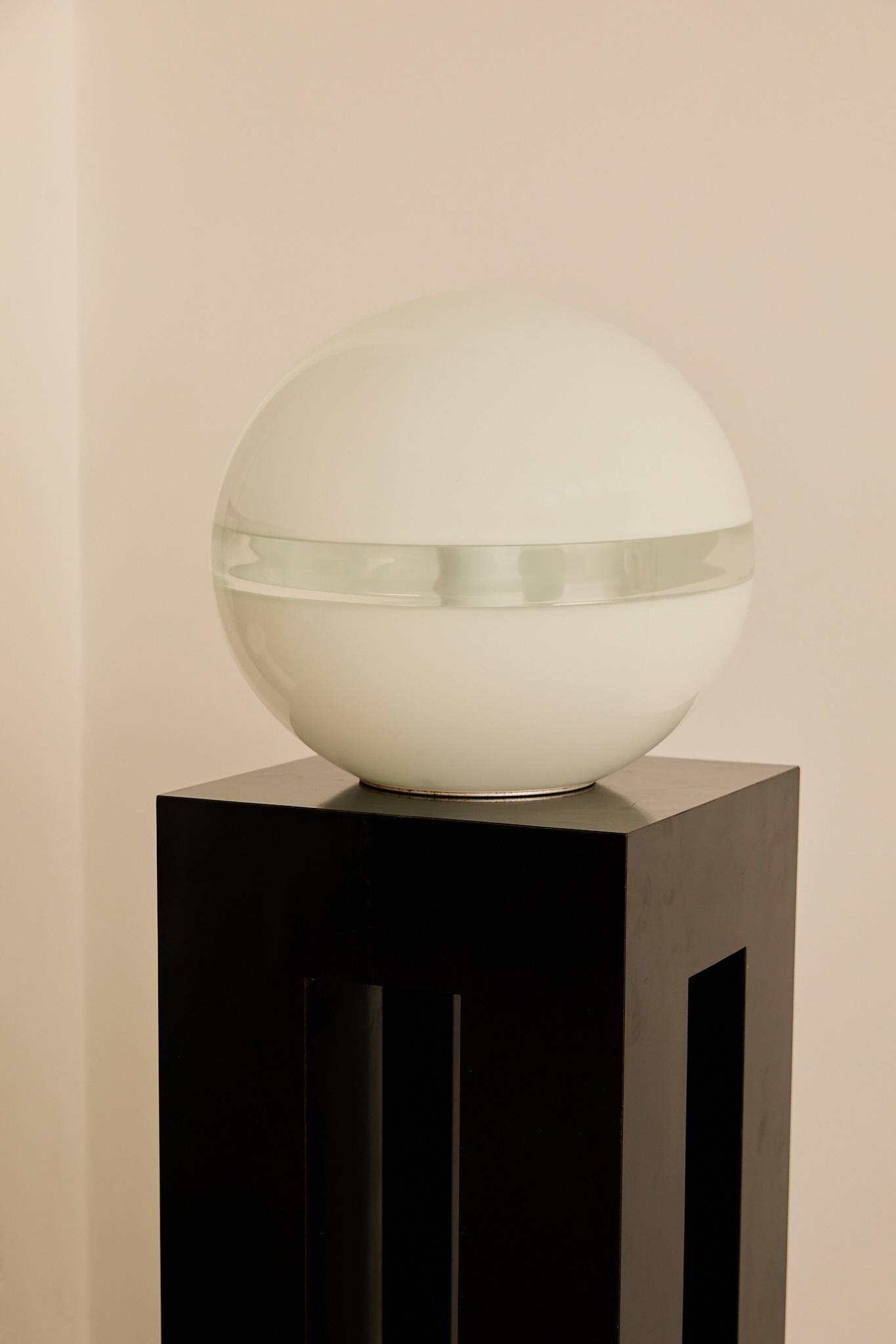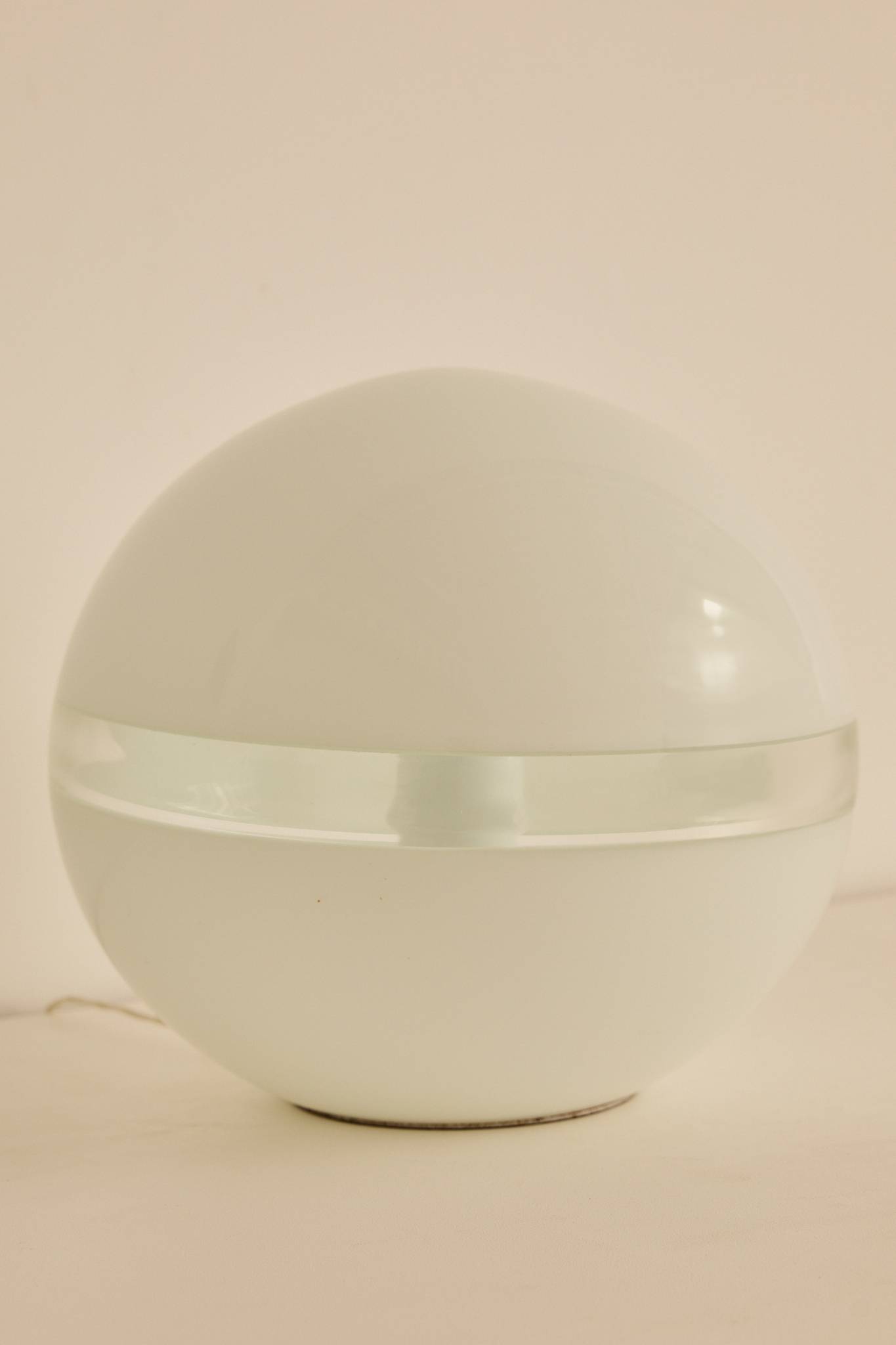 Table lamp model LT 231 in white, designed by Carlo Nason and produced in the 1970s by A.V. Mazzega (Murano). The lamp is made of white Murano glass and features a clear crystal band. This model was produced in two sizes; this is the larger LT 231 version, with a 40 cm diameter. 2 available. Price is for one.