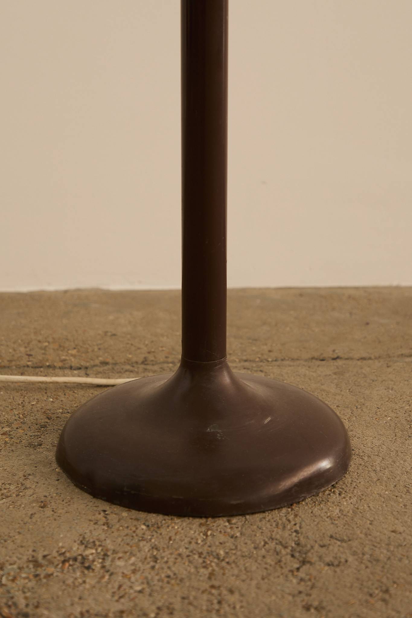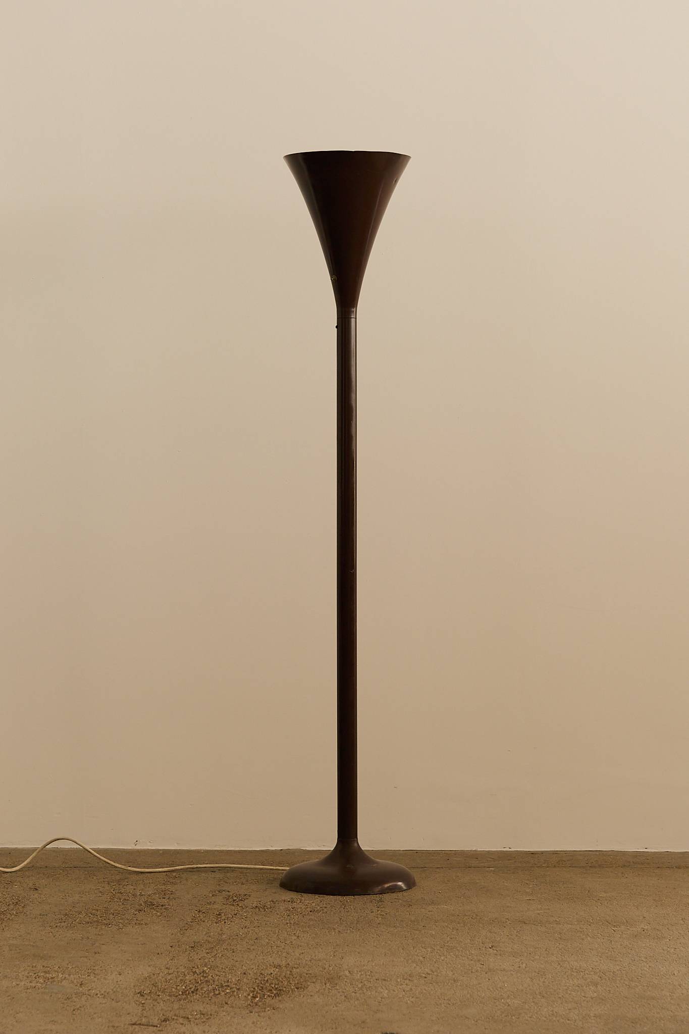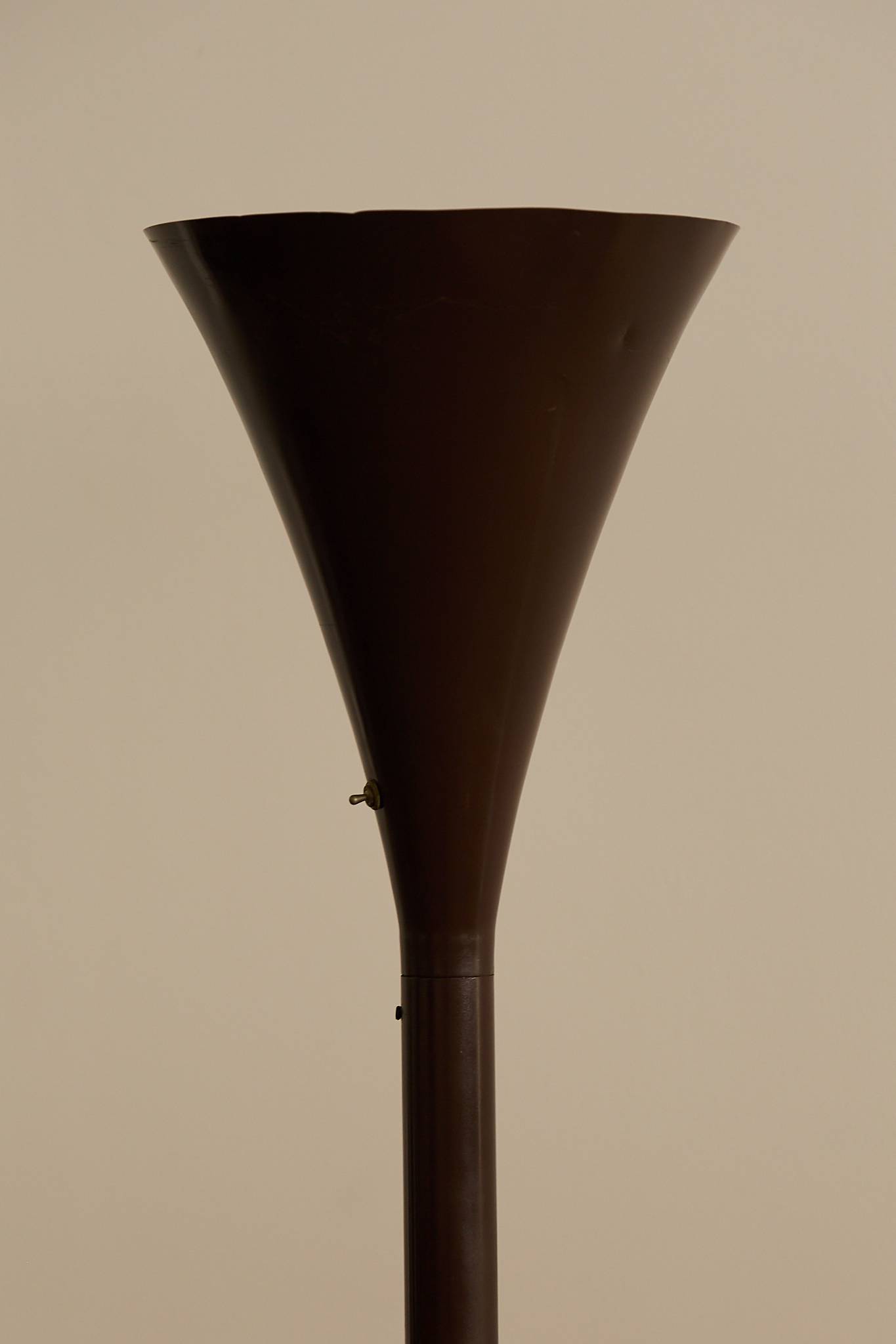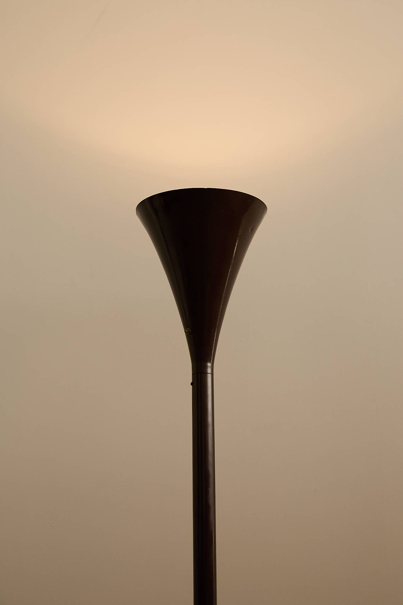 Italian floor lamp featuring a brown metal finish and a simple, upward-facing design with a built-in switch on the shade.