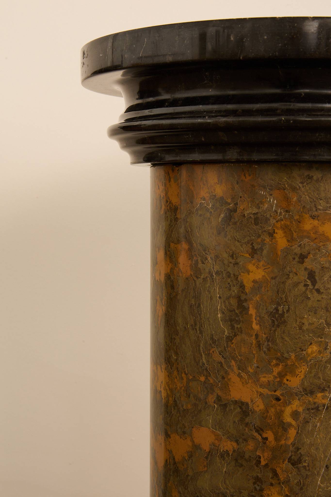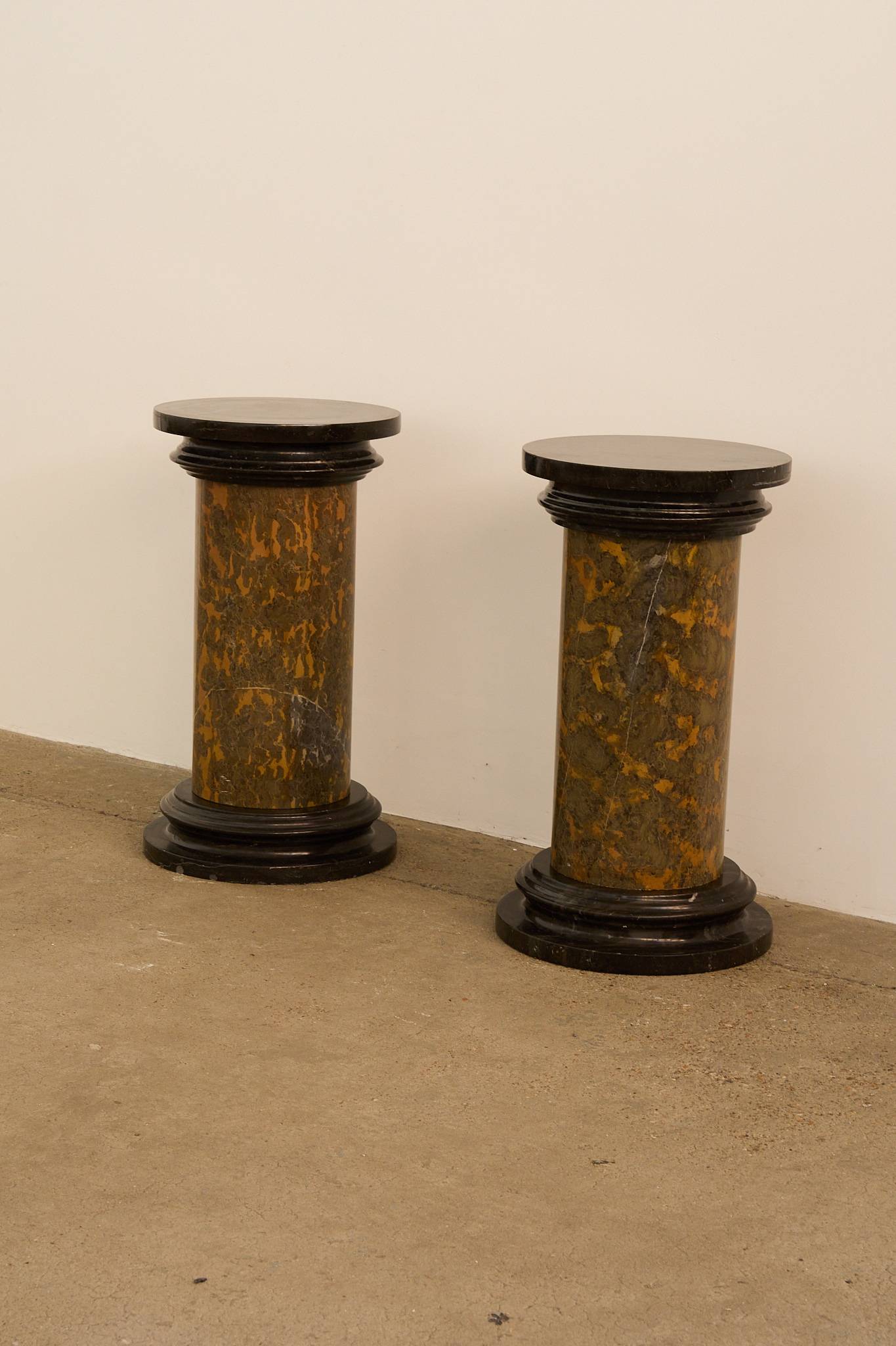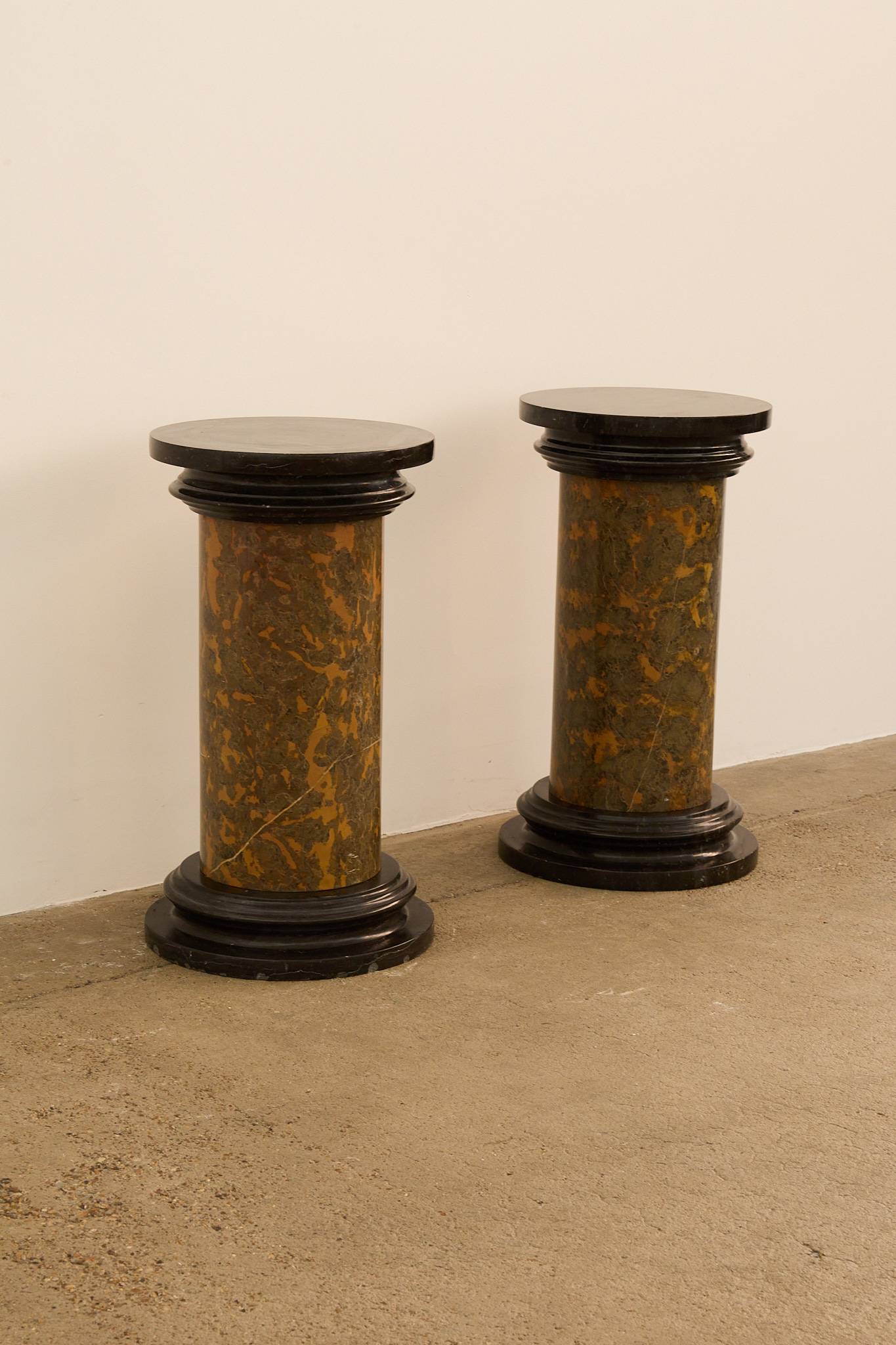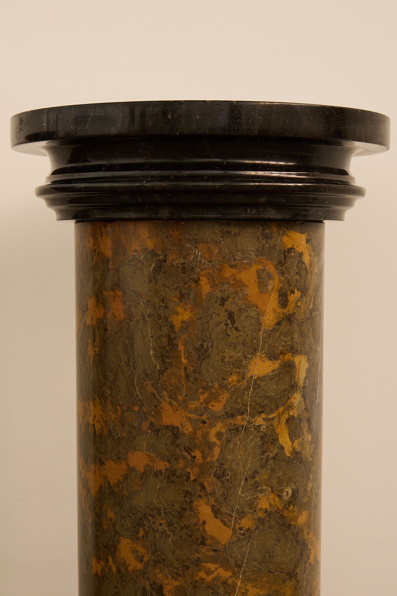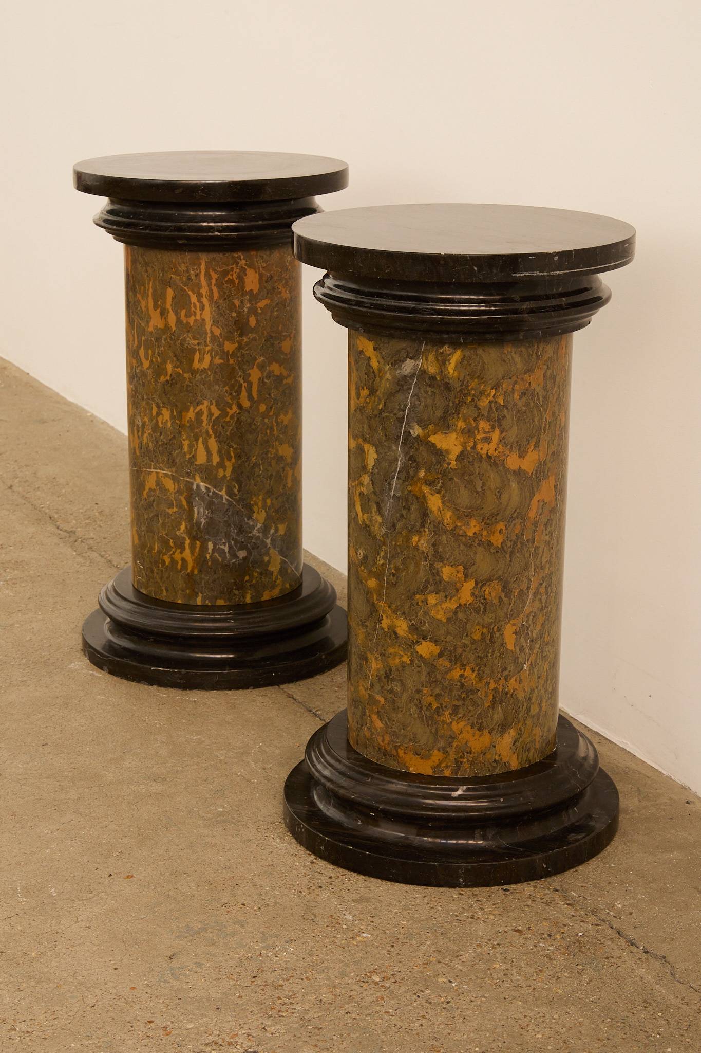 A beautiful pair of solid (heavy) pedestals. Each features a cylindrical column form in richly veined ochre and green marble, capped and based with contrasting black marble.