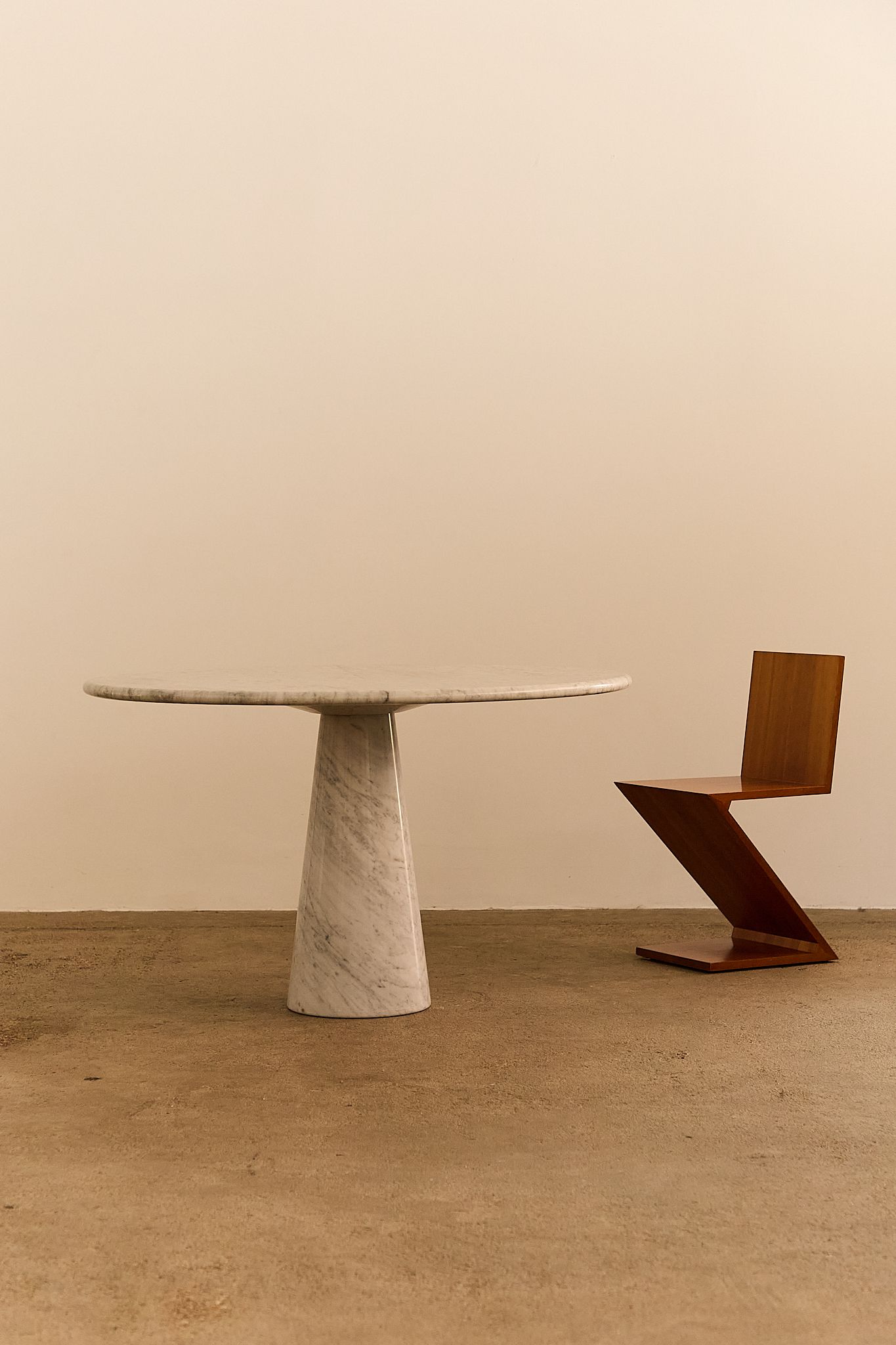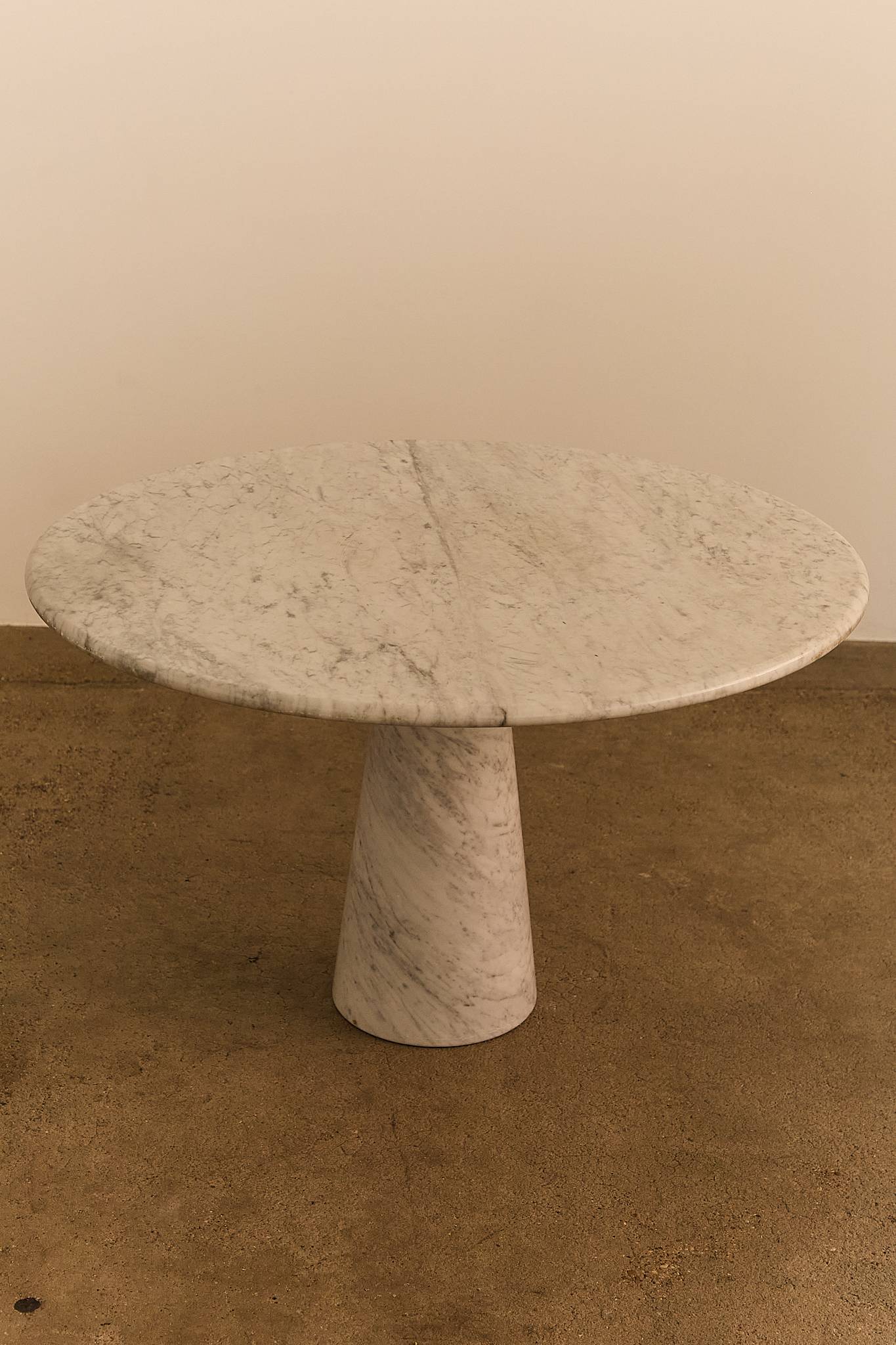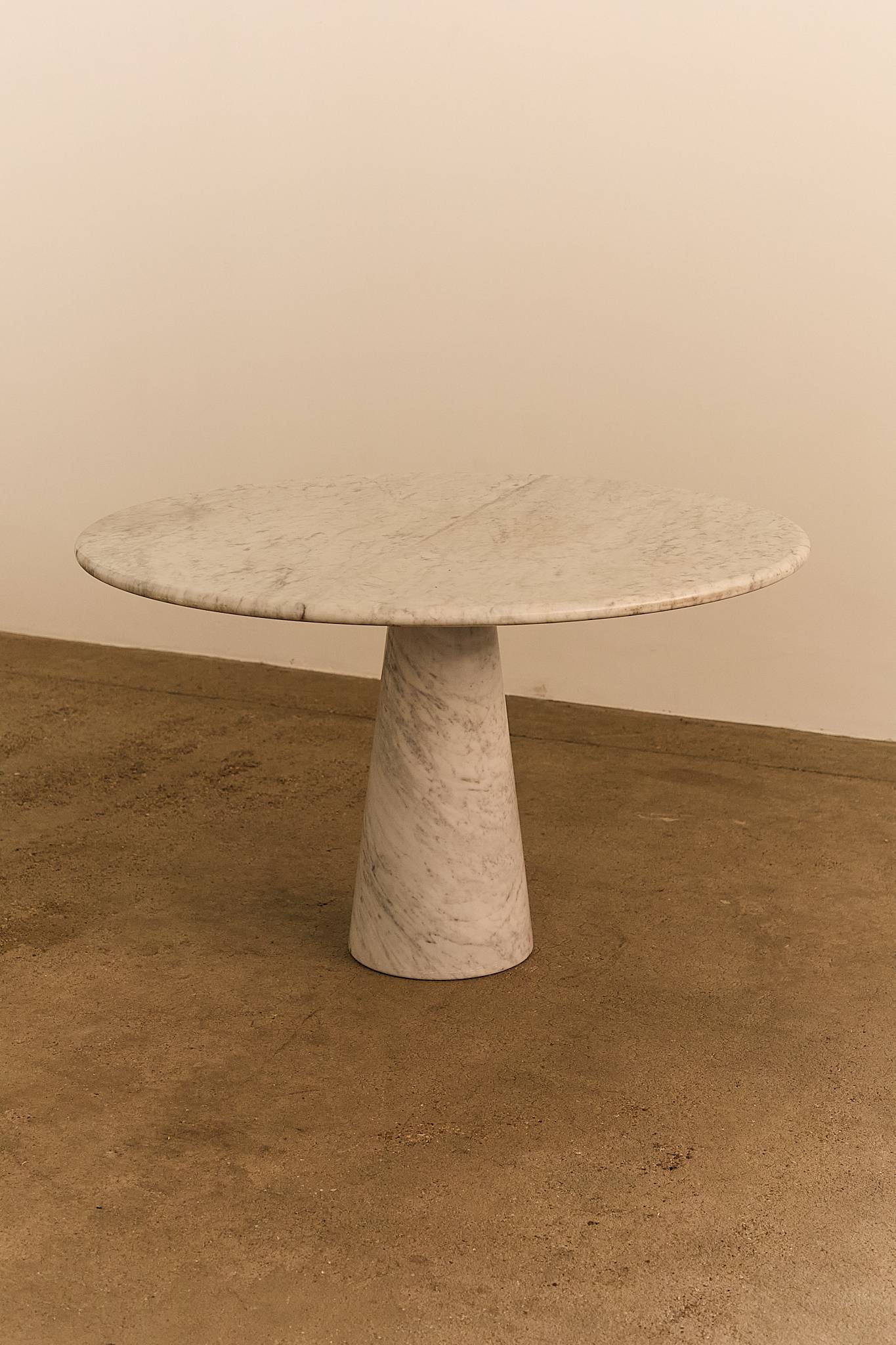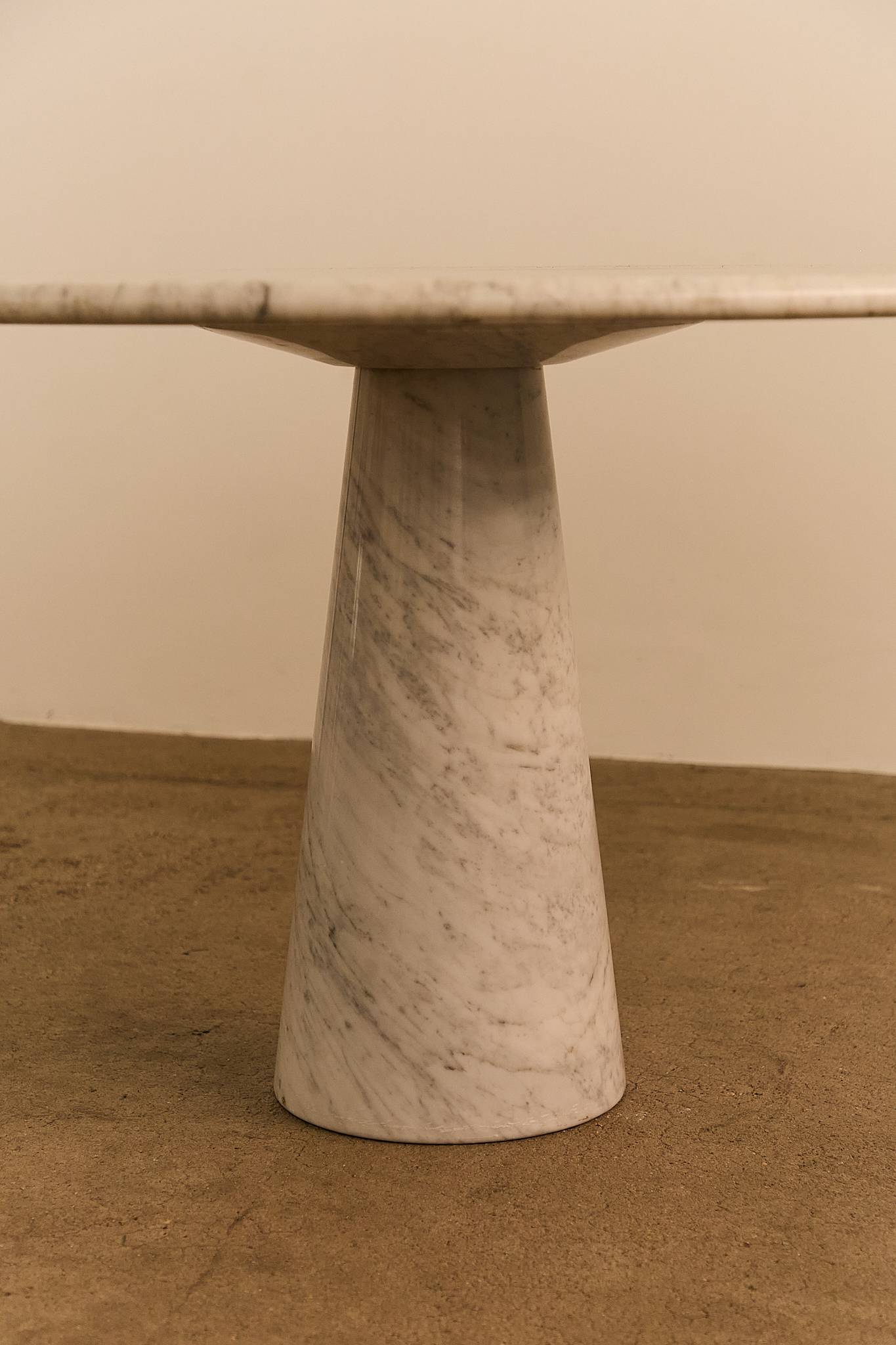 Sculptural dining or center table crafted entirely from Italian Carrara marble. The design features a circular top resting on a conical base, a hallmark of Angelo Mangiarotti’s architectural aesthetic—balancing elegance, mass, and material integrity without the need for visible joints.