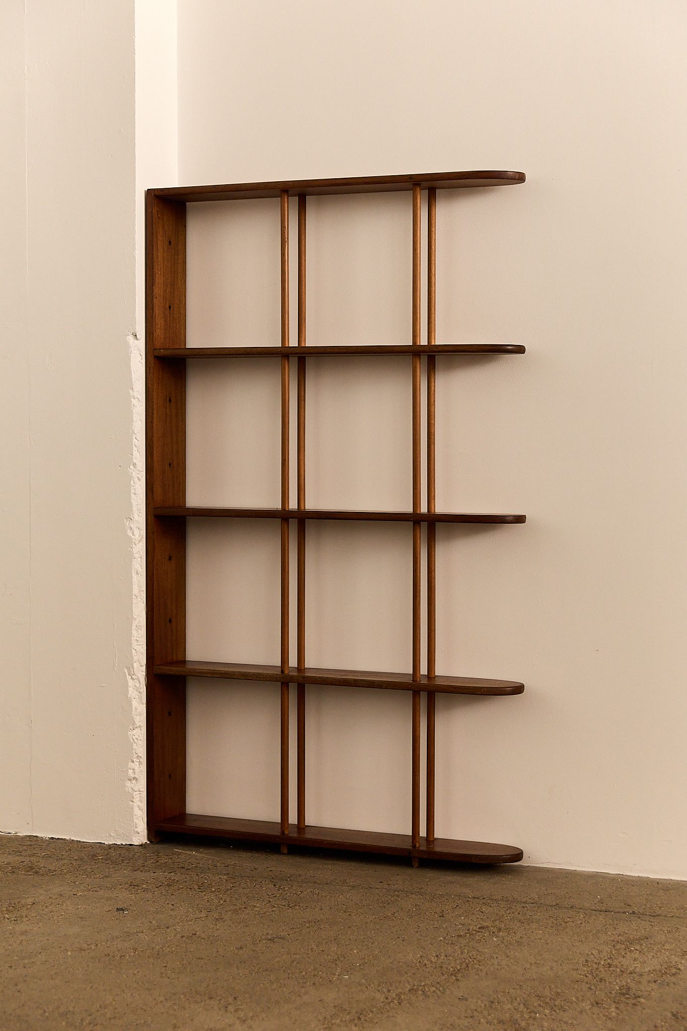 A refined freestanding wall shelf from the 1940s, crafted in oak wood with slender vertical supports. The design features five evenly spaced shelves, each accented by elegant wooden rods that lend structure and visual rhythm. Minimal yet sculptural, it offers both function and presence; perfect for displaying books, objects, or ceramics.