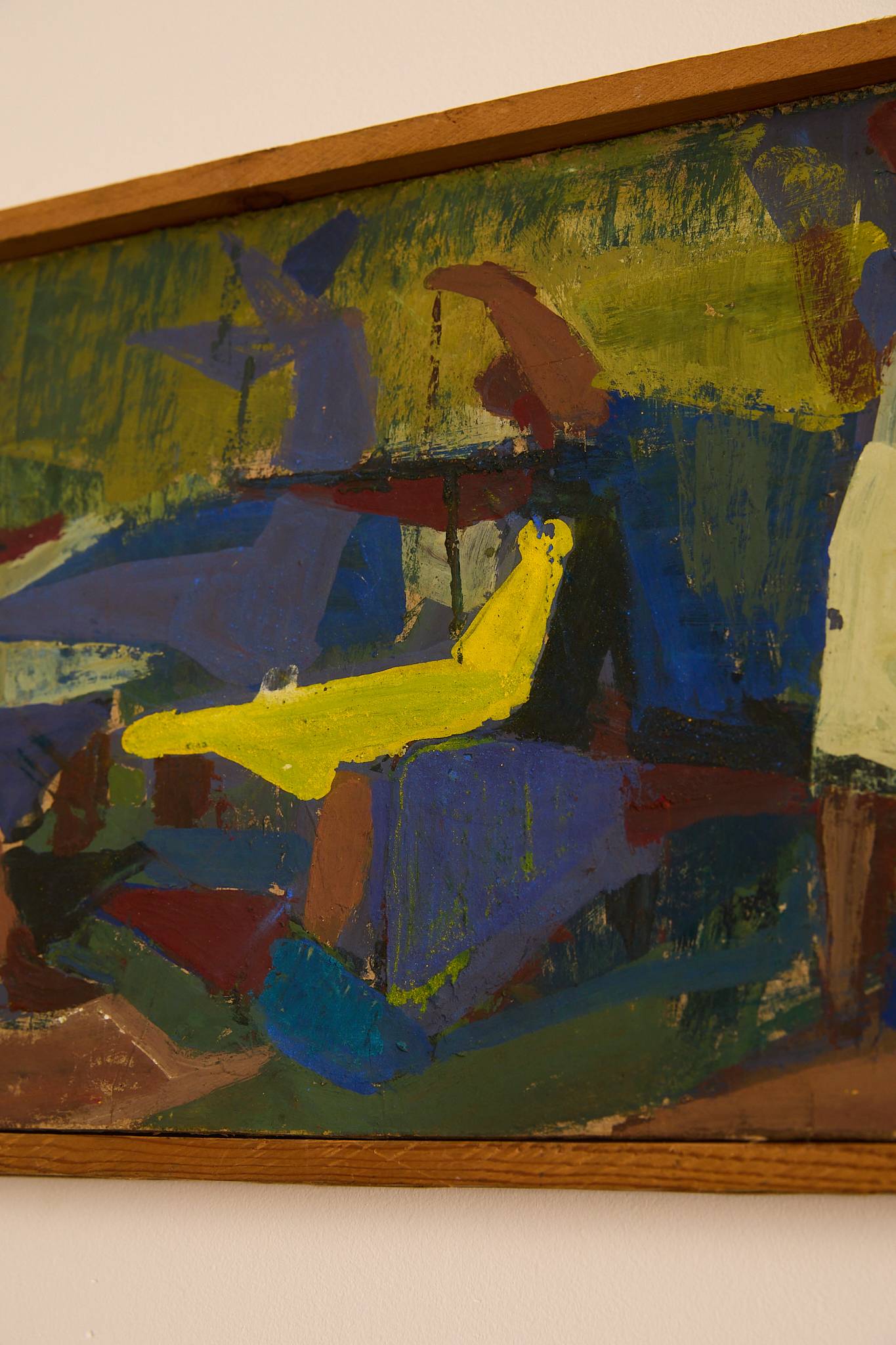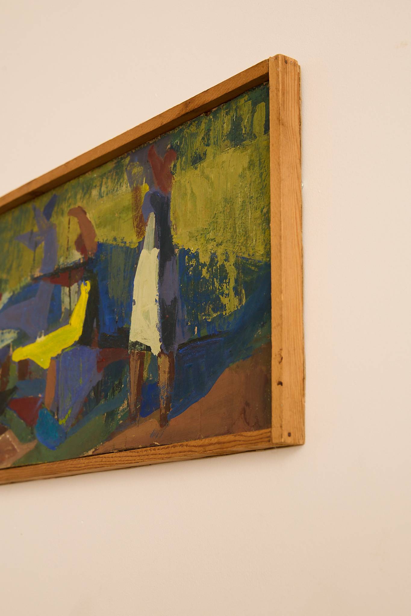 Rectangular modernist painting in vivid greens, blues, yellows and earthy reds, depicting stylised standing and seated figures around a central form. Executed in thick, expressive brushstrokes on board and presented in a simple wooden frame.