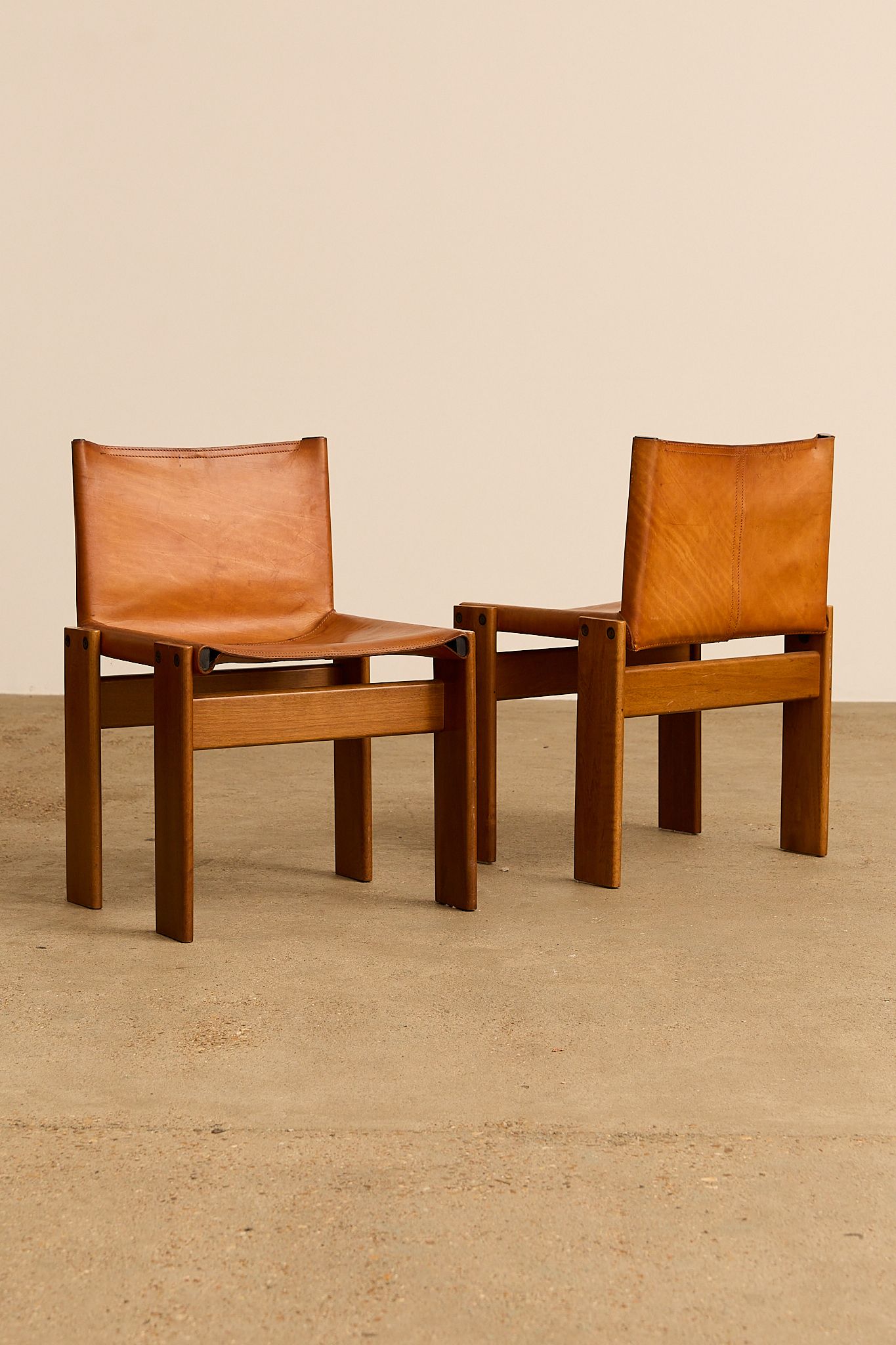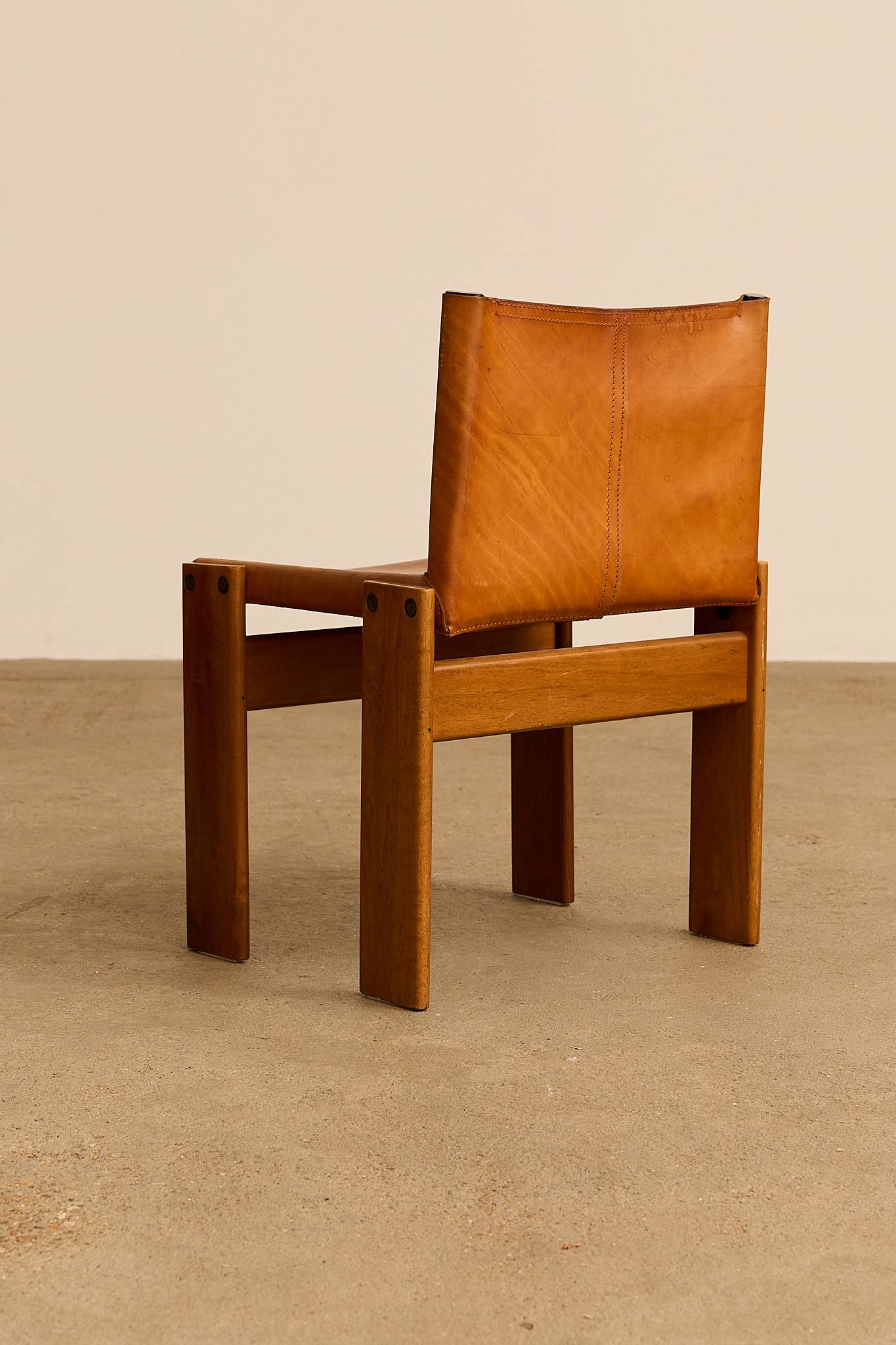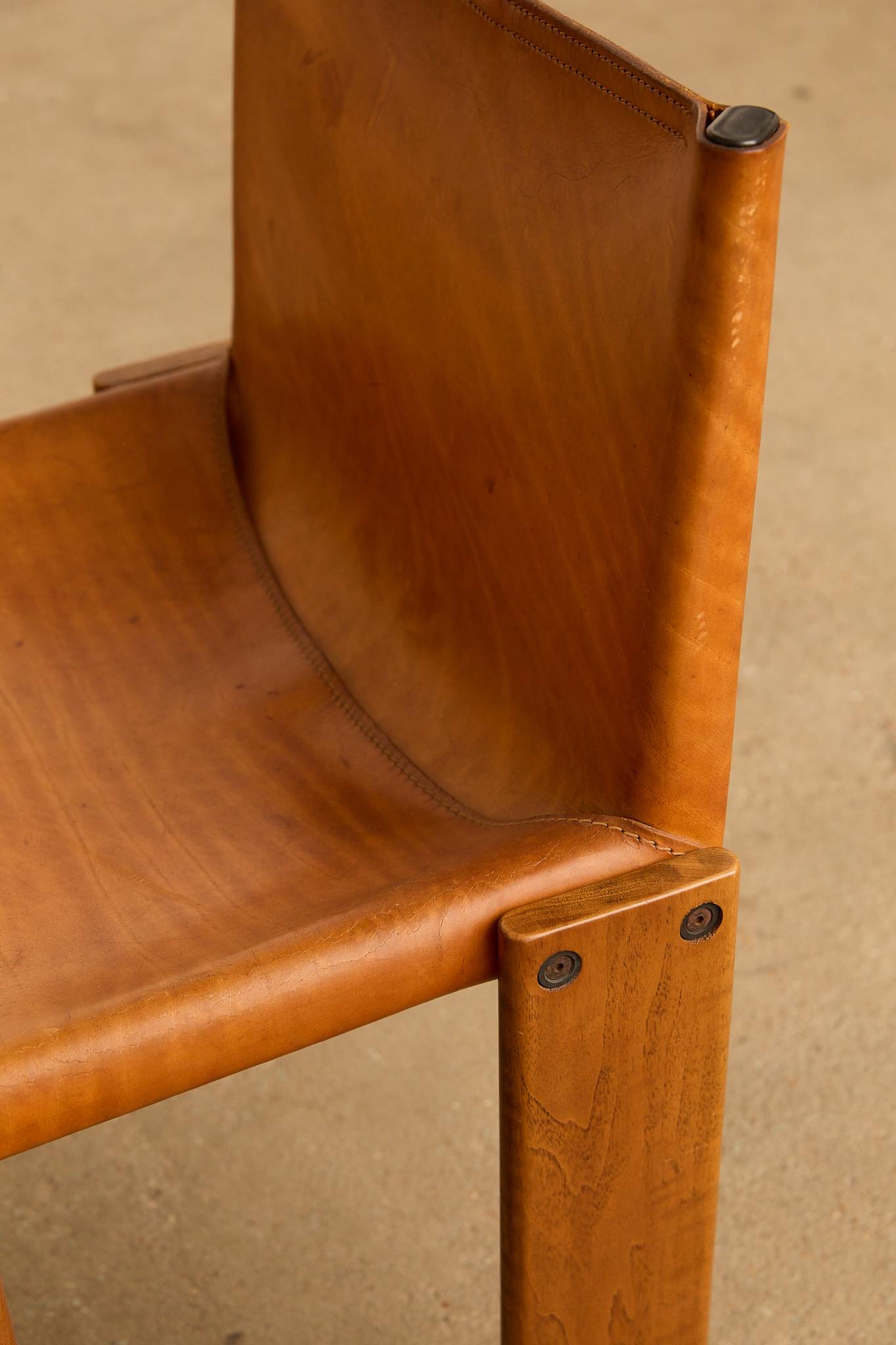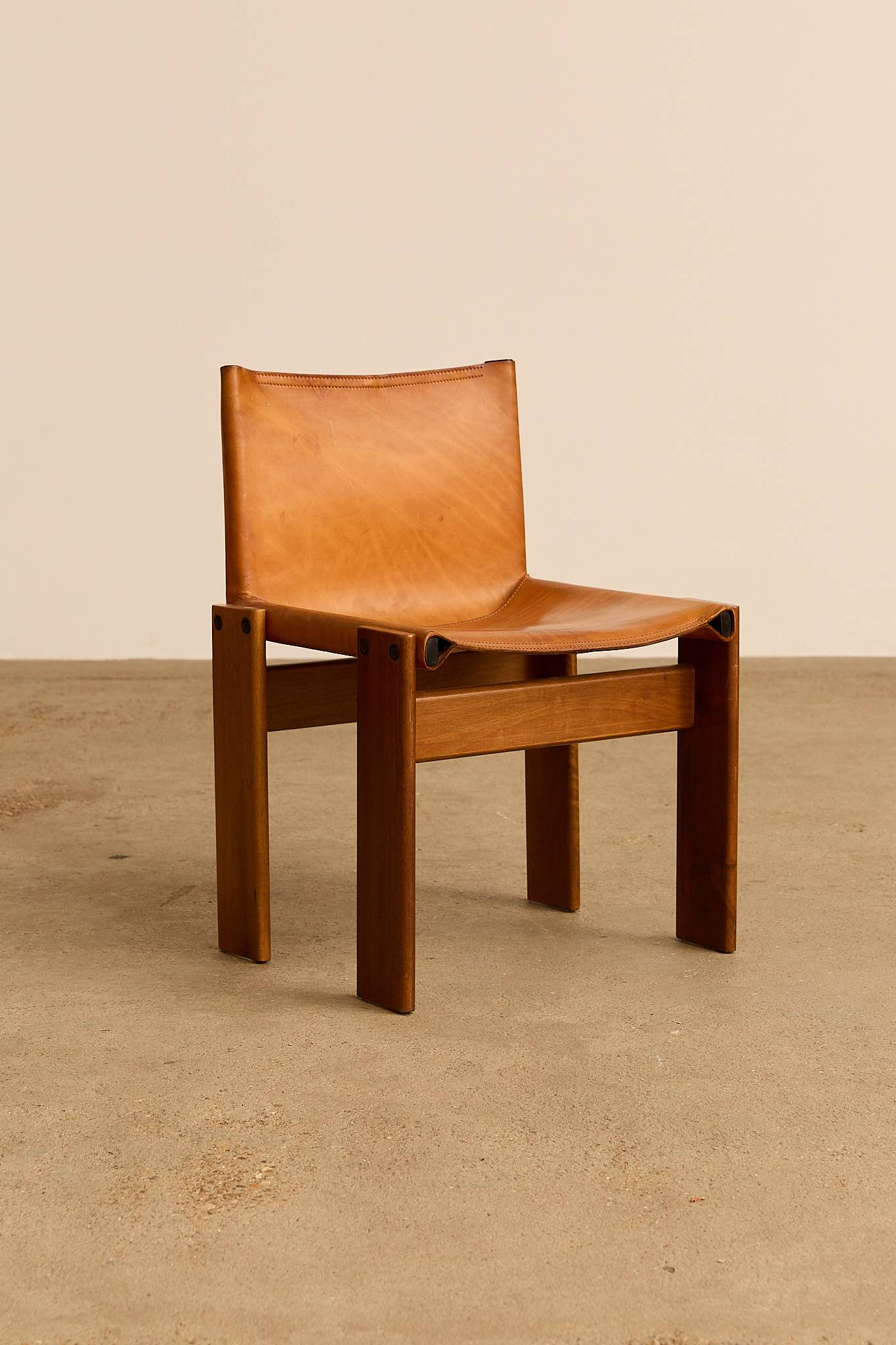 The cognac leather and warm walnut wood create a striking contrast. Their cross-angled legs give a light, flat appearance despite their solid weight. Black nail details on each leg add character. A refined, high-quality design by the award-winning Italian duo.