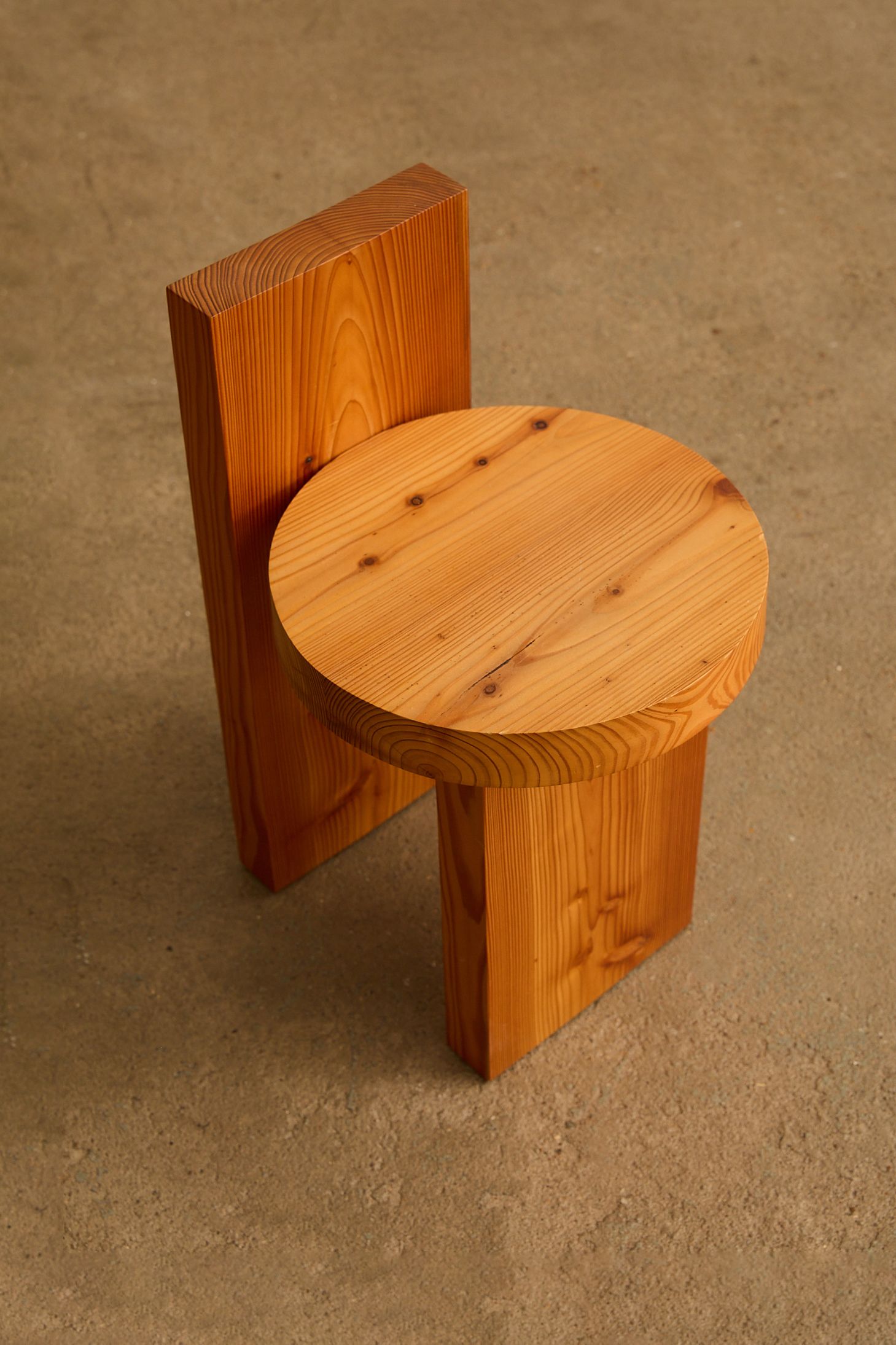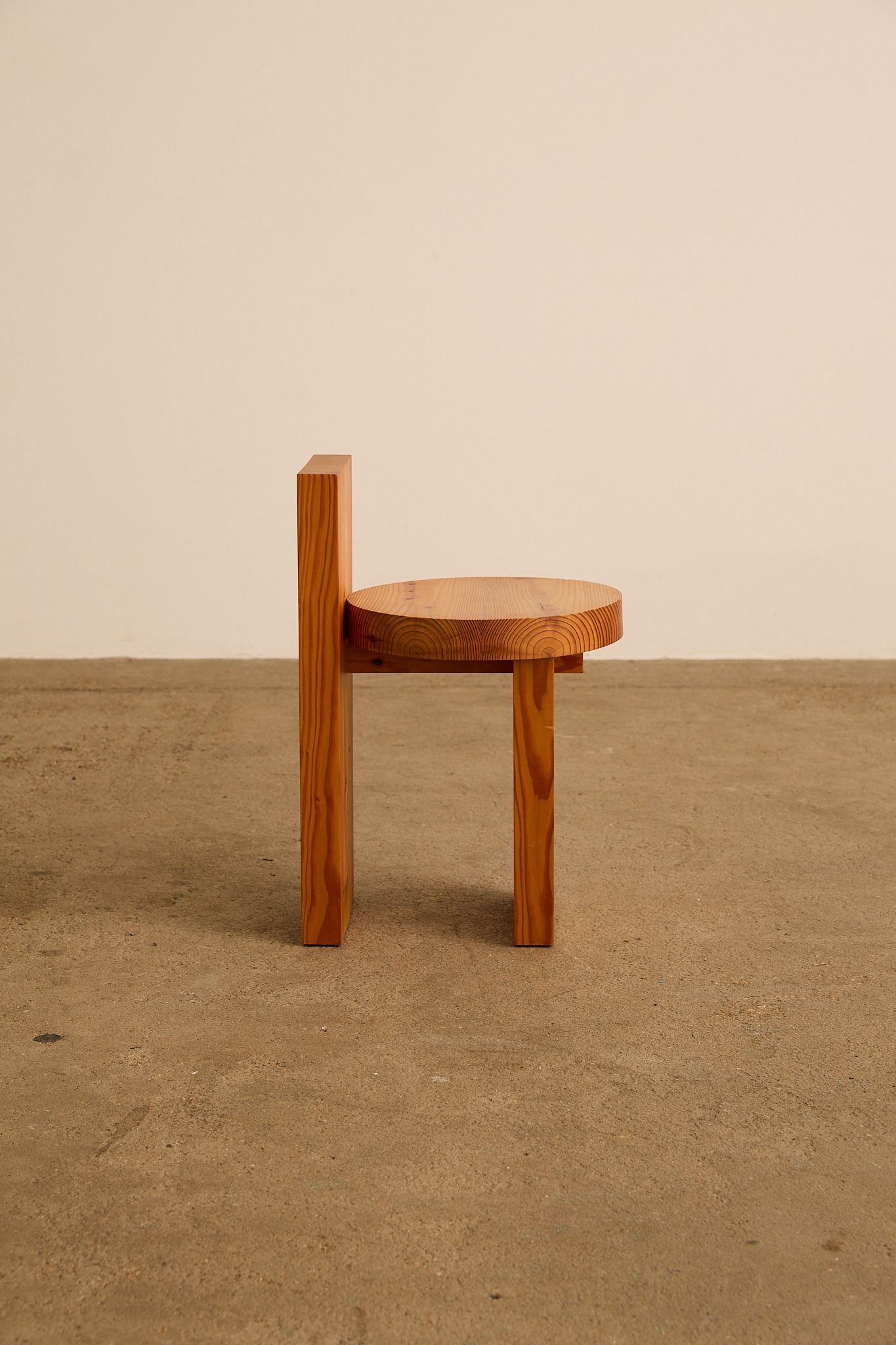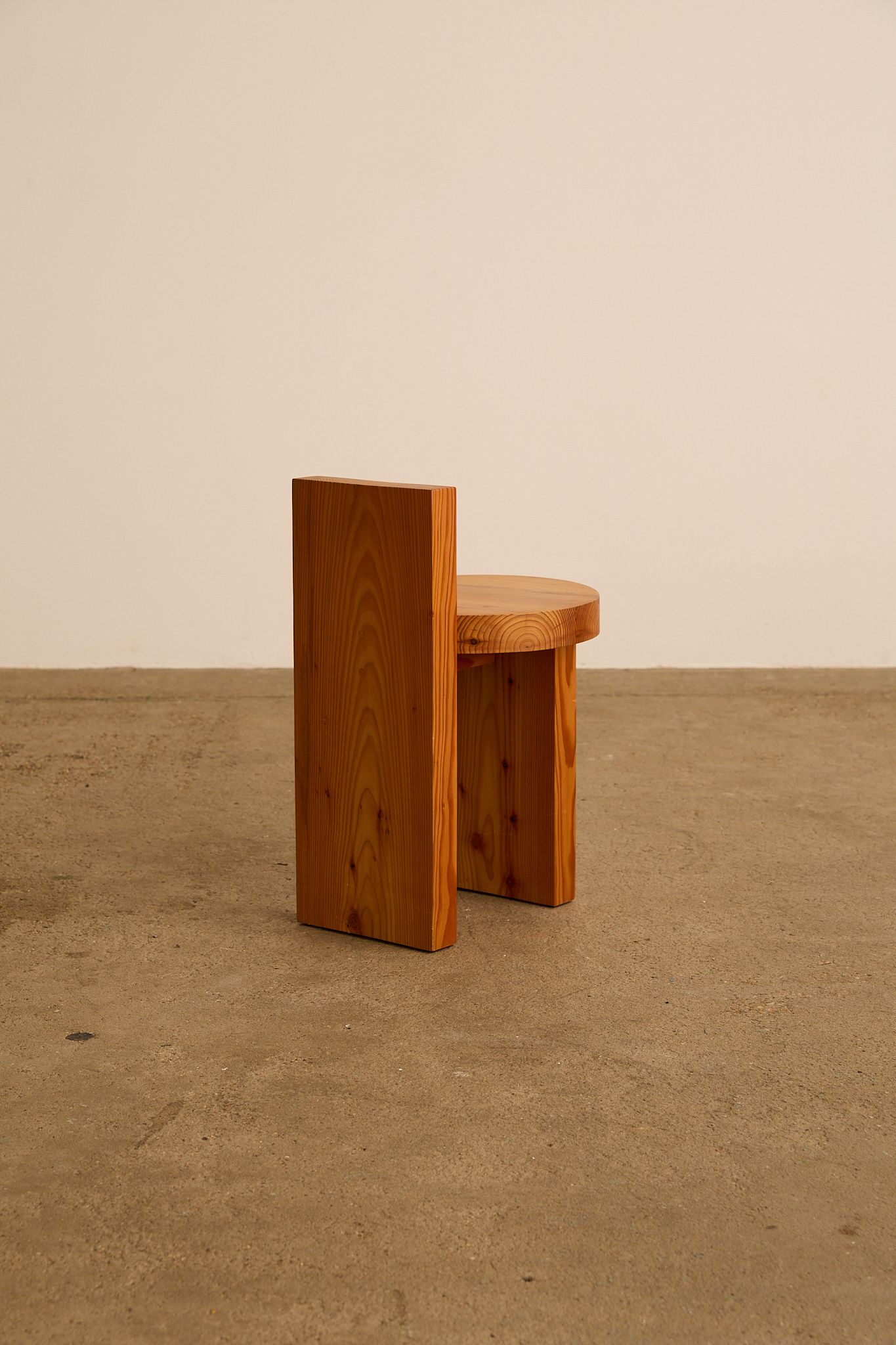 Moon chair/stool in ash wood by contemporary British designer Dale Stephens of TMPL Studio. A sculptural piece with a thick circular seat set on two solid, slab-like legs, showcasing the warm grain and graphic simplicity of the timber.