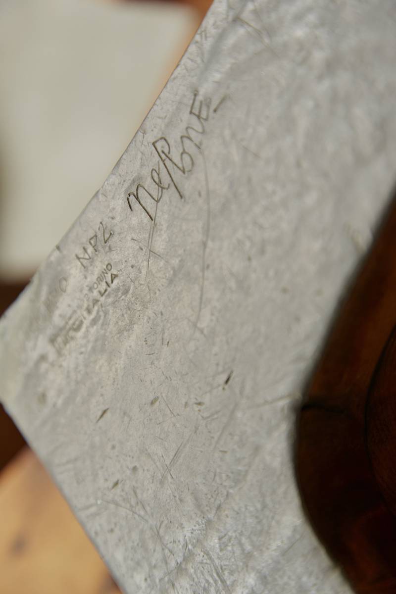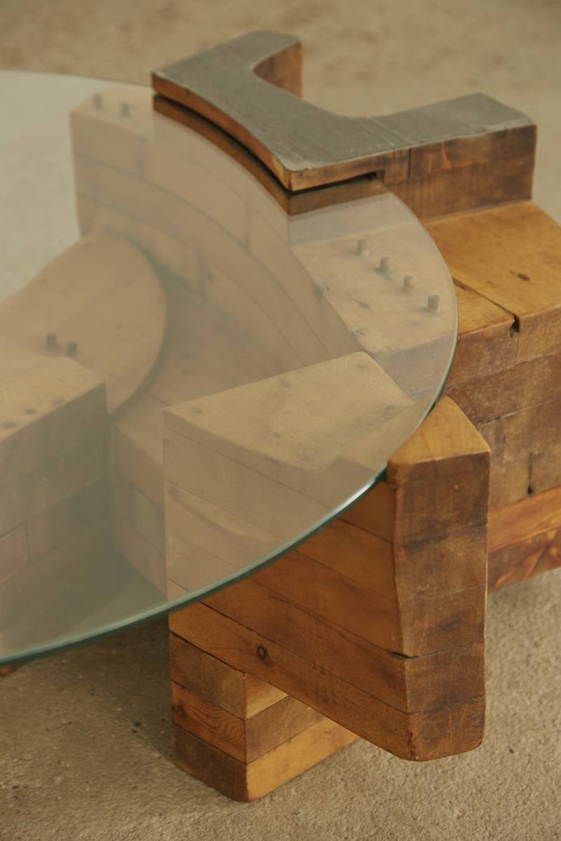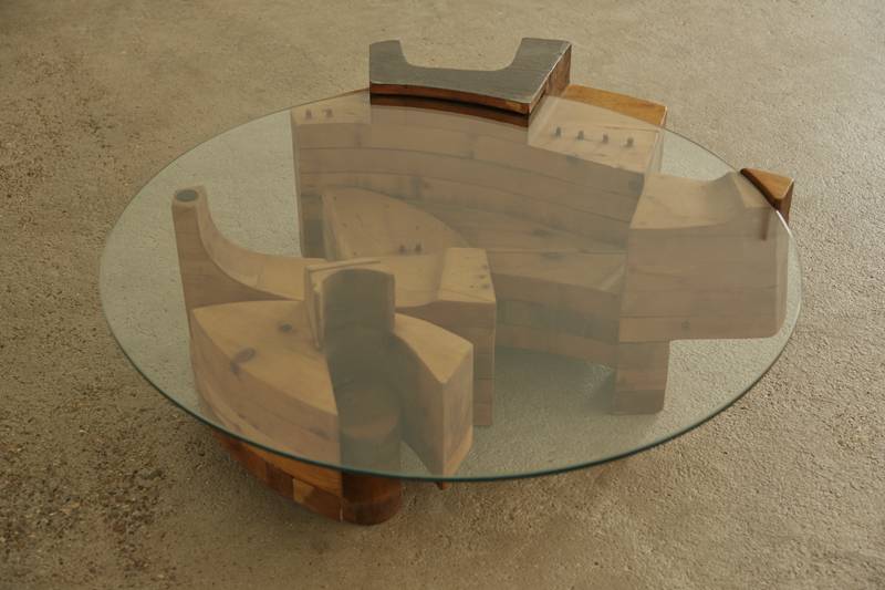 Designed by Italian duo Nerone and Patuzzi, this sculptural coffee table is truly a work of art. Its asymmetrical wooden base extends beyond the glass top, emphasizing the piece’s three-dimensionality. The base features a textured, fire-treated wood, finished with clear varnish, and an iron plate signed by the designers. Originally a prototype for the 1967 Venice Biennale, this limited edition model (#76/200) dates to the 1970s.