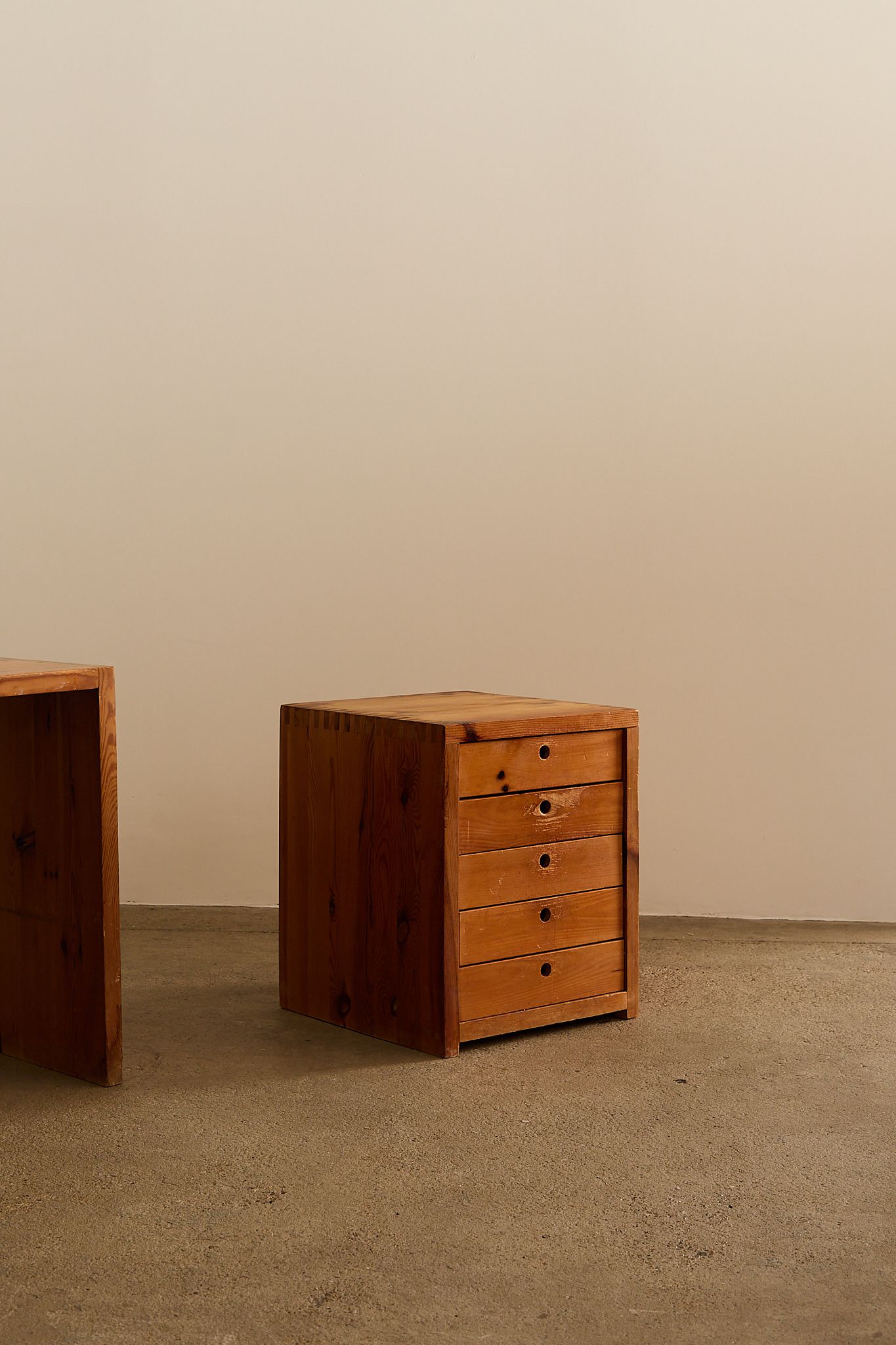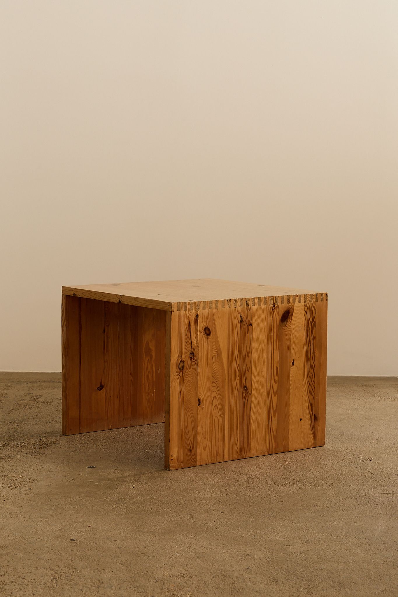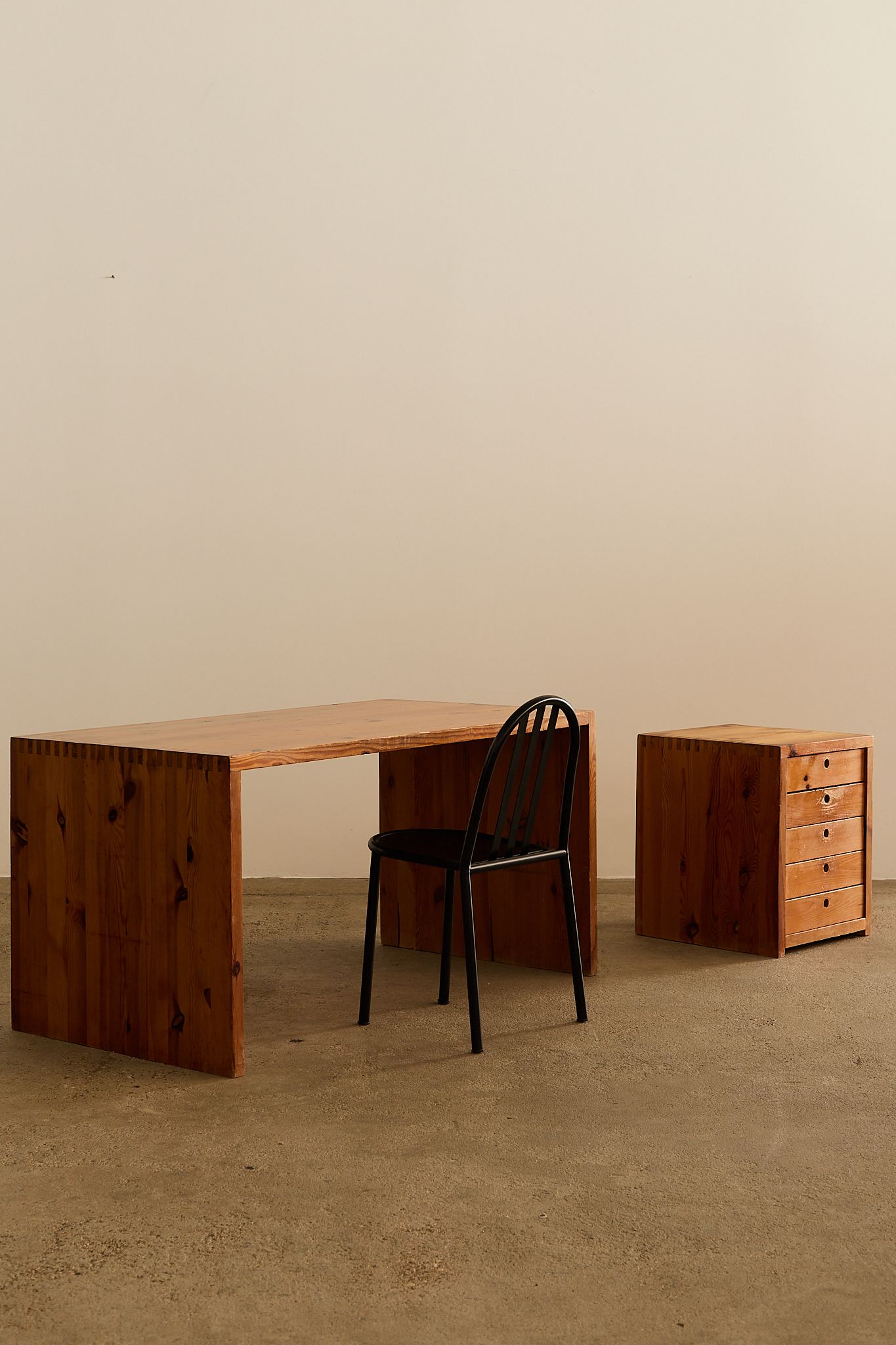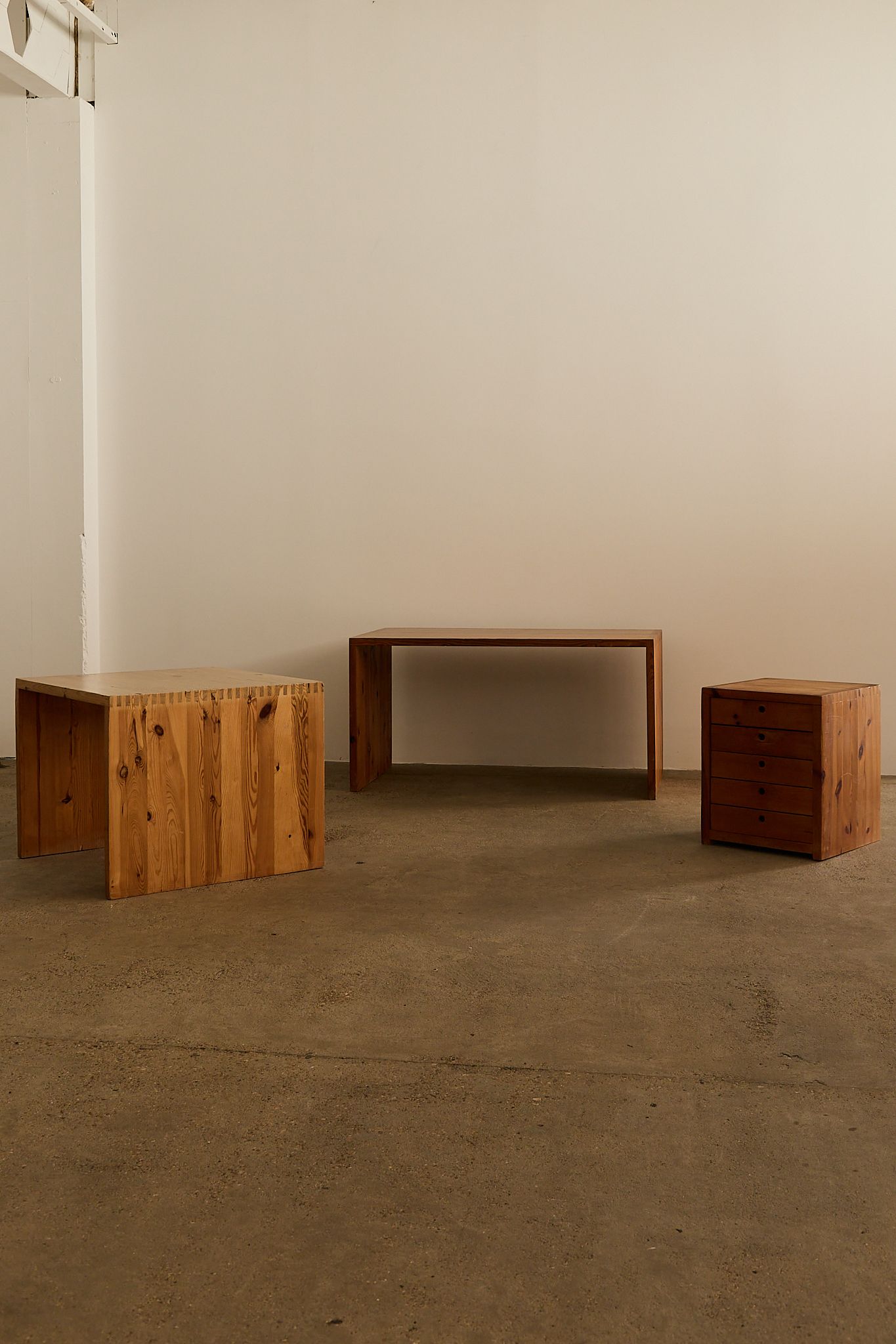 Set of three minimalist pine desks tables by Ate Van Apeldoorn for Houtwerk Hattem, Netherlands. Designed in the 1960s, this modular set includes a large desk, a smaller desk, and a drawer unit, all crafted from solid pine with exposed wood joints, characteristic of Van Apeldoorn’s functional and honest design style. The pieces slot neatly into one another but can also be used separately, offering versatile configuration and timeless appeal. Price is for the set.