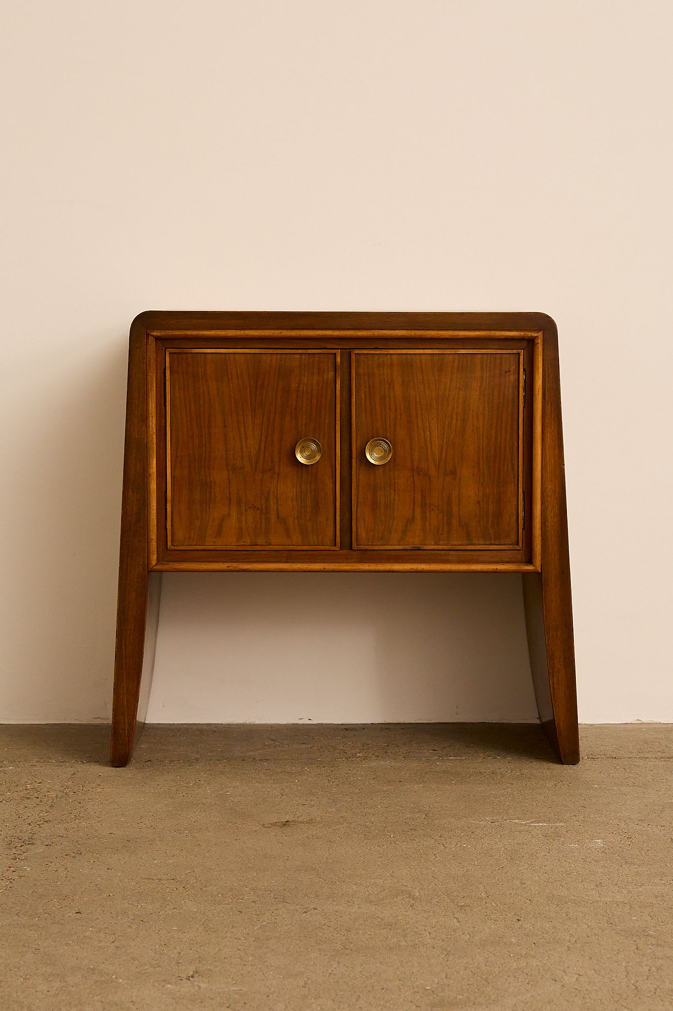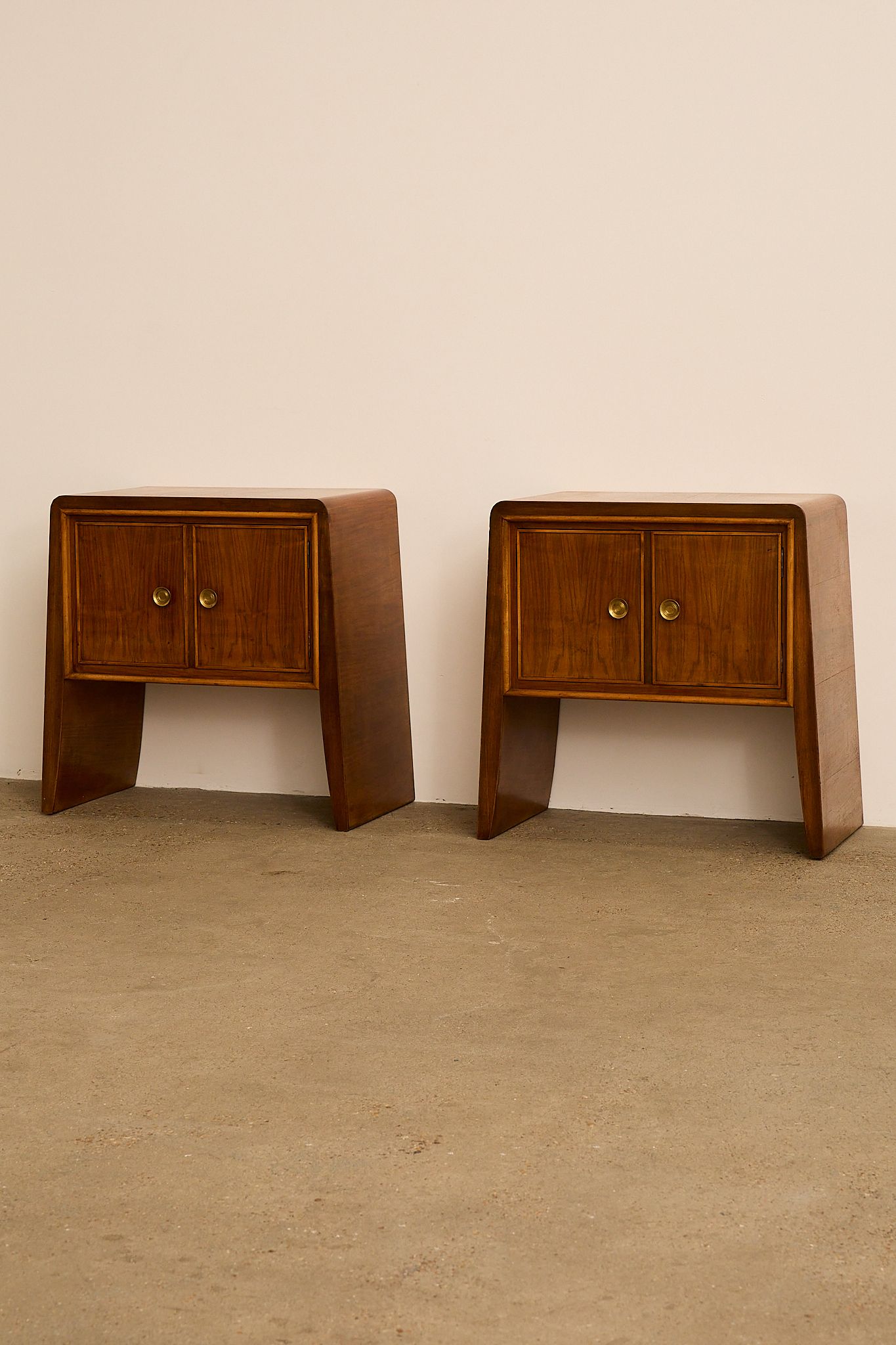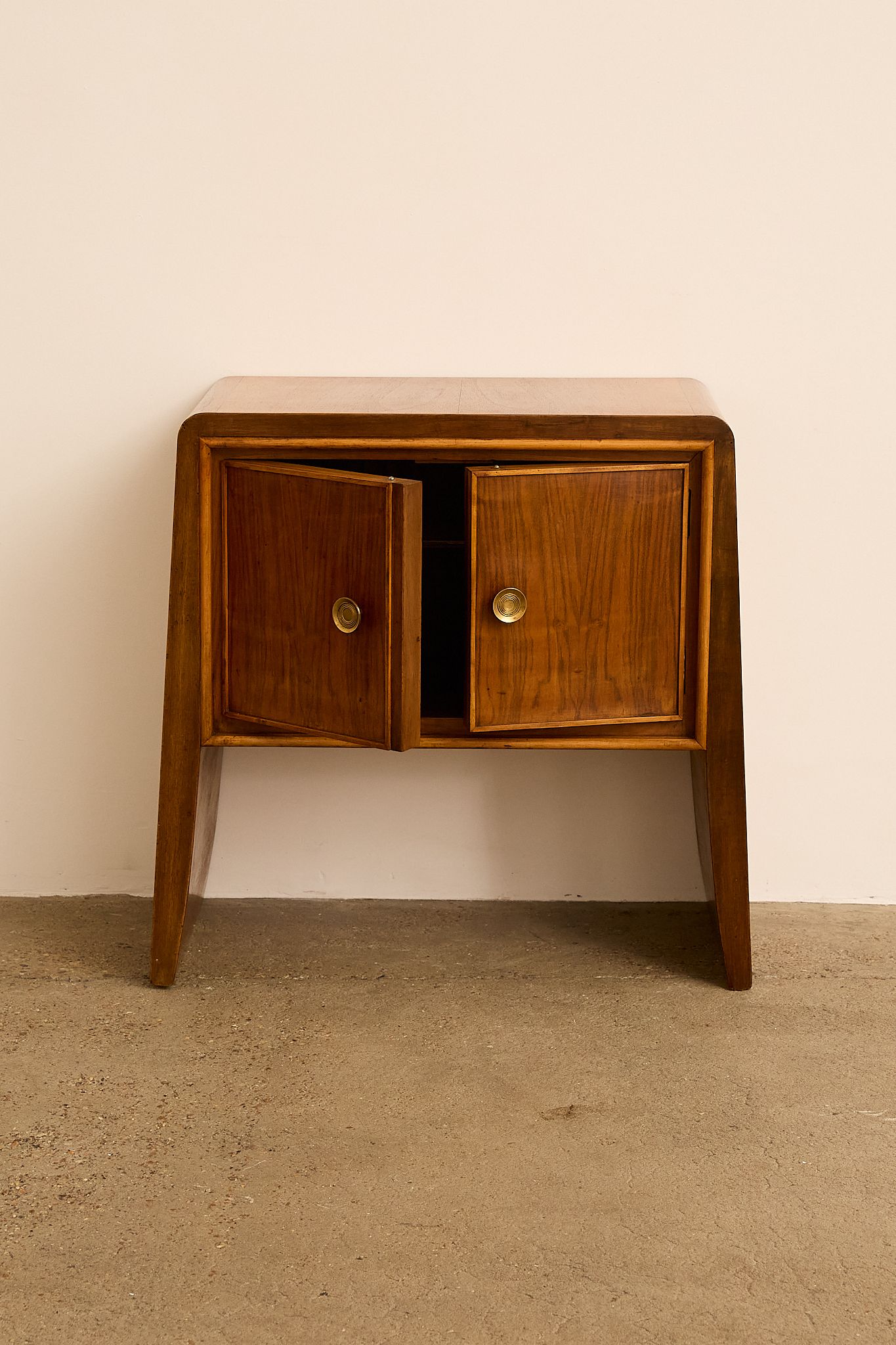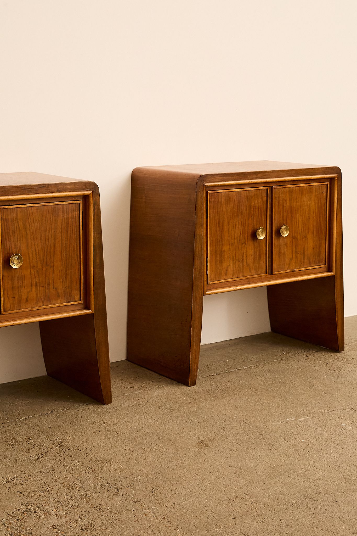 Pair of nightstands attributed to Paolo Buffa, Italy, 1950s. Expertly crafted in warm-toned wood, the design features gracefully curved edges and refined proportions. Each piece is fitted with double doors and elegant brass pulls, showcasing understated Italian sophistication. Price for the pair.