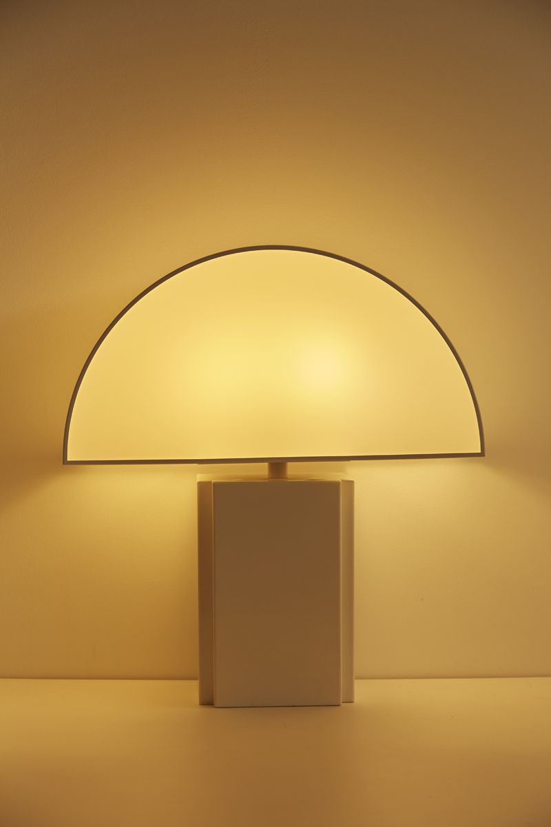 Striking Olympe table lamps, designed by Harvey Guzzini in the 1970s for ED, Italy, is a true statement piece. Its distinctive demilune shade creates a beautiful ambient glow when illuminated, casting a soft, half-moon light through its semi-opaque acrylic. The lamp features a sleek metal base and a plastic shade, thoughtfully designed with an open back for easy access when changing the two bulbs. Only one lamp available