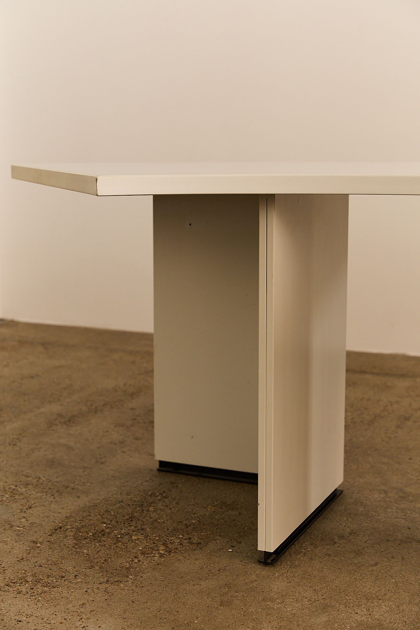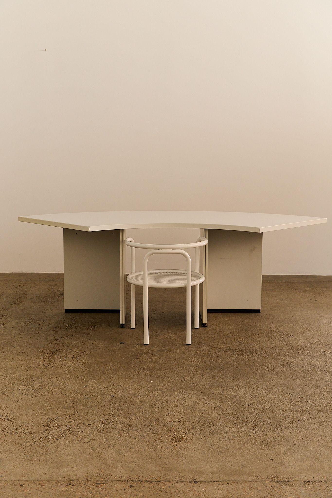 Designed by Osvaldo Borsani for Tecno Italia in the 1970’s, this desk is formed by a pair of white laquered metal and topped with a swooping sheet of white laminate. Stamped Tecno.