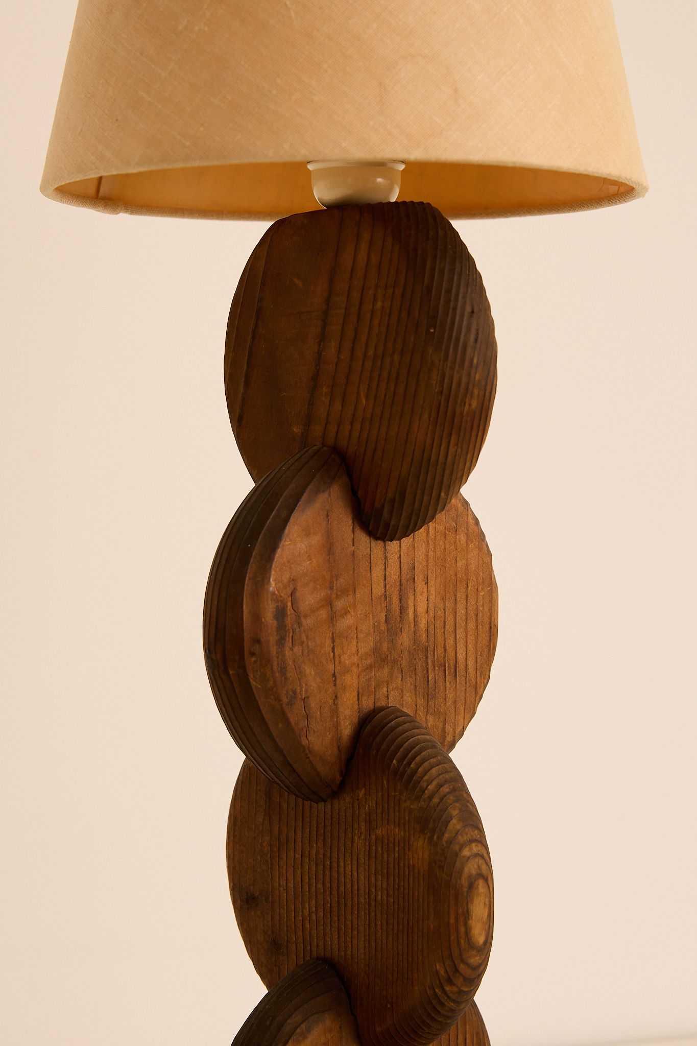 Temde table lamp, Switzerland, 1970s. Sculptural stacked-wood base with the original fabric shade; the shade shows some small tears to the inner lining but remains structurally sound.