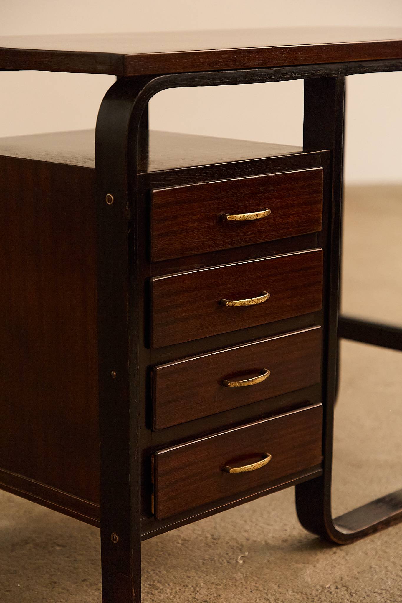 Compact table in stained wood with curved laminated legs and structural detailing, featuring four drawers with brass handles. A functional and elegant piece with early modernist influences, likely originating from a private commission.