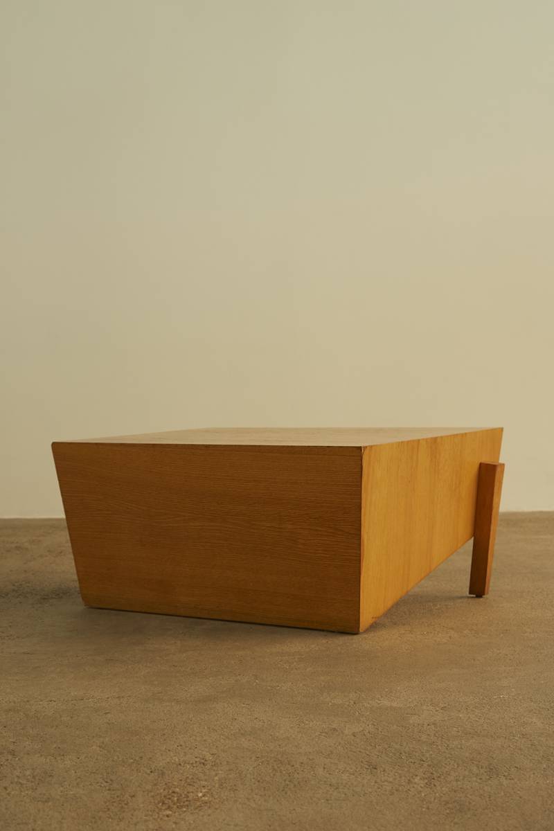 Sourced in France, this unique coffee table features a striking angular design with clean, minimalist lines. Crafted from warm-toned wood, its elevated silhouette rests on four angled legs, showcasing a harmonious blend of functionality and sculptural form.