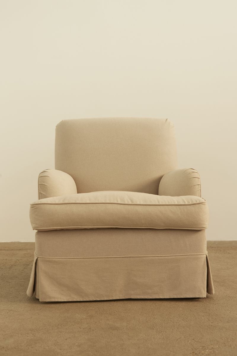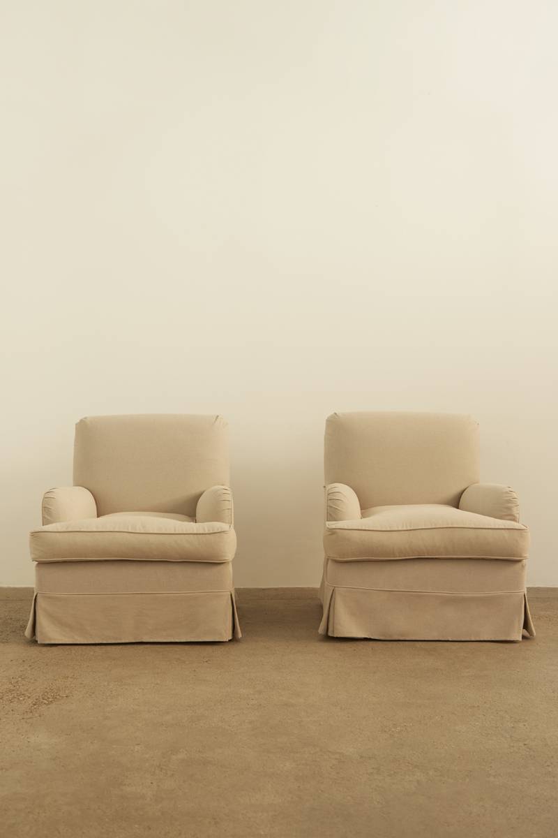 A pair of classic sand cotton slipcovered armchairs with a timeless silhouette. Featuring plush cushions and skirted bases, with beech feet, these chairs offer both comfort and elegance. Price is for the pair.