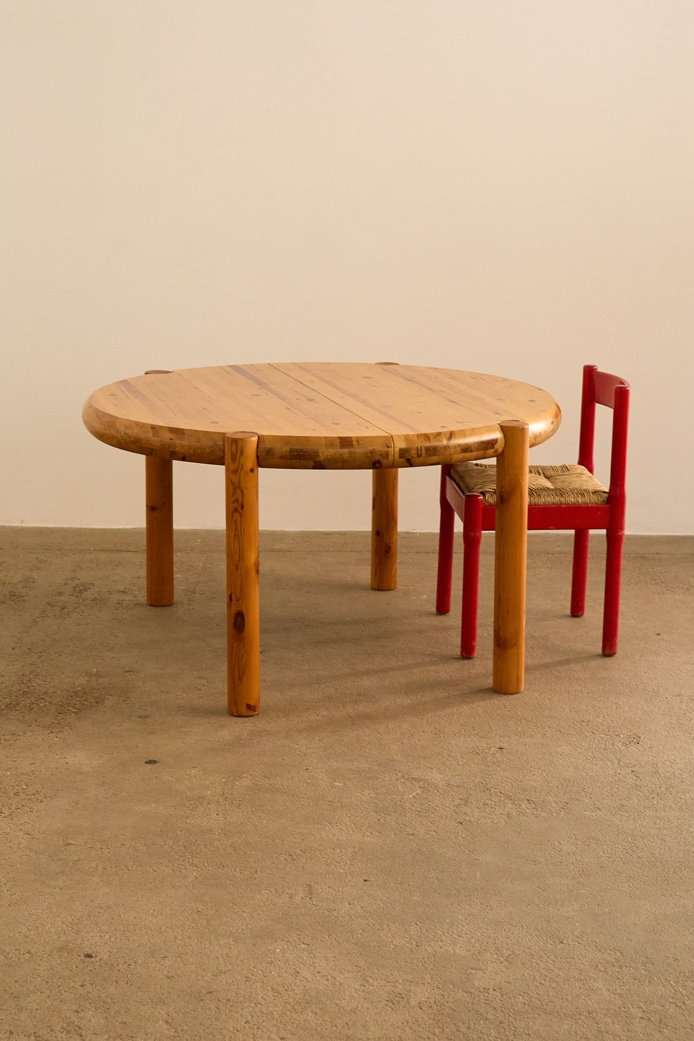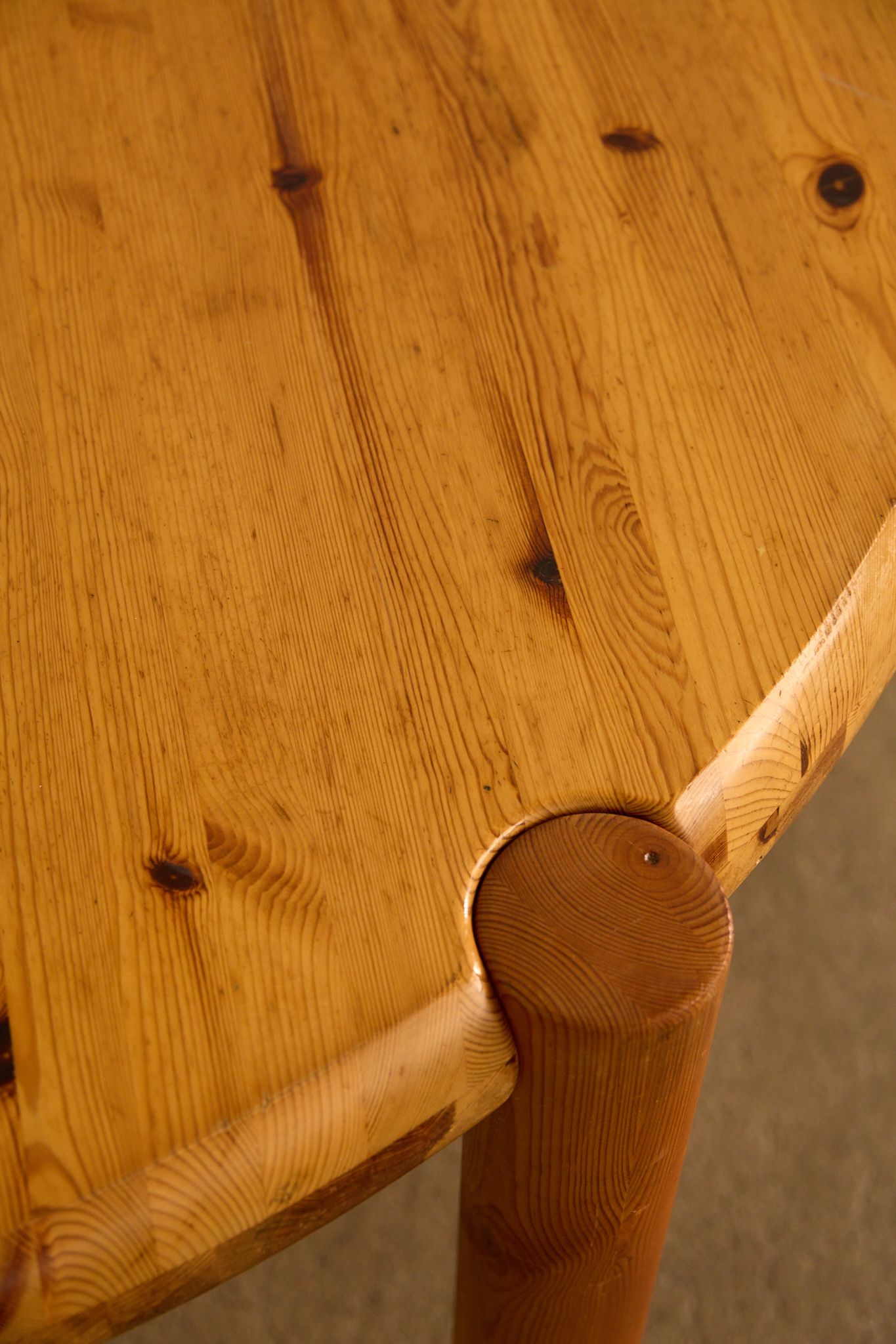 Round pine dining table by Rainer Daumiller, featuring a solid thick top with rounded edges and cylindrical legs that slot seamlessly into the tabletop. Daumiller’s work is celebrated for its sculptural simplicity and use of natural pine, highlighting the expressive grain of the wood while emphasizing durability and function.