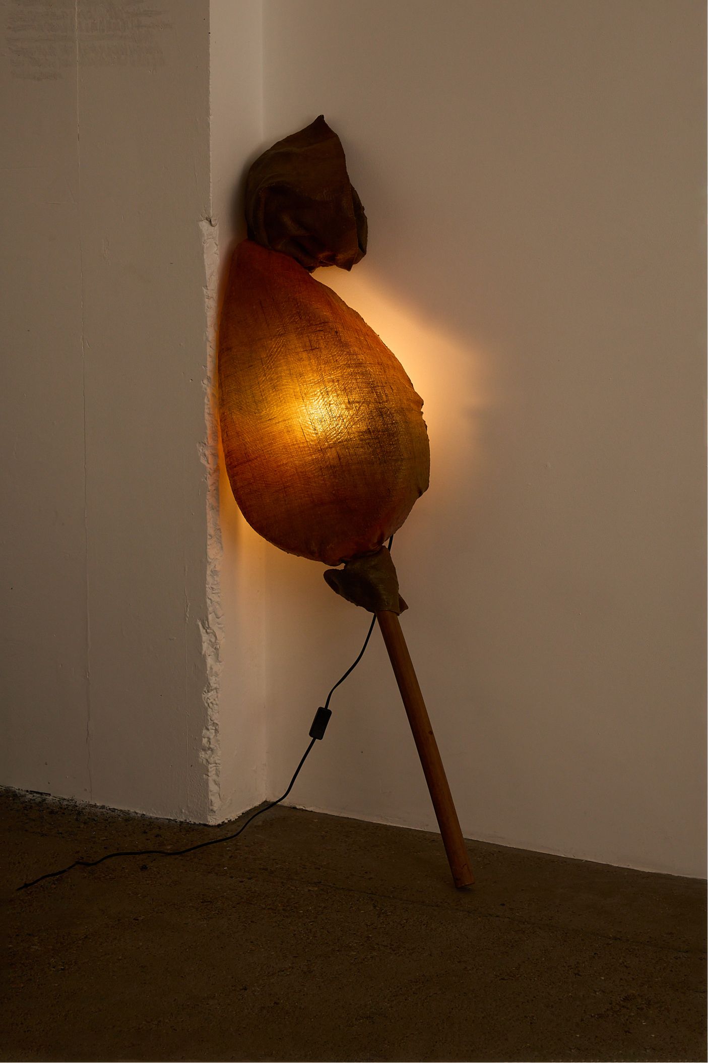 Sculptural floor or wall lamp resembling a wrapped cocoon, with a hand-formed fibreglass or fabric shade in earthy tones mounted on a simple wooden pole. When lit, the textured shell glows with a warm, diffuse light, casting soft shadows on the surrounding wall.
