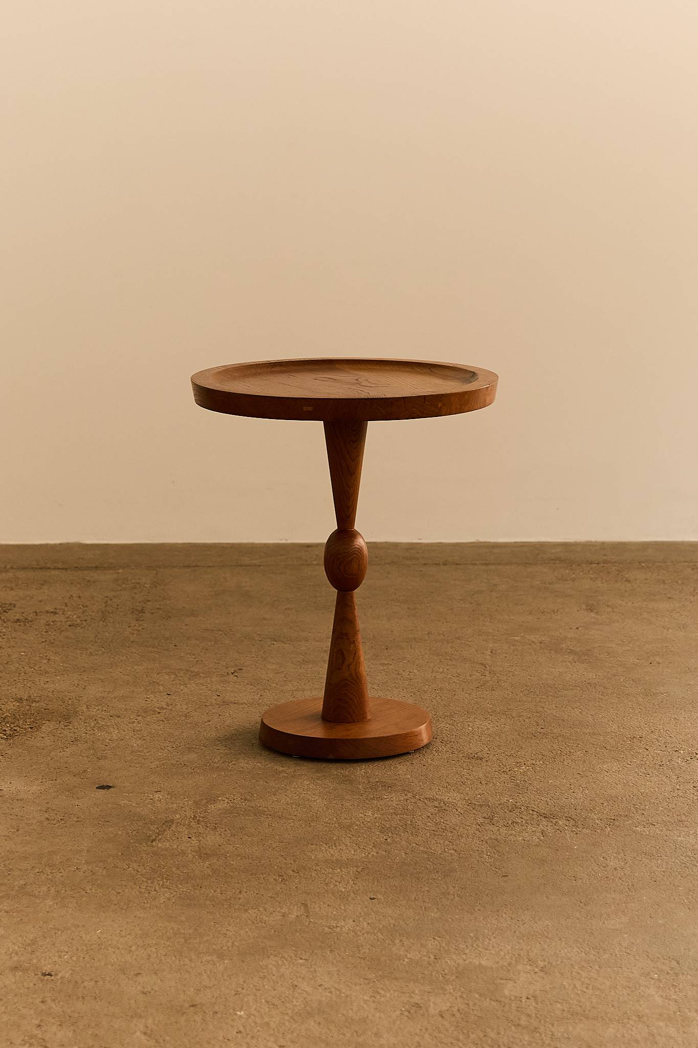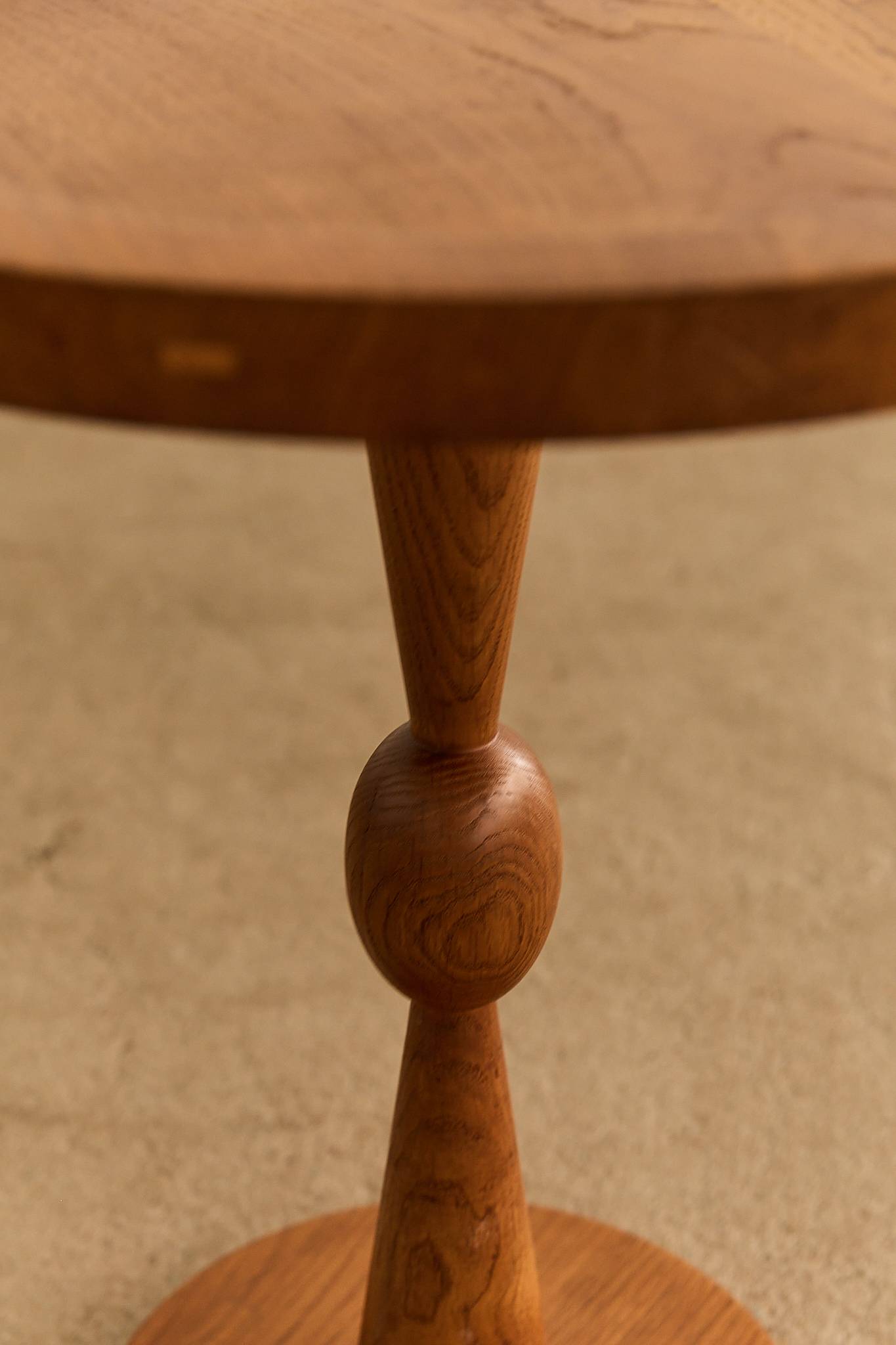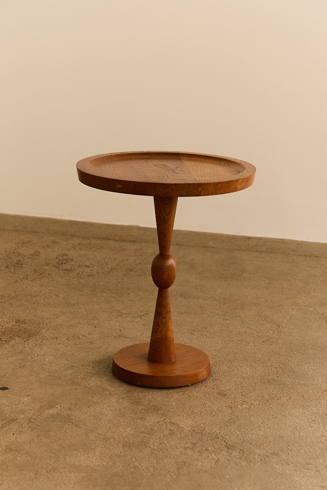 A beautifully crafted side table from the 1960s, made of solid wood with a warm, natural finish. The round tabletop features a subtle raised lip; Its sculptural base showcases refined turning work, balancing a tapering cone and rounded central detail on a circular plinth.