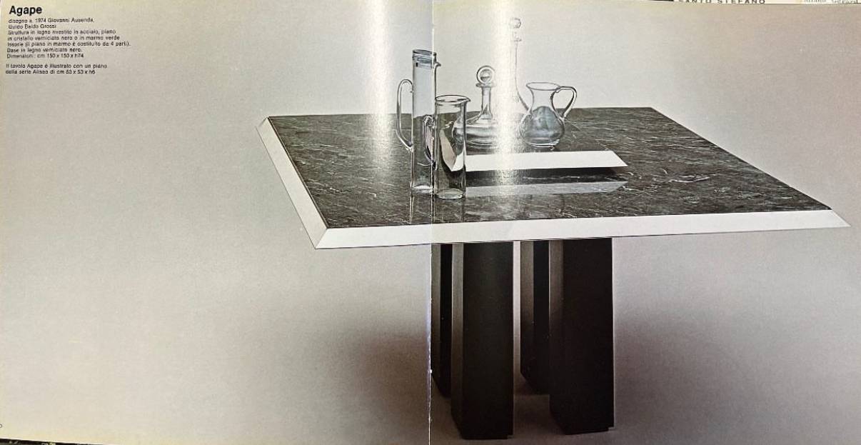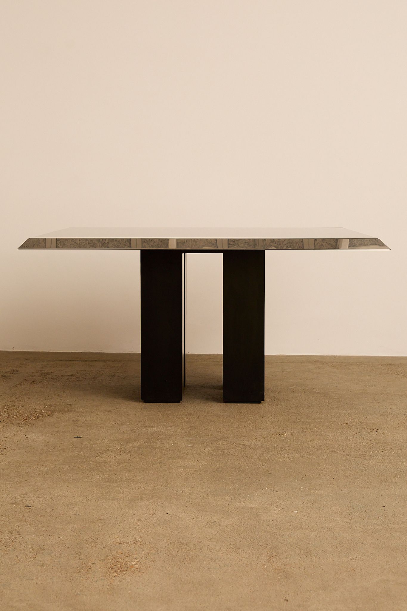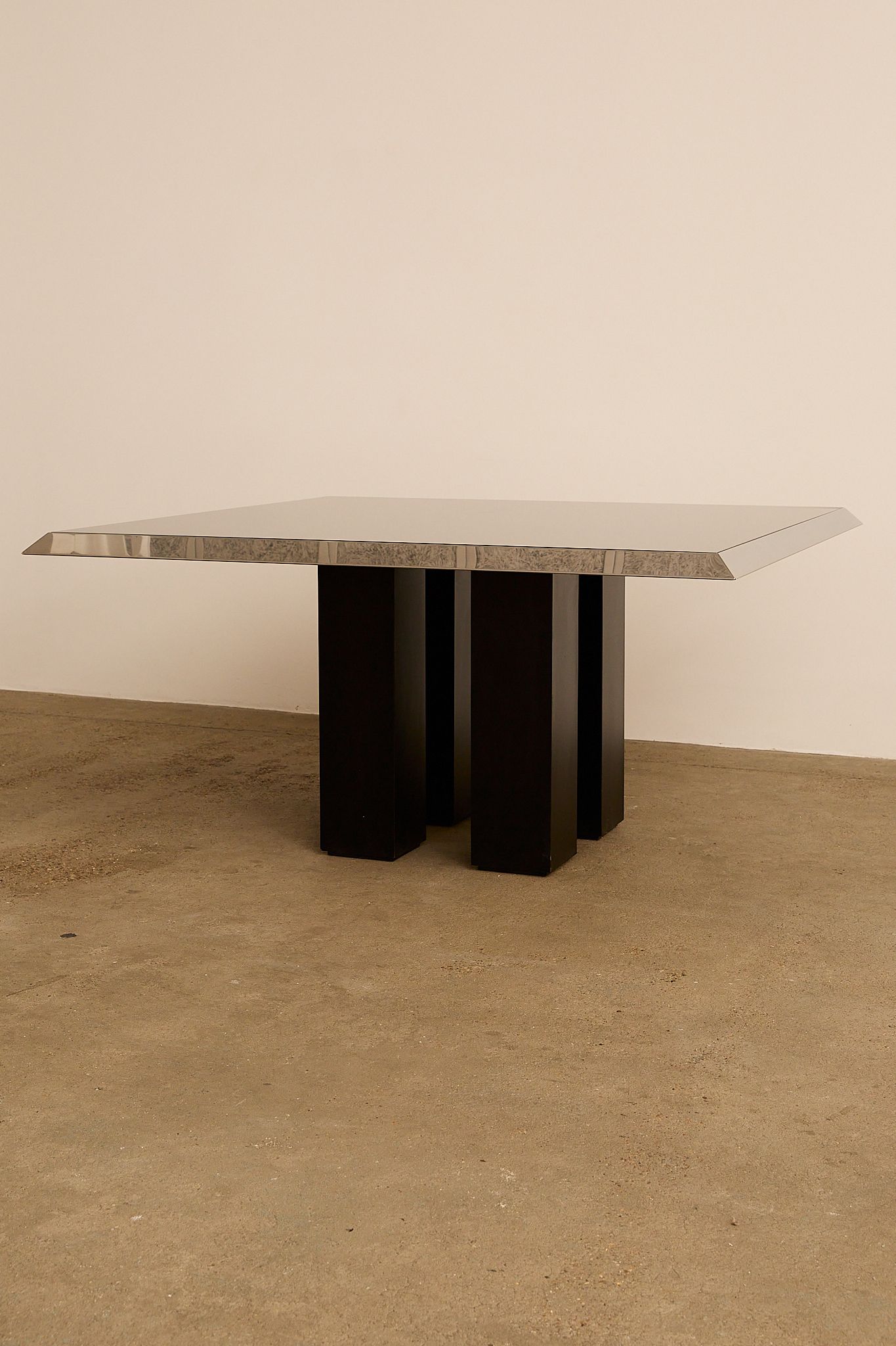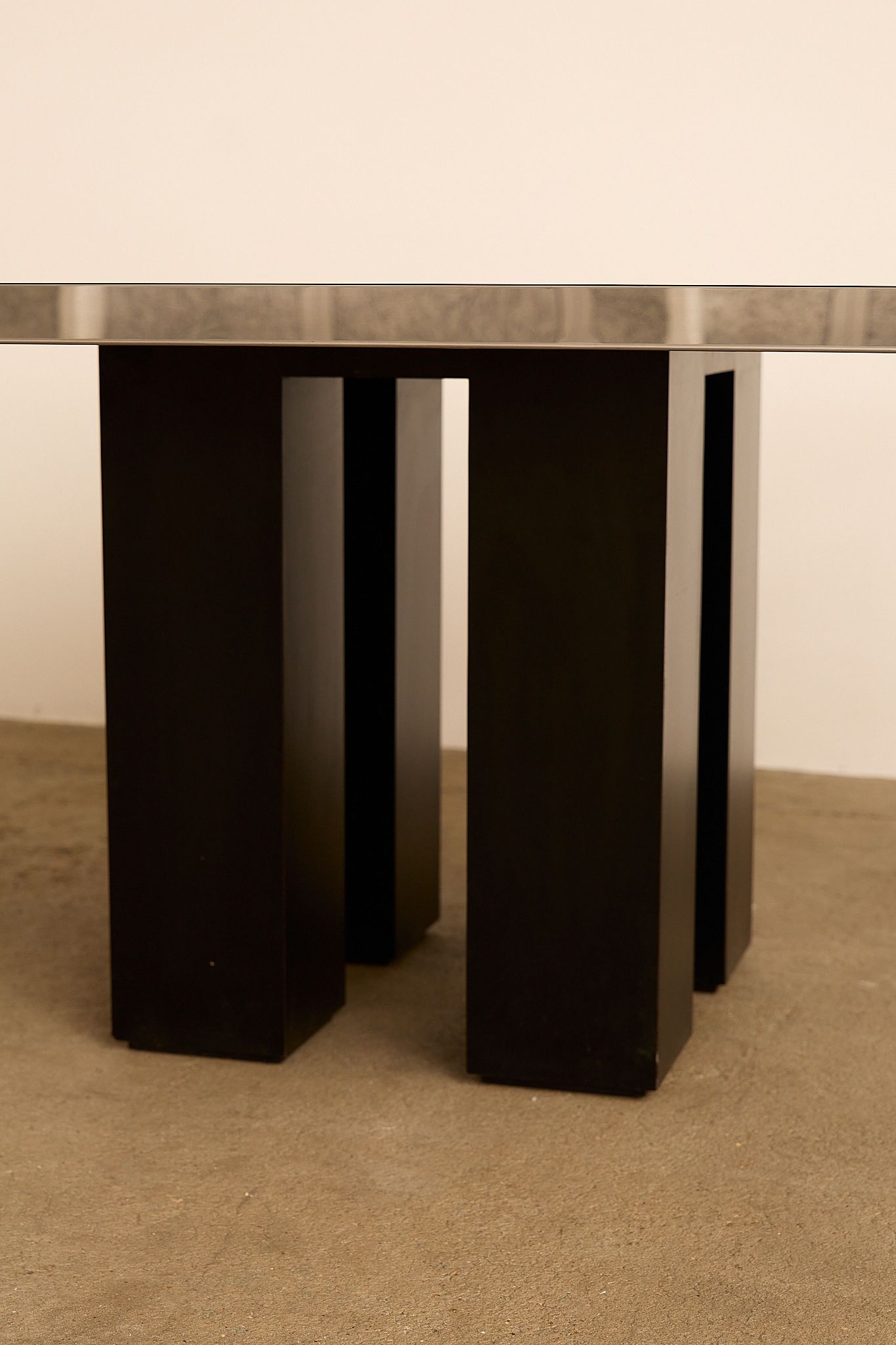 Striking Italian dining table from the 1970s featuring a smoked glass top framed in polished chrome. The sculptural base consists of four black lacquered pillars, giving the piece a strong architectural presence. Please note - a new glass top will be ordered upon purchase