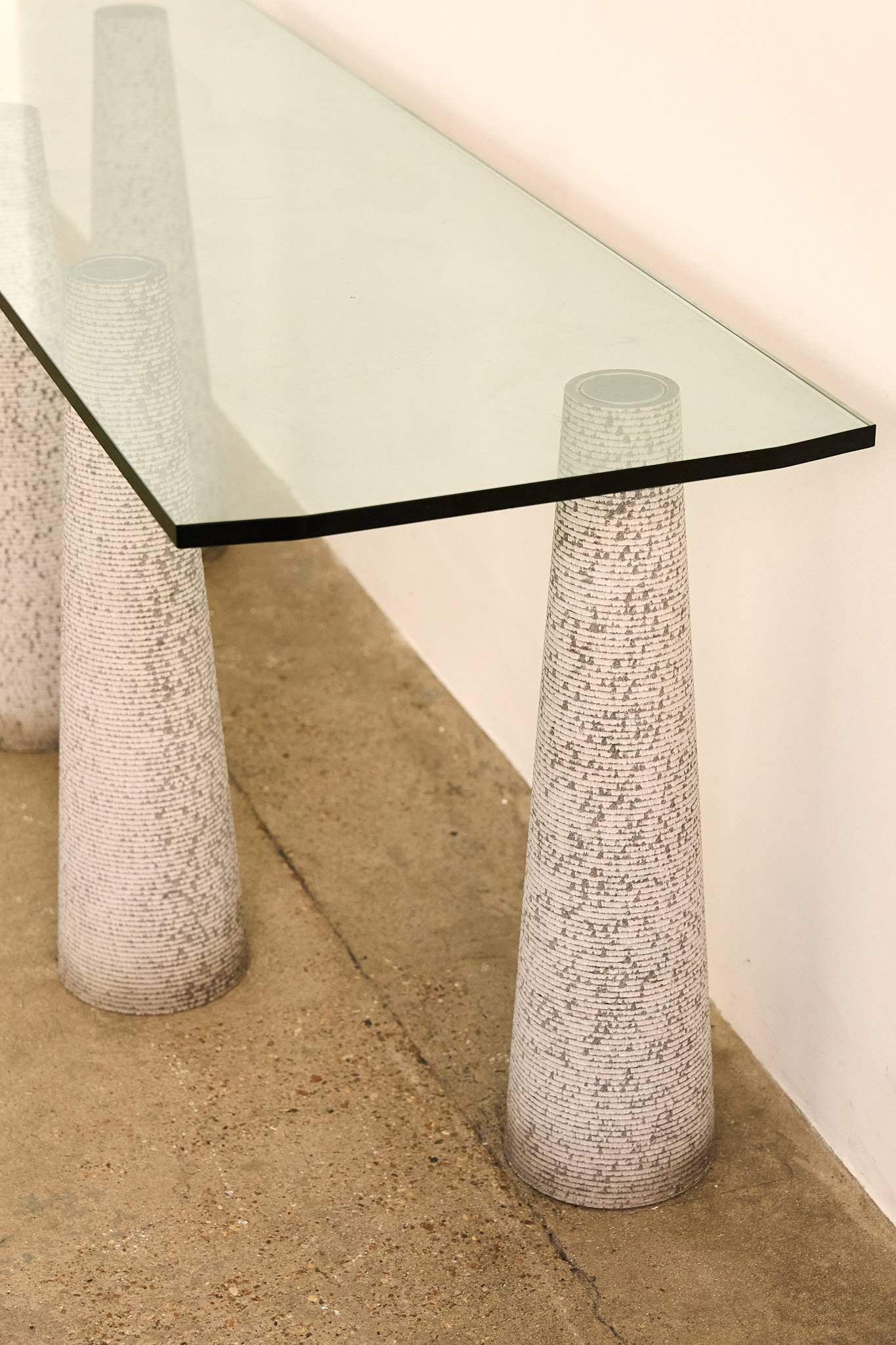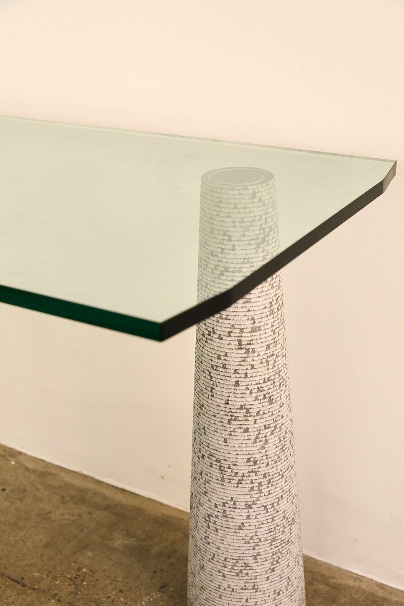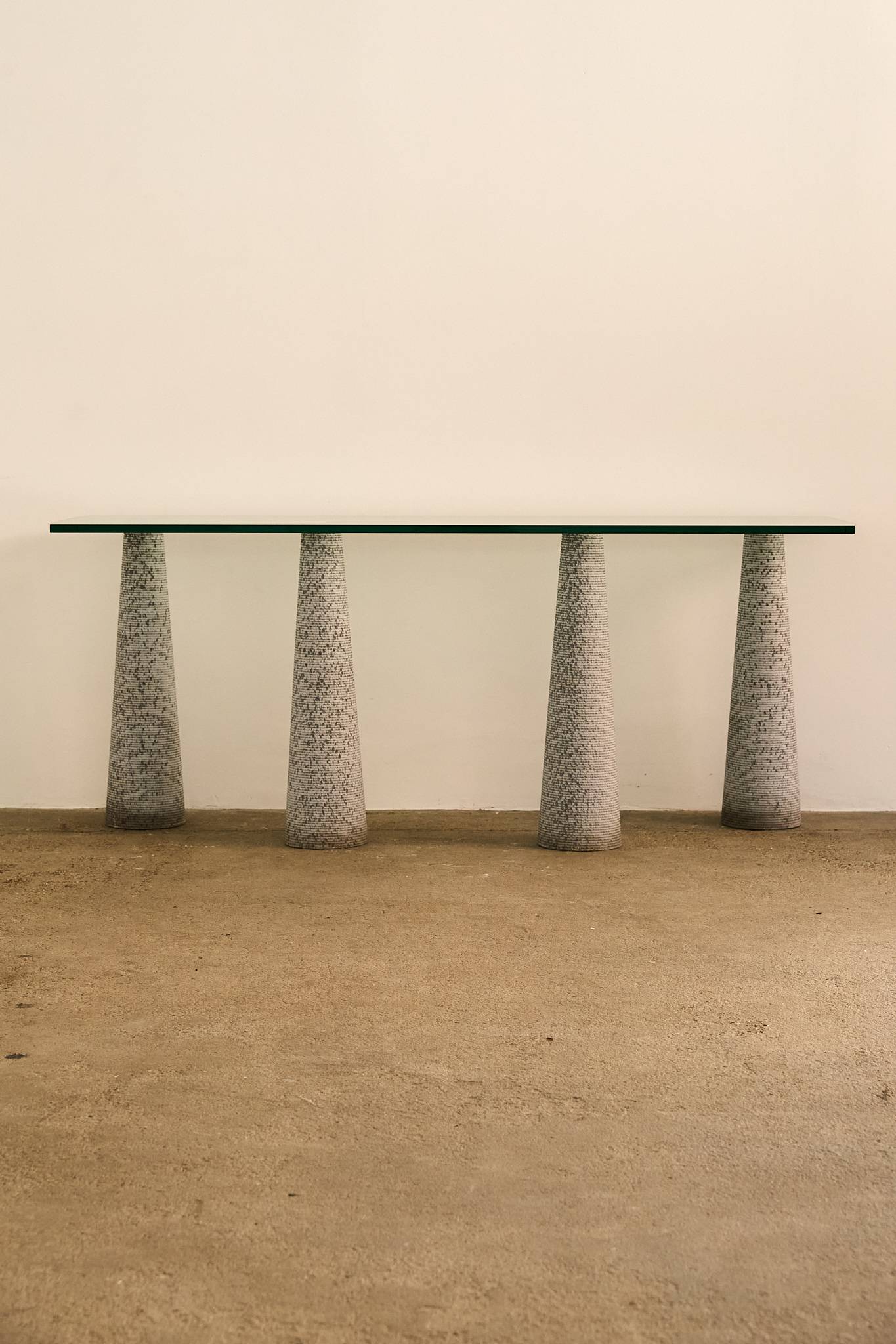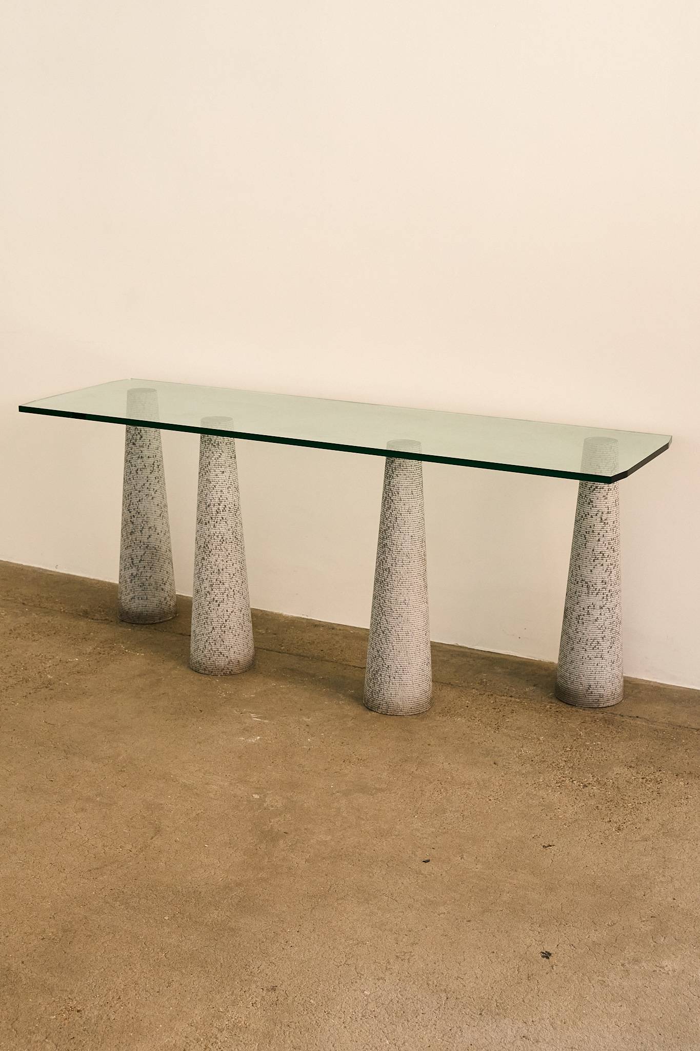 Striking console table by Luigi Lazzotti, featuring four sculptural conical bases in textured grey stoneware supporting a thick rectangular glass top. The tapering forms are rhythmically arranged, giving the piece both balance and monumentality. A refined example of Italian postmodern design, Lazzotti’s work here combines architectural rigor with artisanal surface detail, resulting in a piece that is at once minimalist and expressive.