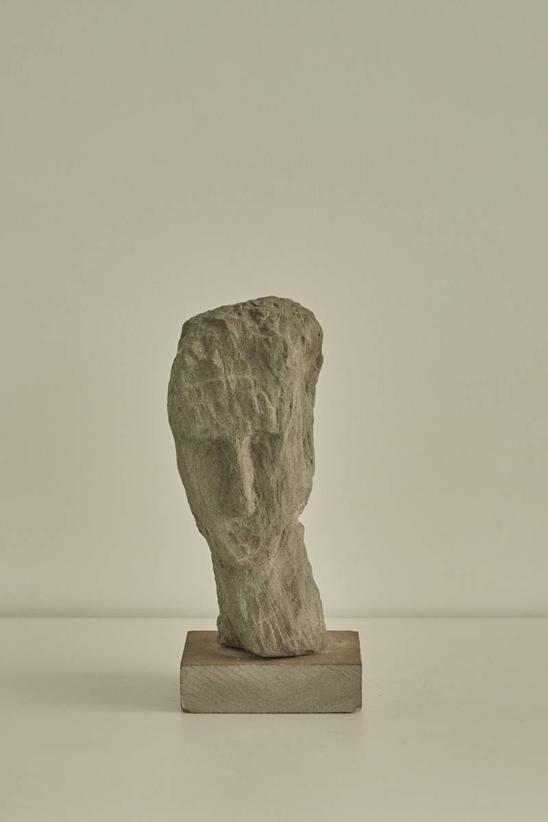 This is a sculptural piece by Italian artist Aldo Nava. The work features a rough-hewn stone or stone-like material carved into a minimalist, abstract representation of a human head. Its textured surface highlights the rawness of the material, while the simplified facial features evoke a primal and timeless quality. The sculpture is mounted on a square wooden base, giving it a grounded and sturdy presence.
