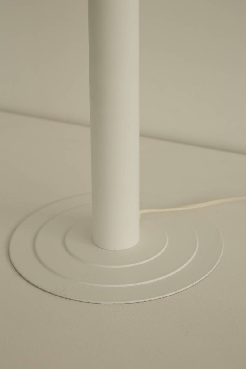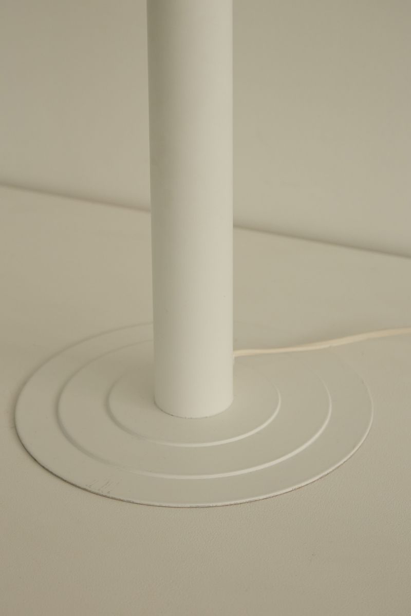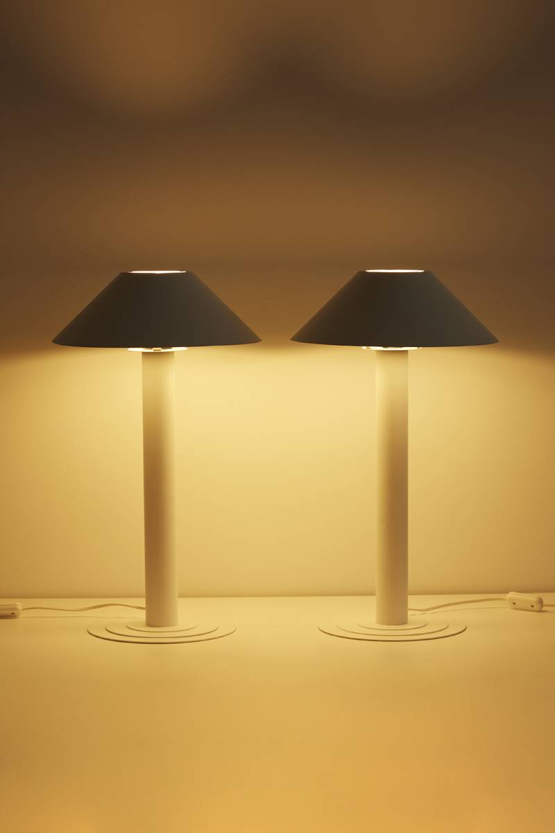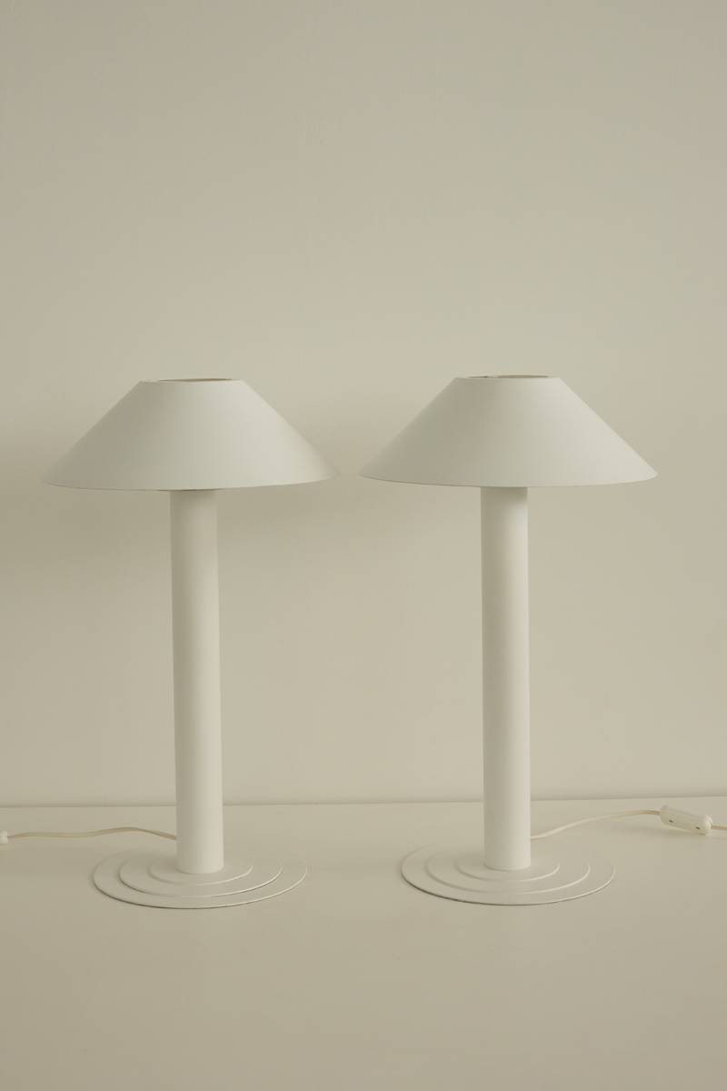 Pair of elegantly simple white table lamps. Featuring white lacquered metal cylindrical stems, conical shades, and sleek contoured bases. Price is for the pair.