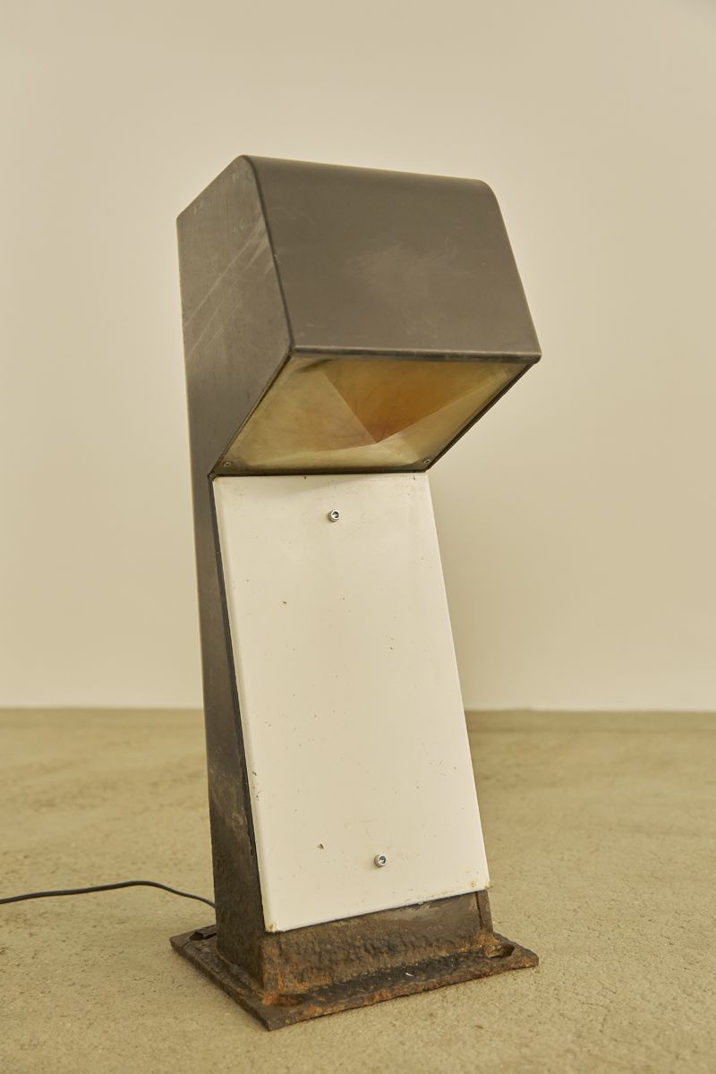 The structure is made of black lacquered folded steel housing a glass diffuser, resting on a square base