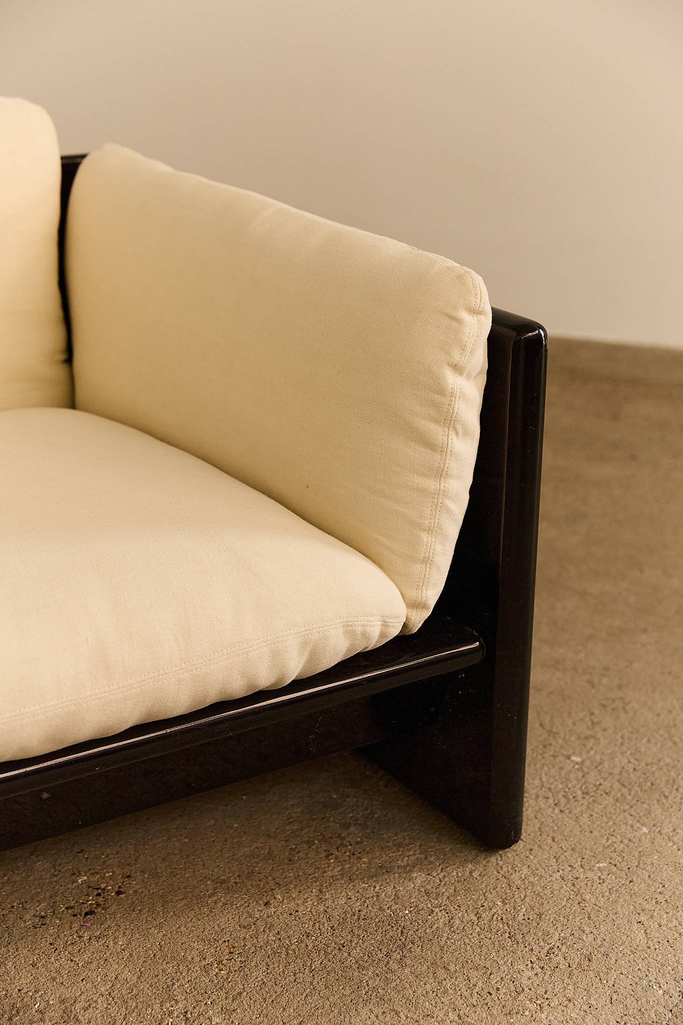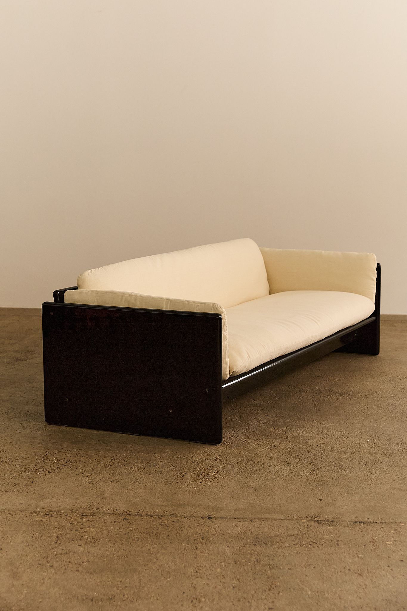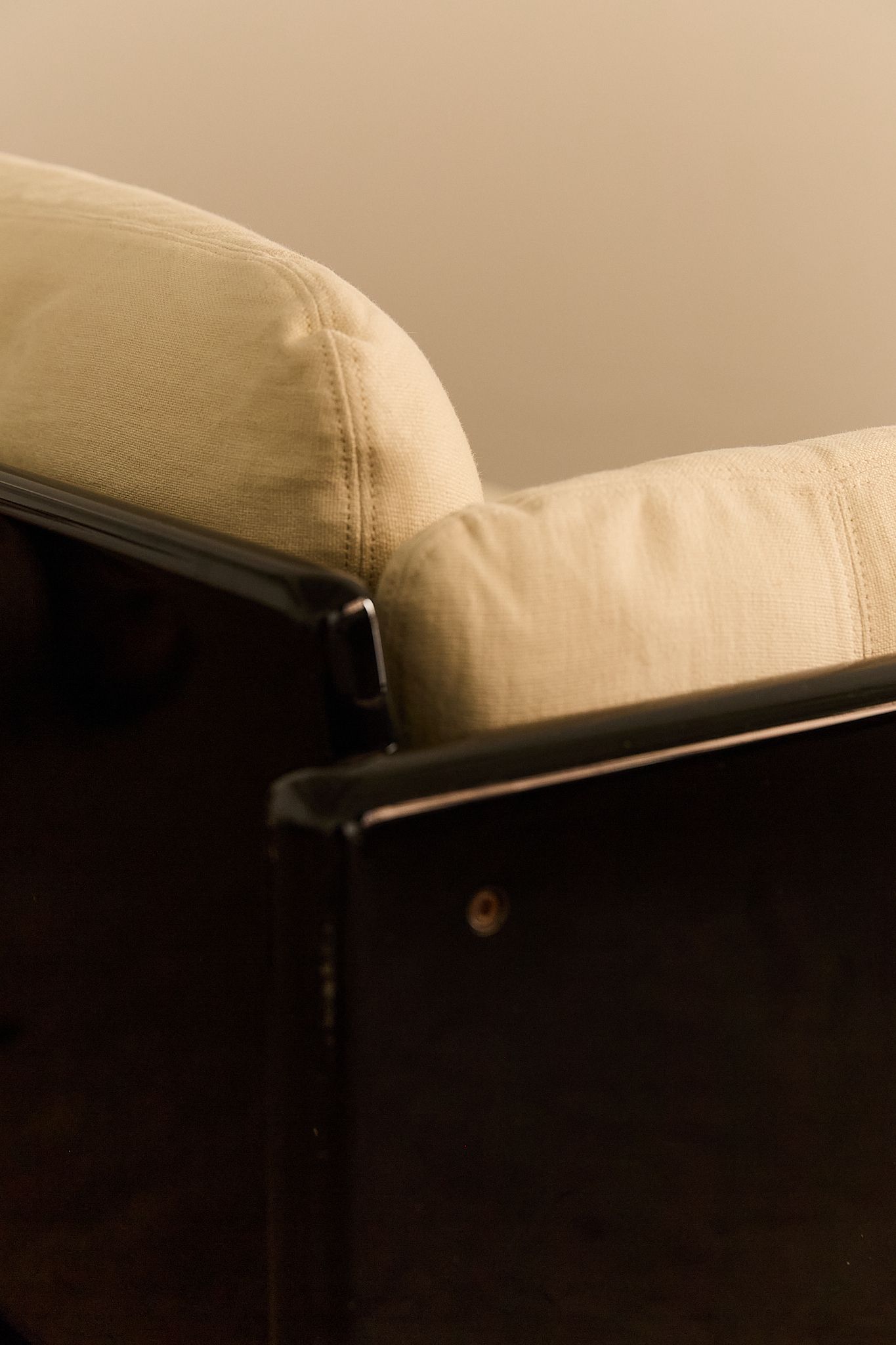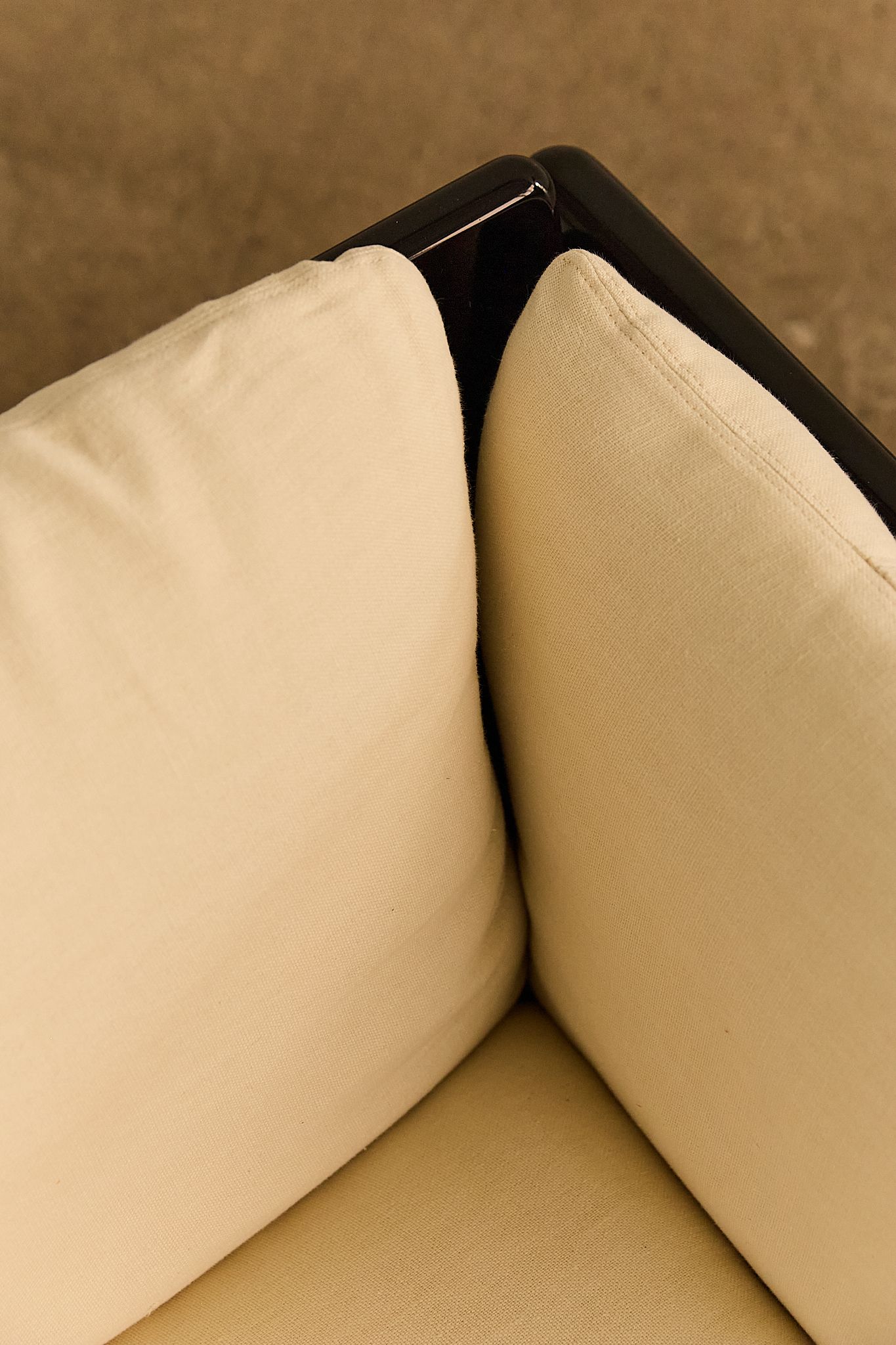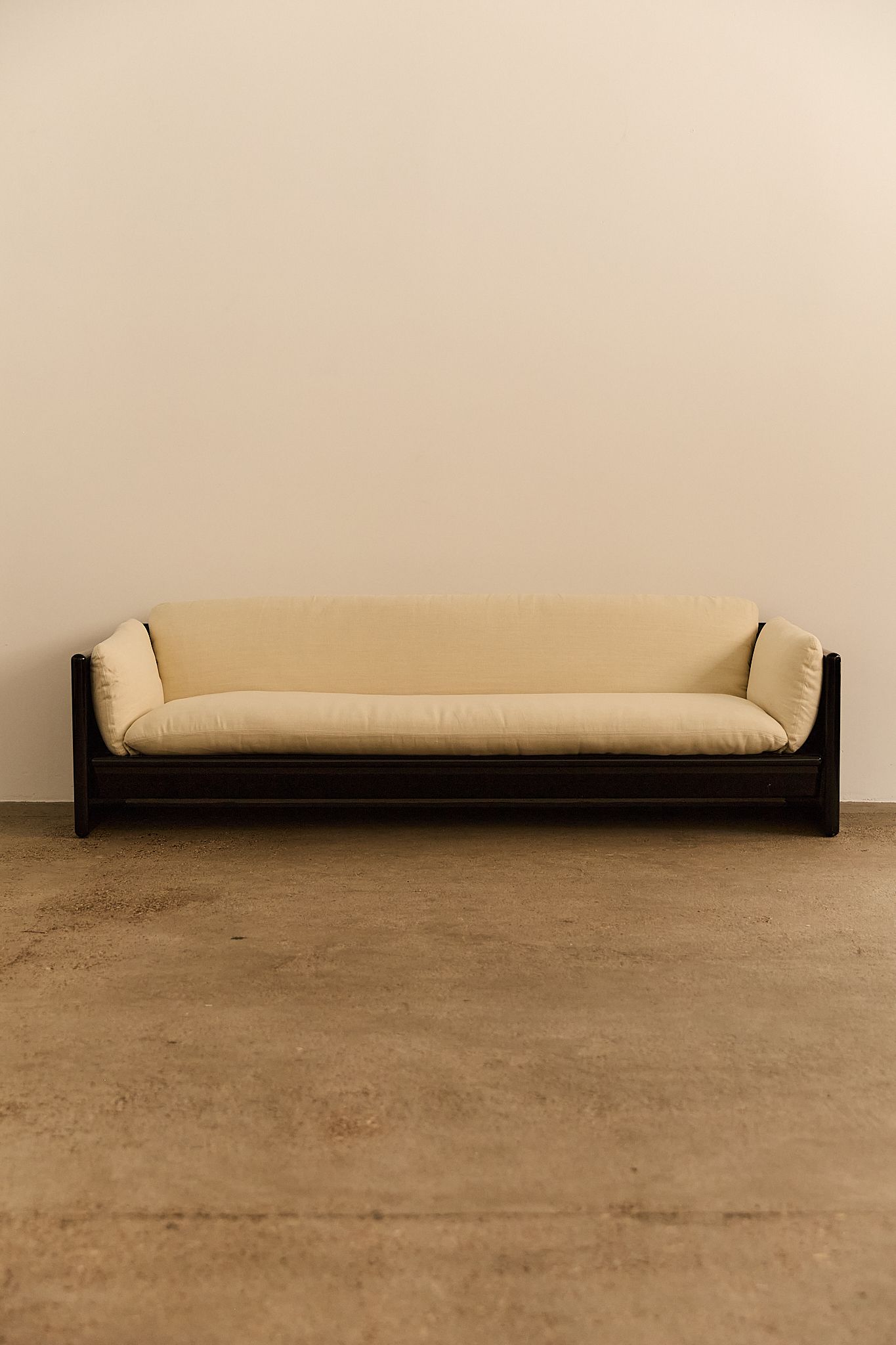 A sculptural 3-seater sofa designed by Kazuhide Takahama for Studio Simon (later re-named Gavina) in the 1970s. The frame is formed from lacquered black wood with Takahama’s simple but robust forms giving its structure punctuation. Newly upholstered in soft Italian linen, the plush cushions offer a fresh contrast to the rigid, minimal structure.