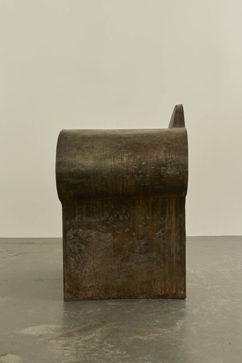 An extraordinary Italian artist’s chair, reminiscent of Ron Arad’s works. Crafted from metal sheets welded together to create a bulbous and lightweight hollow armchair with exaggerated proportions.