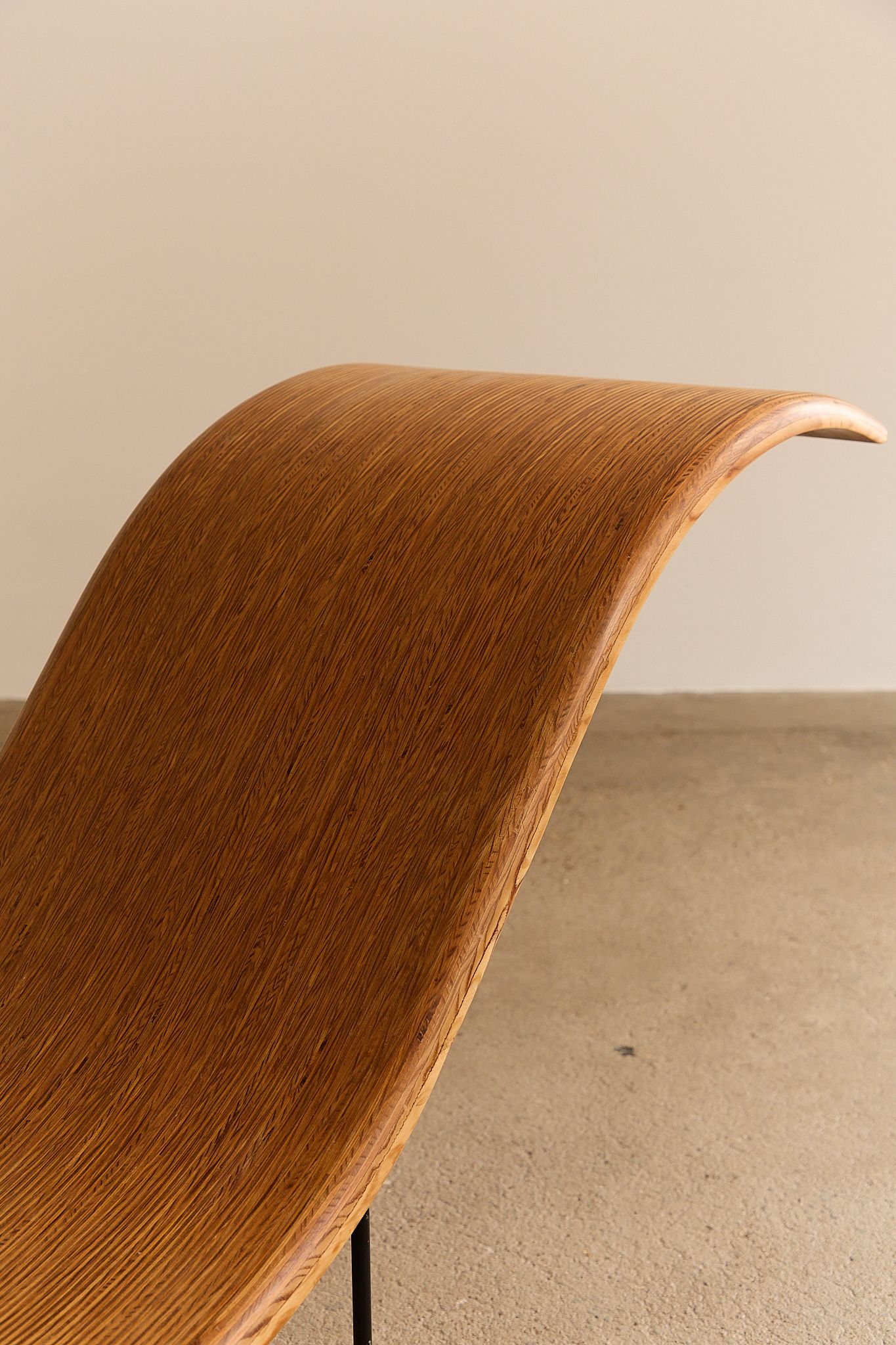 A striking lounge chair designed by German multi-media artist Tiller Lesser in 1990. This rare piece exemplifies the distinctive aesthetics of his work from that period, featuring an elegantly curved, stack-laminated wooden seat that appears to float on a minimal black metal frame.