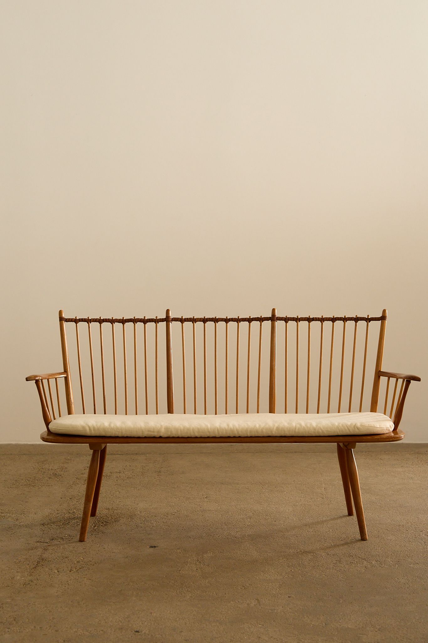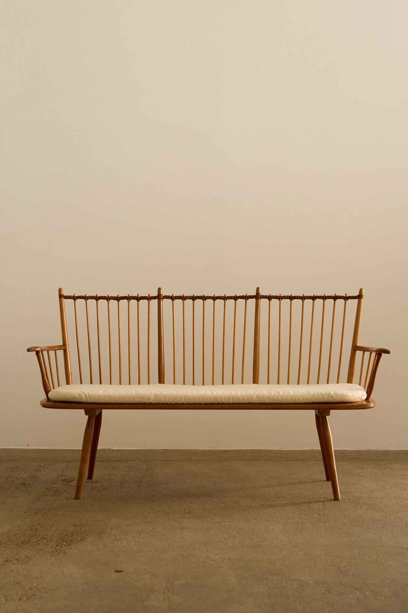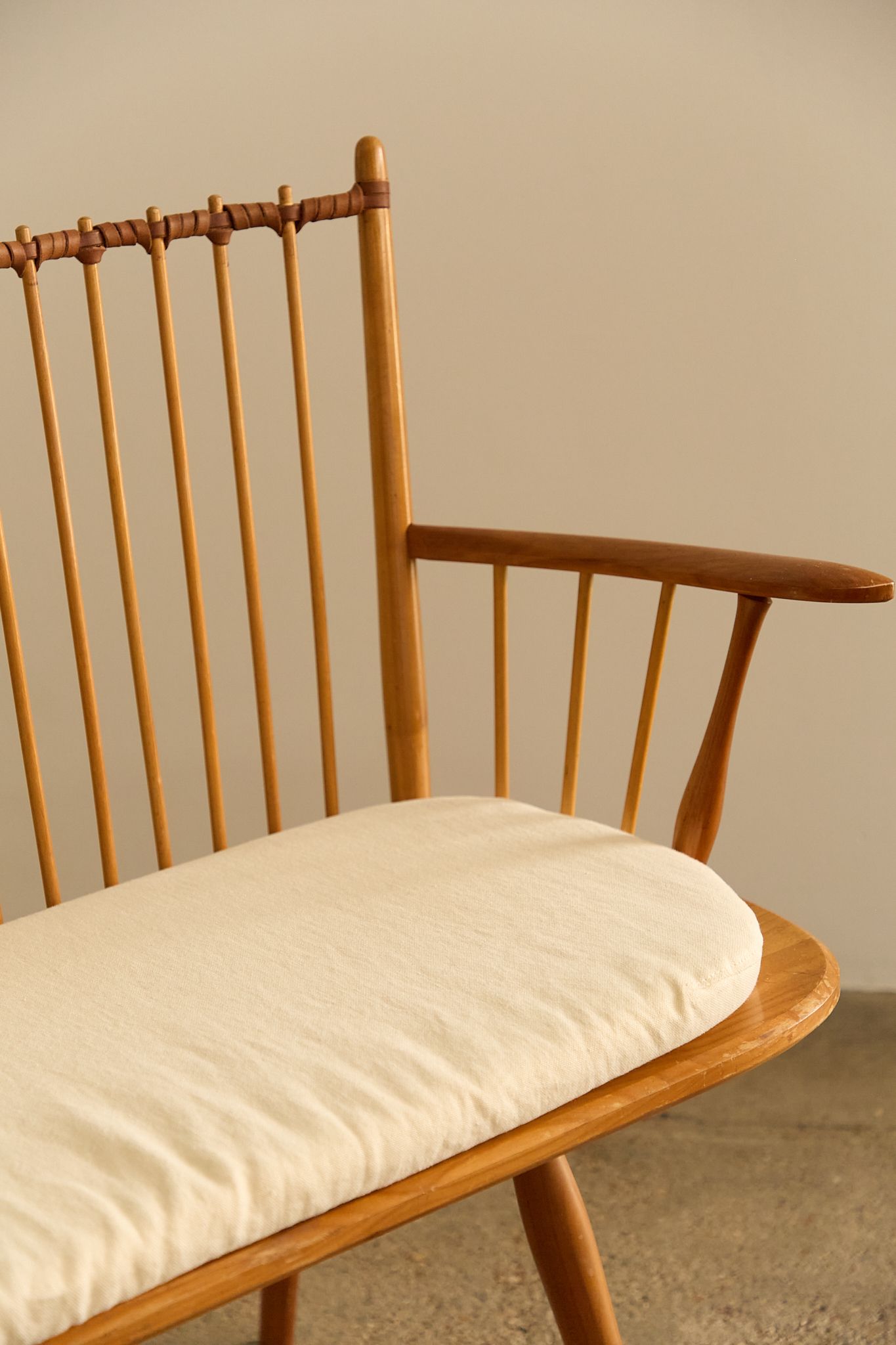 Very rare 1950s bench crafted from solid cherry wood, designed by Albert Haberer for Fleiner. The backrest features spindles secured with leather straps, providing both strength and flexibility. A fine example of German craftsmanship. The seat has been newly reupholstered in linen.
