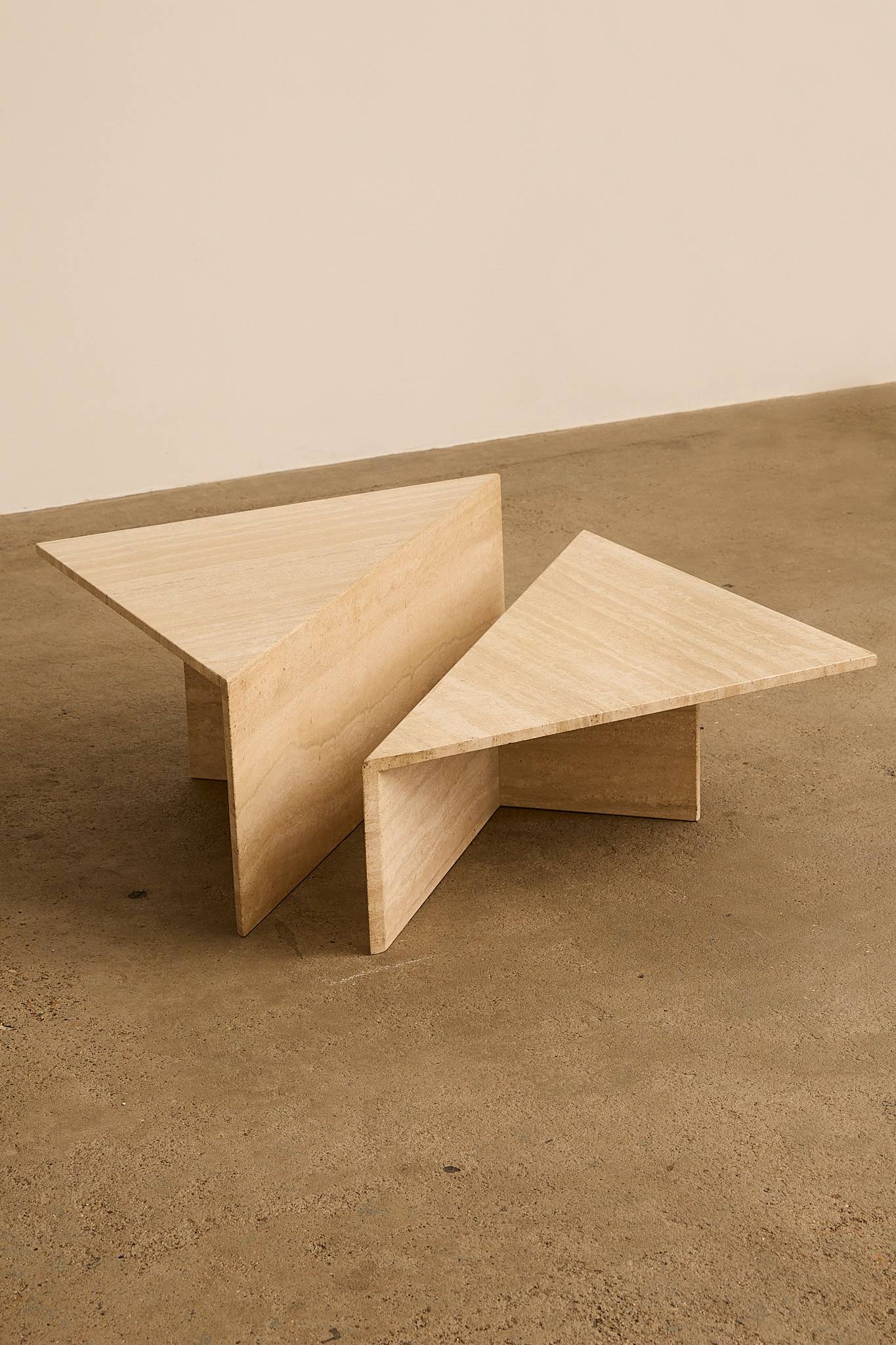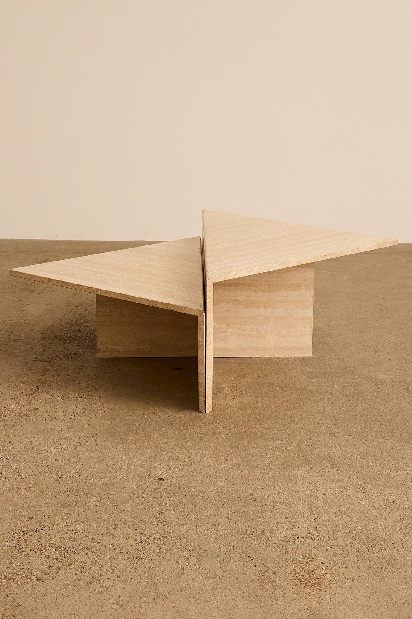 A striking 1970s Italian travertine triangle coffee table by Up&Up, featuring bold geometric design and natural stone texture.