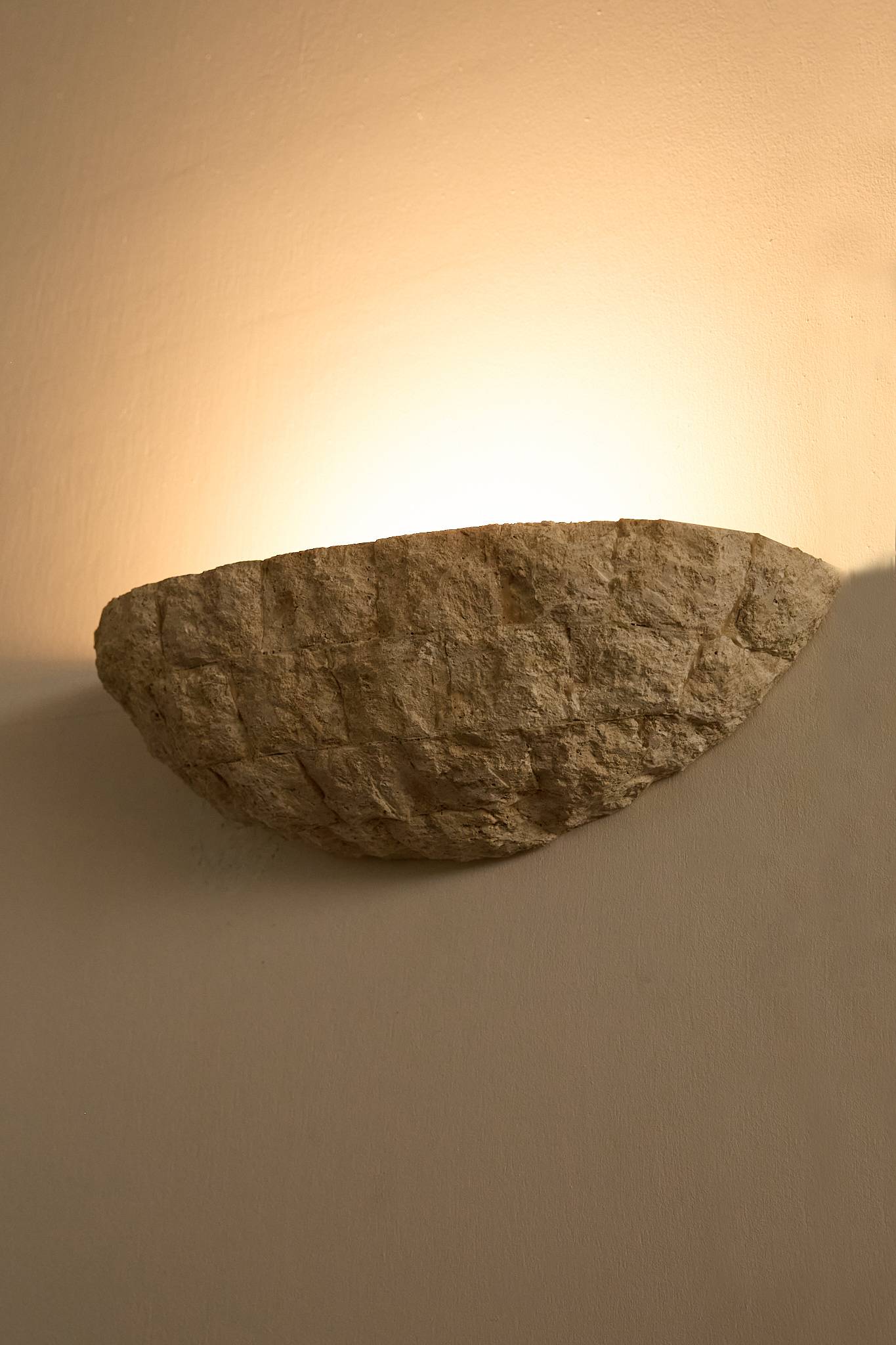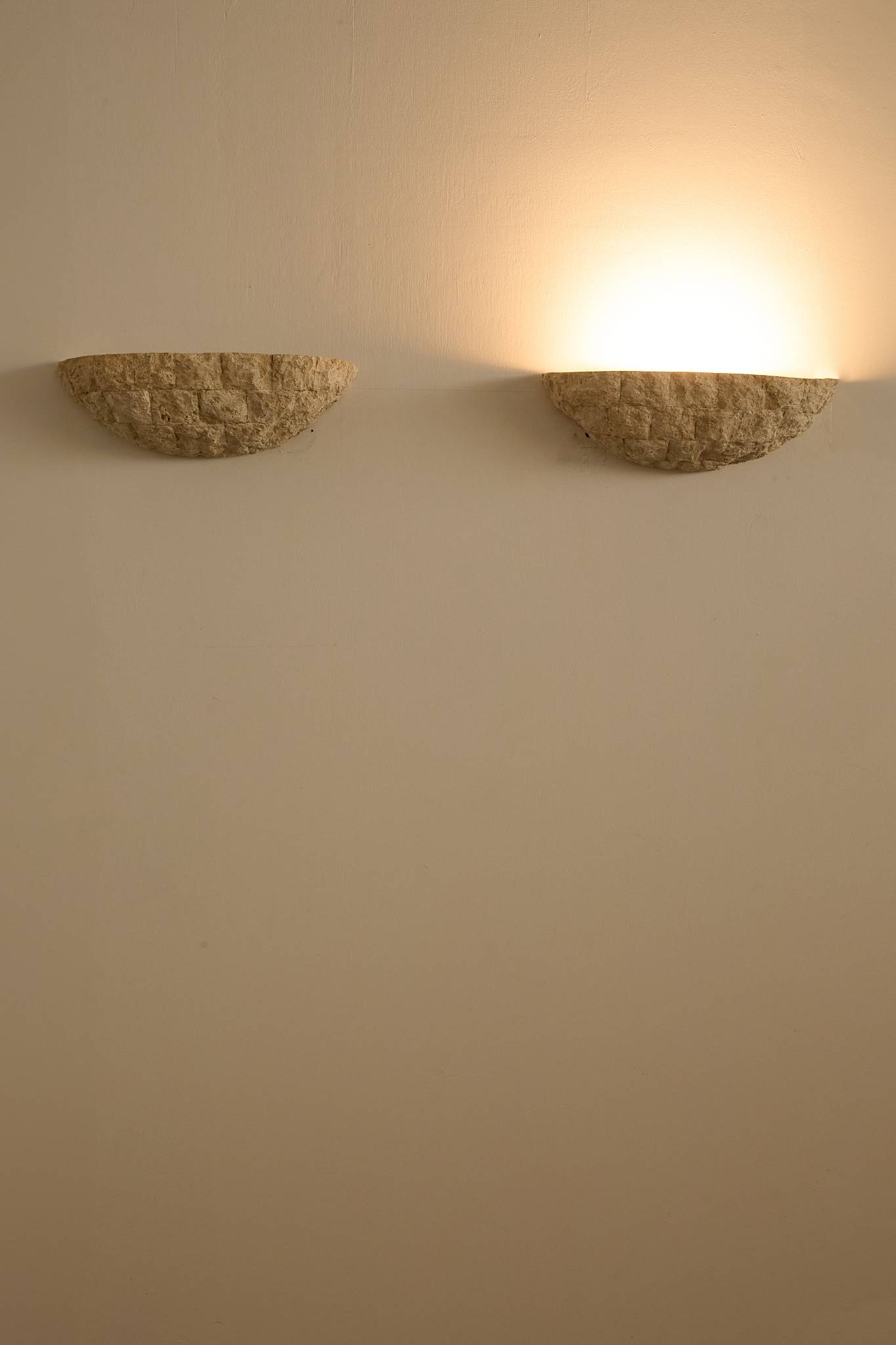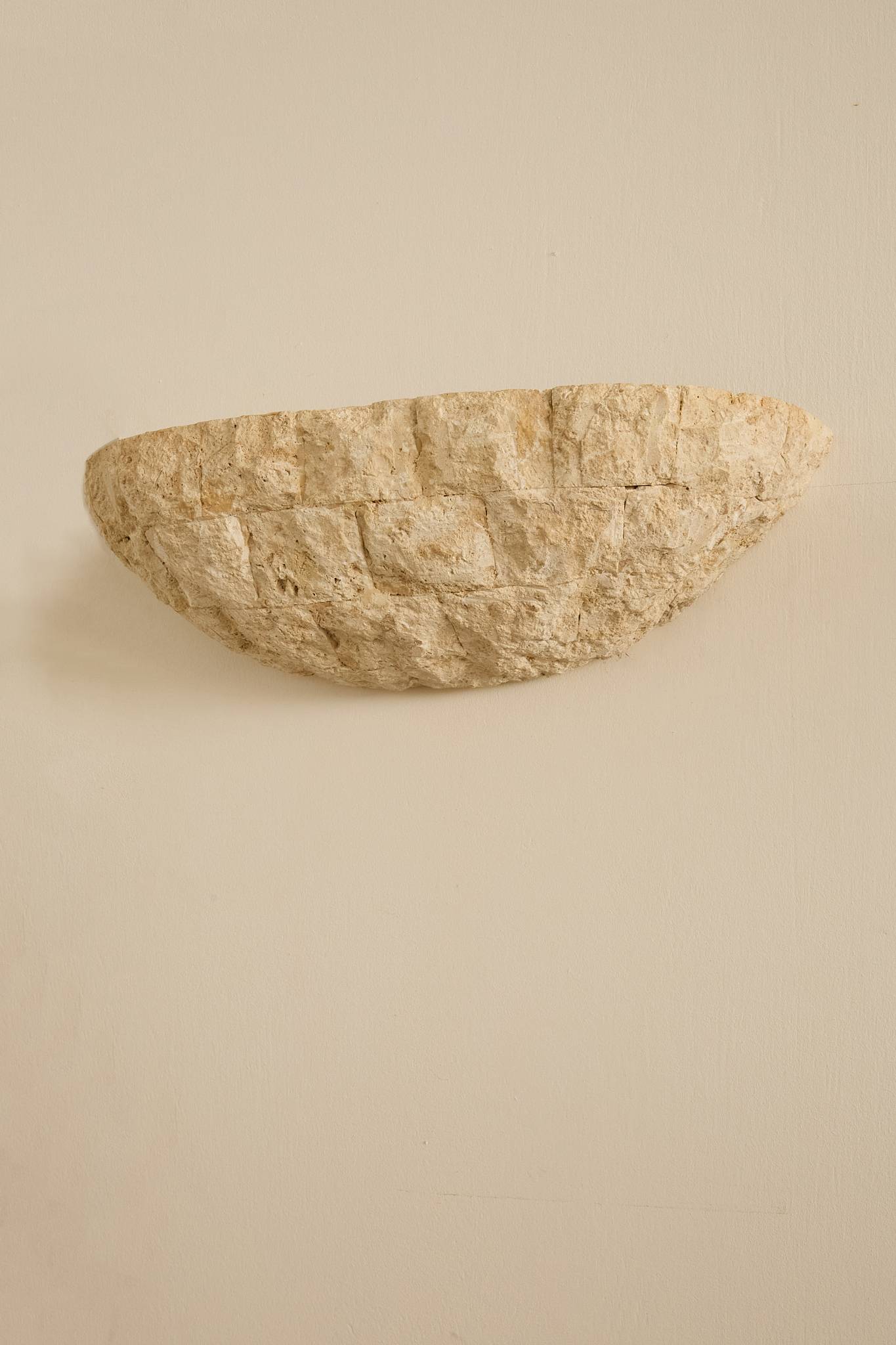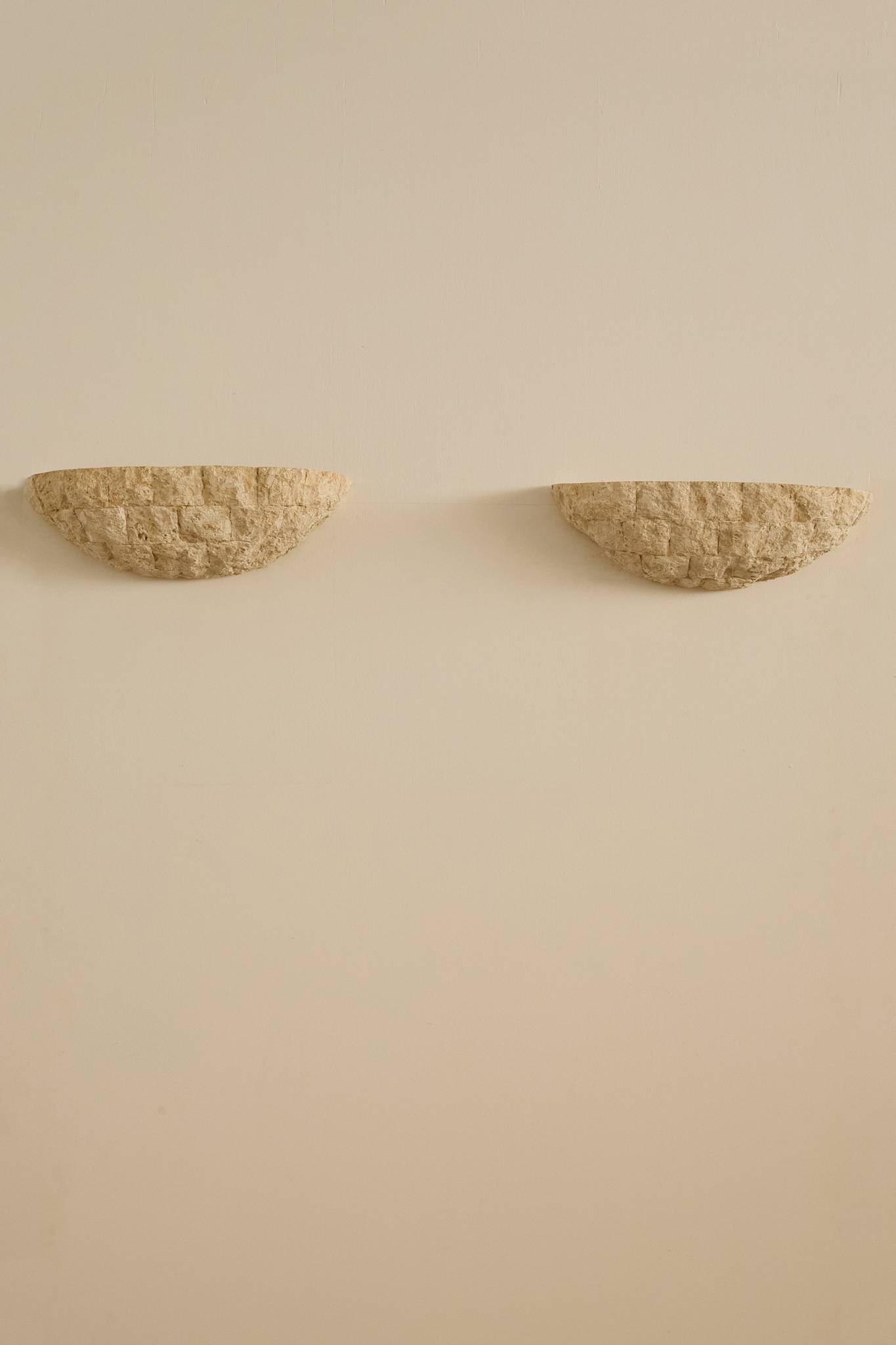 Handcrafted in textured stone, these sculptural half-moon sconces cast a warm, indirect glow. Their organic, rough-hewn surface evokes the character of traditional French masonry, while the simple geometric form gives them a timeless, architectural presence. Price is for the pair.