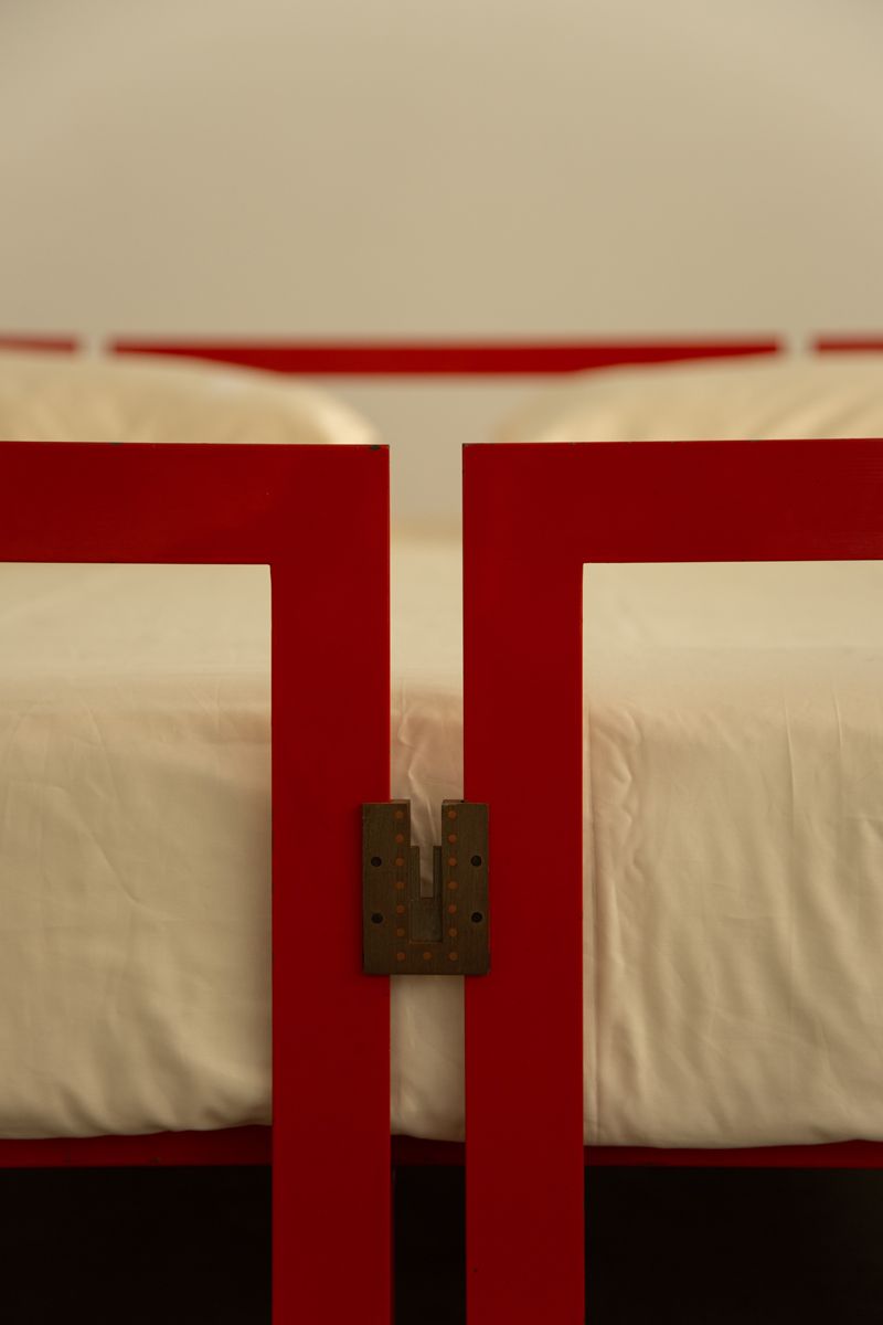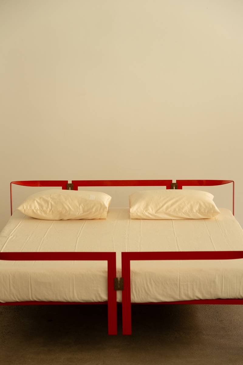 Striking bed design featuring a powder-lacquered metal frame in bold China red. The structure includes a matching headboard and footrest, with the support frame and base constructed from tubular metal. Stainless steel linking elements add a refined, decorative touch to the geometric composition.