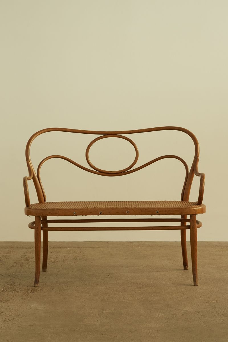 Austrian antique wooden two-seater bench by Thonet, early 1900s. This elegant bench features a handmade Vienna straw seat, curved wooden backrest, armrests, and round-section legs. Crafted by Thonet in the early 20th century, its timeless silhouette combines simplicity with comfort.